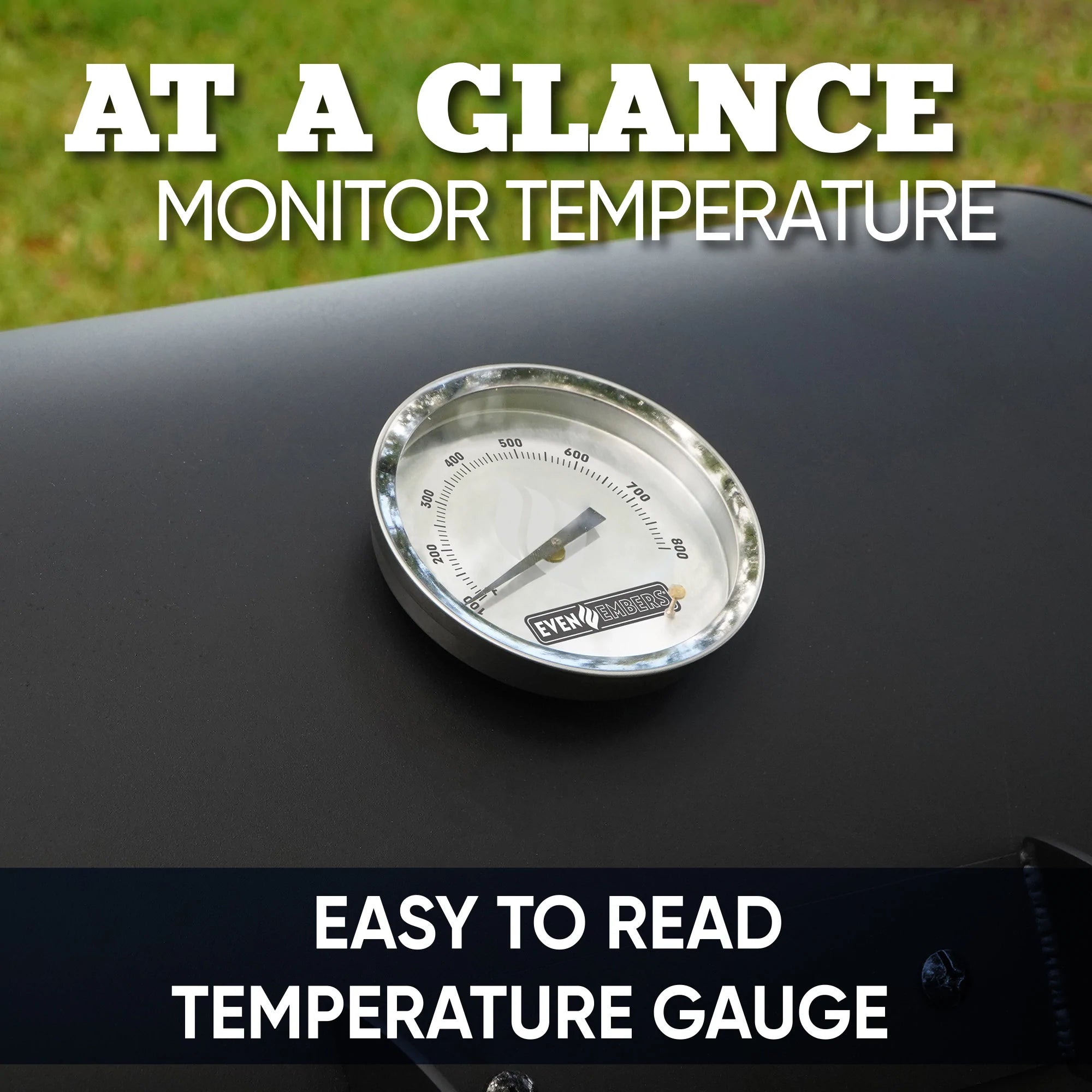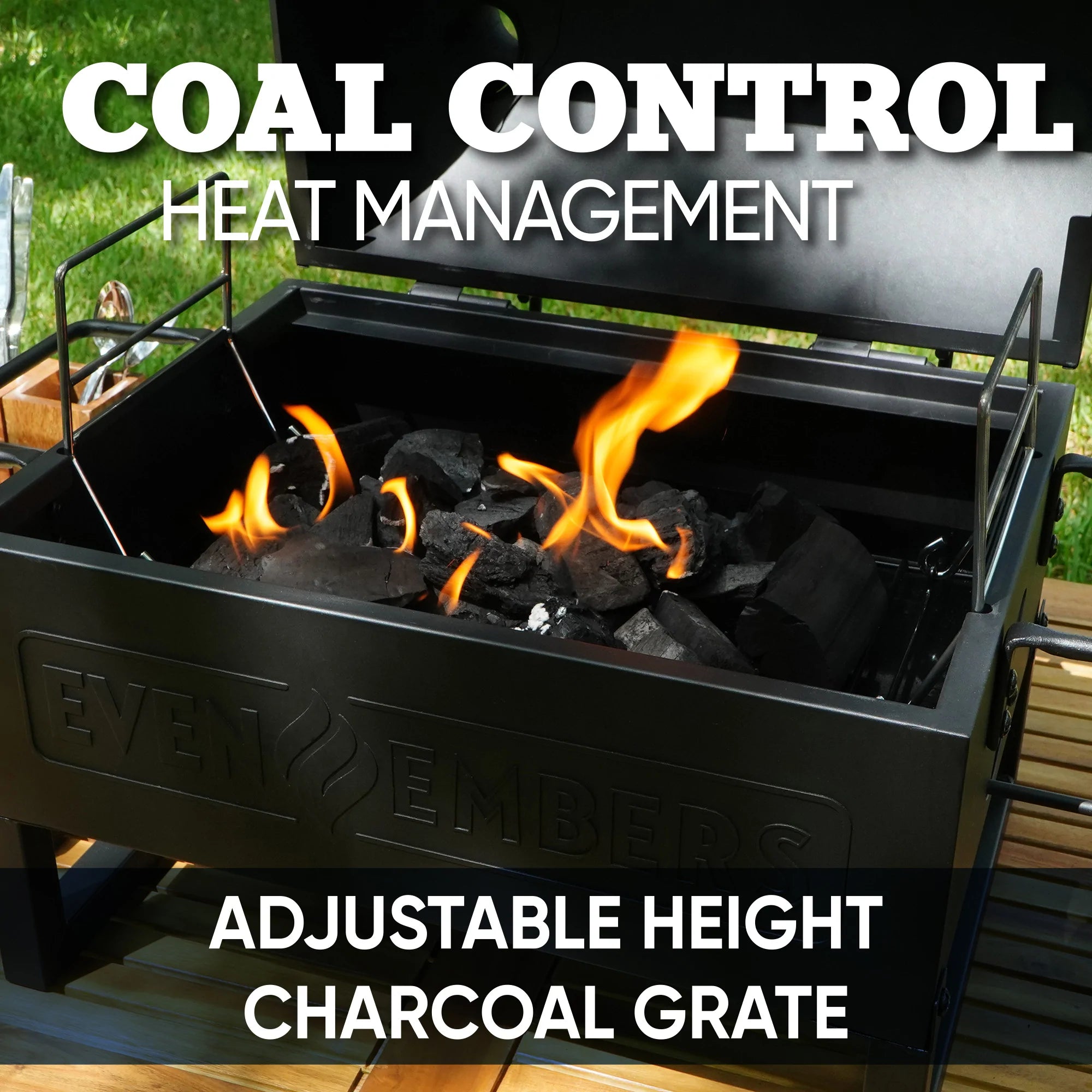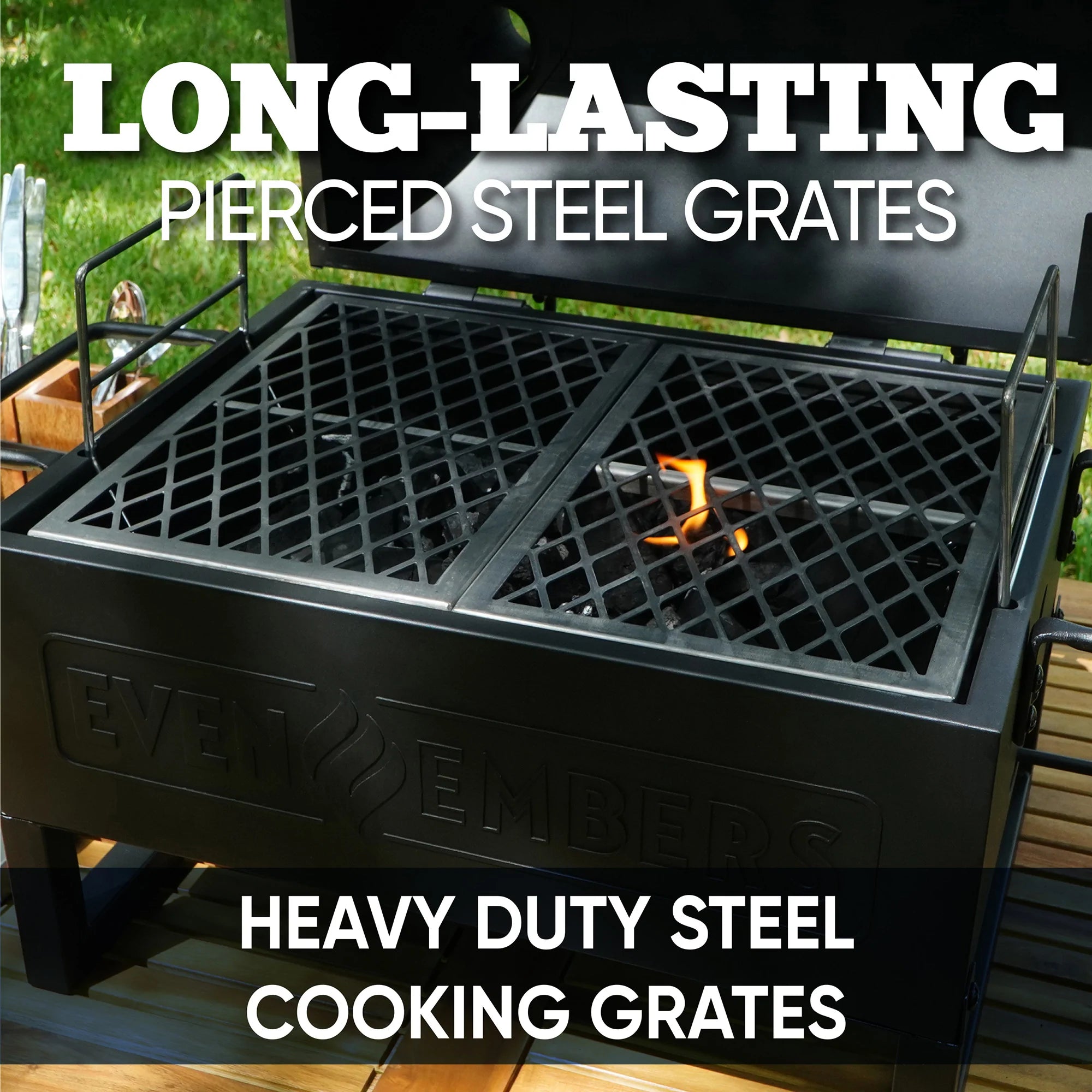 Compact, yet mighty, the Even Embers Tabletop Charcoal Grill offers 214 square inches of cooking space on heavy-duty pierced steel cooking grates. Cooking heat is in your control with an adjustable height charcoal grate, accessible air vent and easy to read temperature gauge. Side handles for portability make this Even Embers tabletop grill perfect for picnics on the go, camping, or backyard get-togethers.