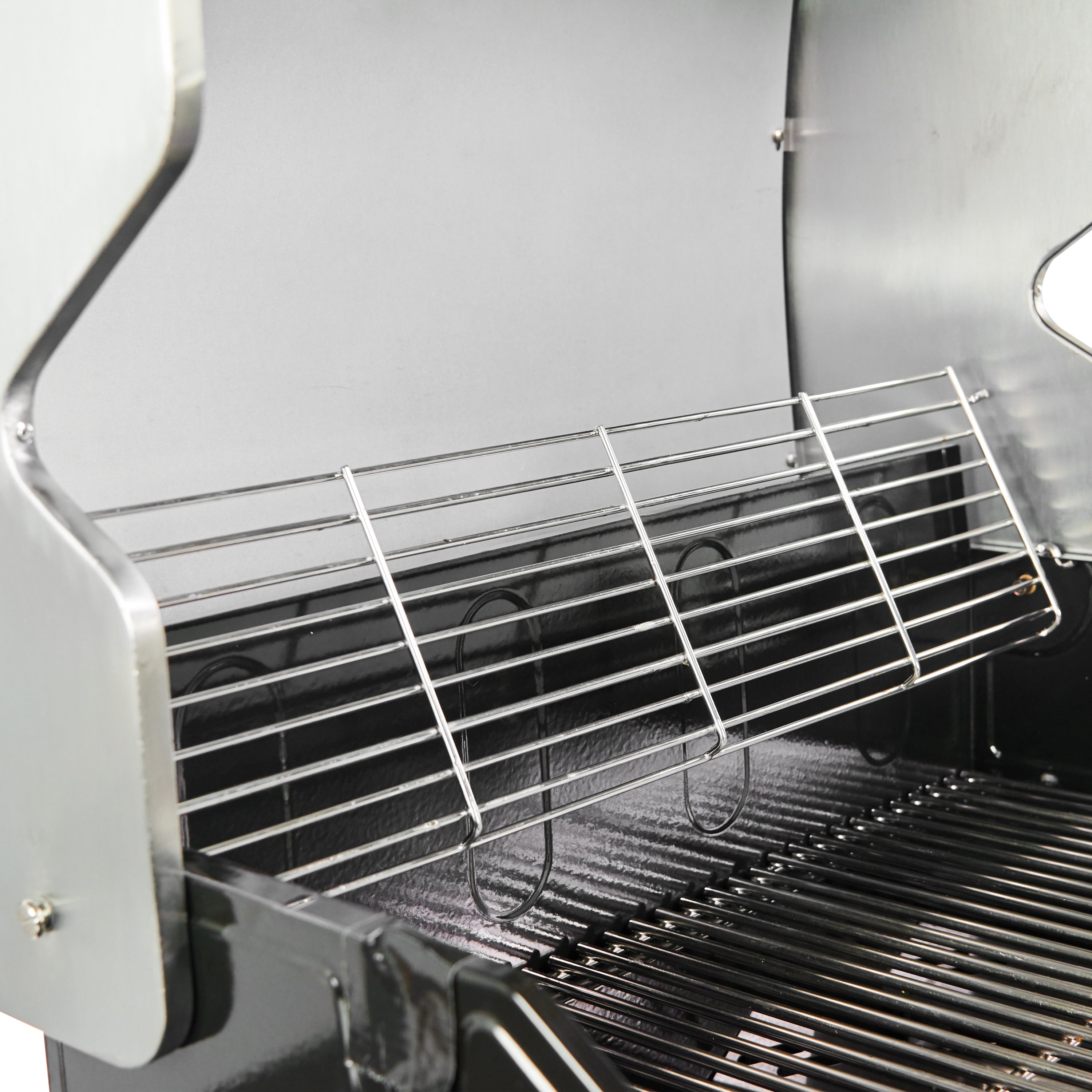 - Cooking Area: Primary cooking area is 455 square inches, Secondary cooking area is 151 square inches, Total cooking area is 606 square inches. Featuring durable stainless-steel cooking grates and flip-up warming rack.