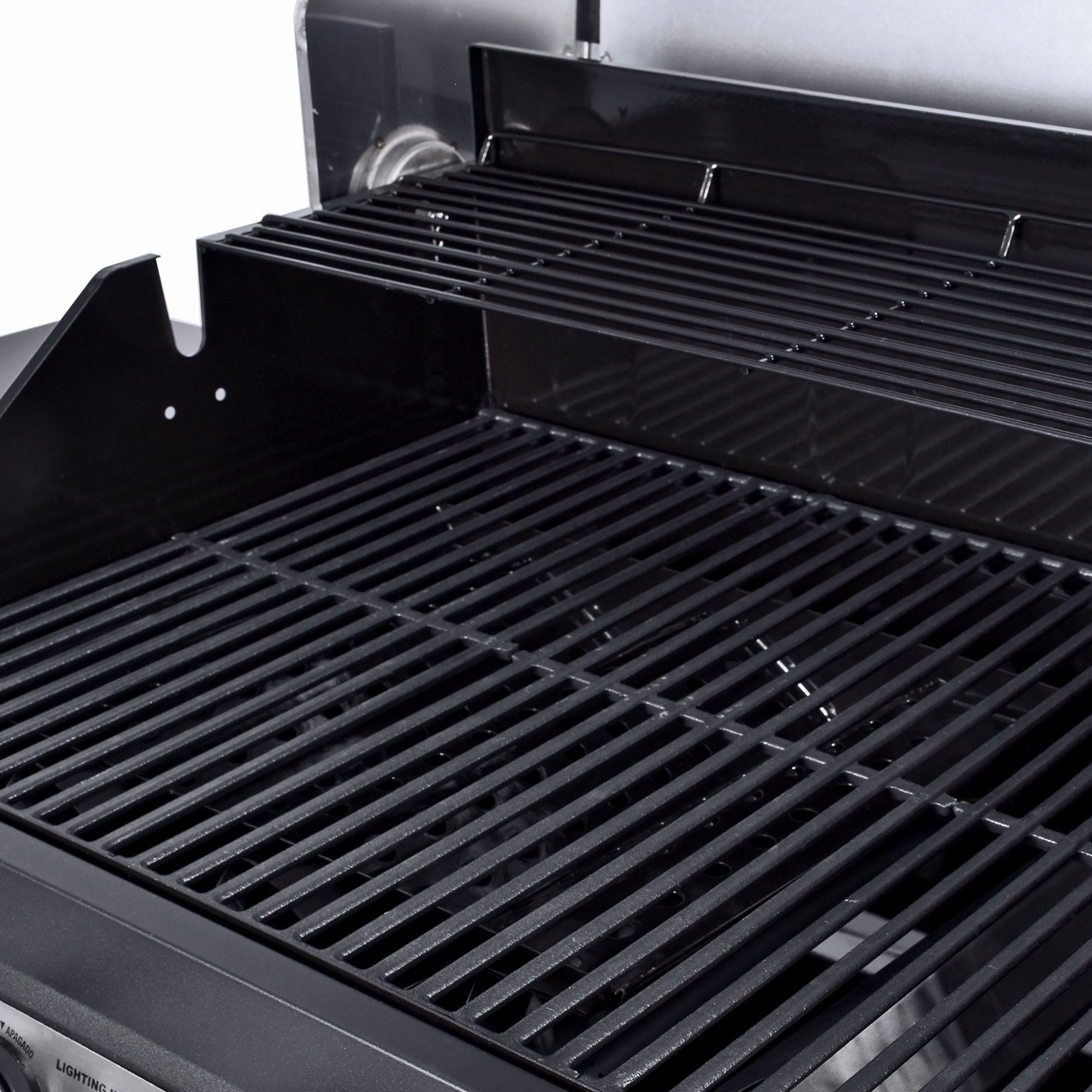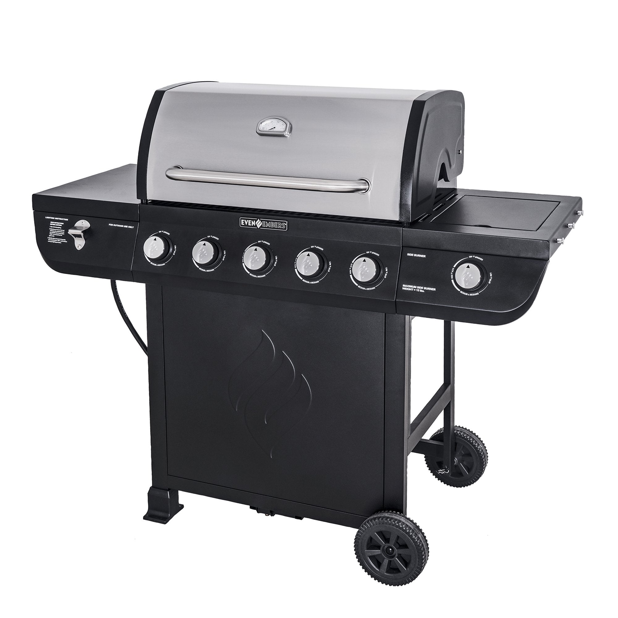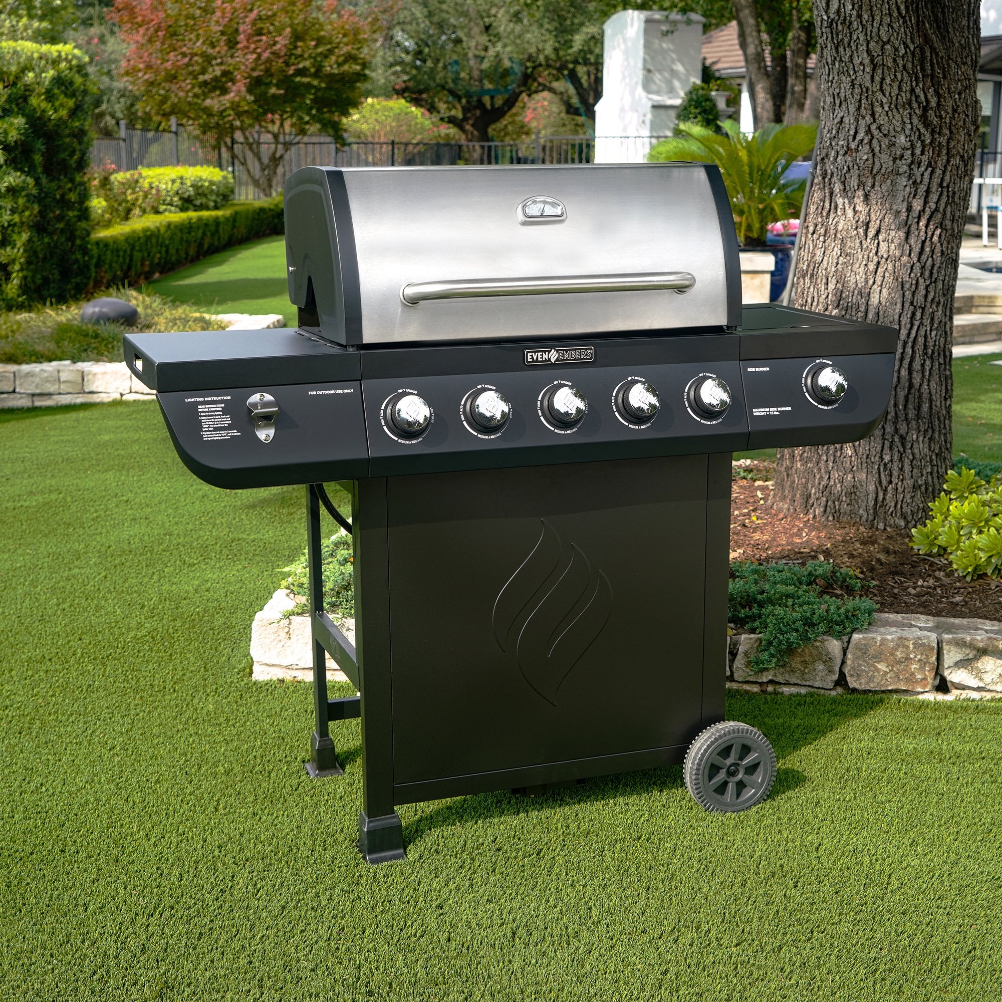 Built to last, The Even Embers GAS7540BS Even Embers Five-Burner Gas Grill is perfect for the daily griller. Equipped with a fully welded lid, independent ignition, and porcelain-coated cast-iron cooking grates, this versatile Even Embers grill includes plastic wheels for easy movement. Complete with 715 sq. in. of cooking space, this gas grill is a must for your next BBQ. Enjoy quality meals when you cook with this outdoor grill!