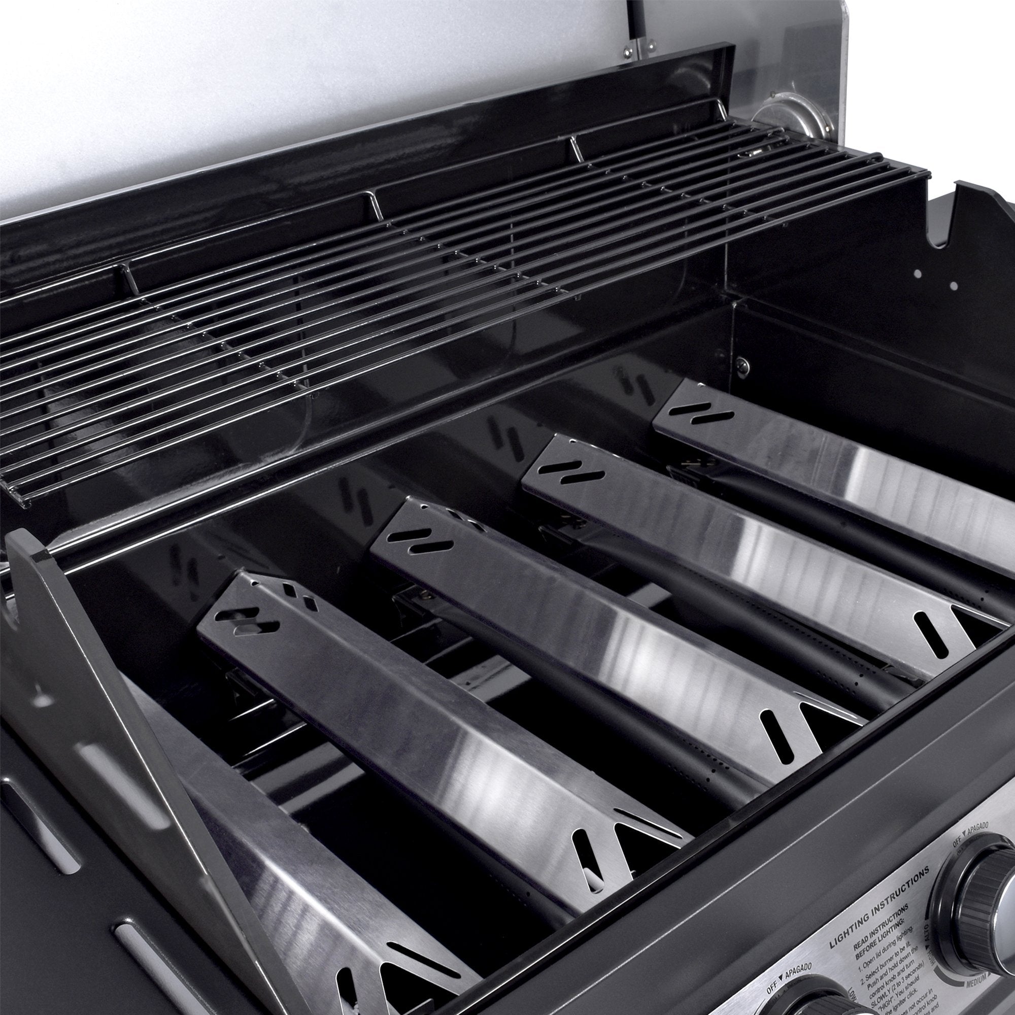 • 5 ceramic-coated stainless steel 9,600 BTU main burners furnish uniform heat for even cooking; 12,000 BTU side burner offers the ability to whip up a quick side dish