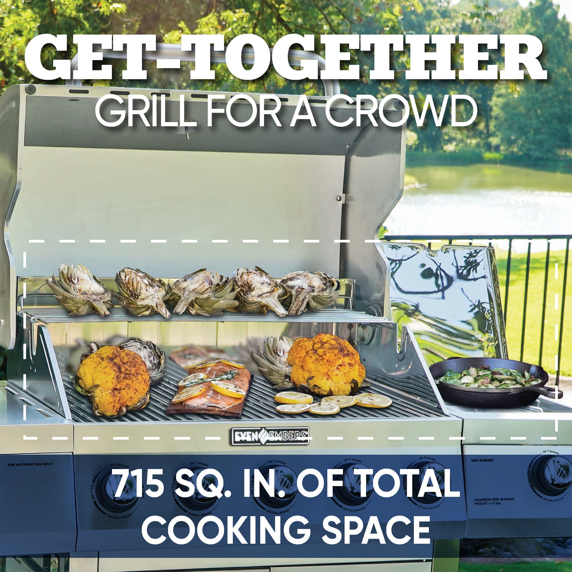 The Even Embers Five Burner Stainless Steel Gas Grill is built out of stainless steel material offering 715 sq. in. of total cooking surface for plenty of grilling space. It is equipped with solid stainless steel cooking grates that retain heat exceptionally well. Perched above the 5-ceramic-coated stainless steel burners are stainless steel heat tents that distribute heat evenly across the entire cooking surface. Integrated ignition on every burner allows burners to fire up instantly and the built-in thermometer enables precise temperature regulation. 4 locking casters make this grill easy to move around.