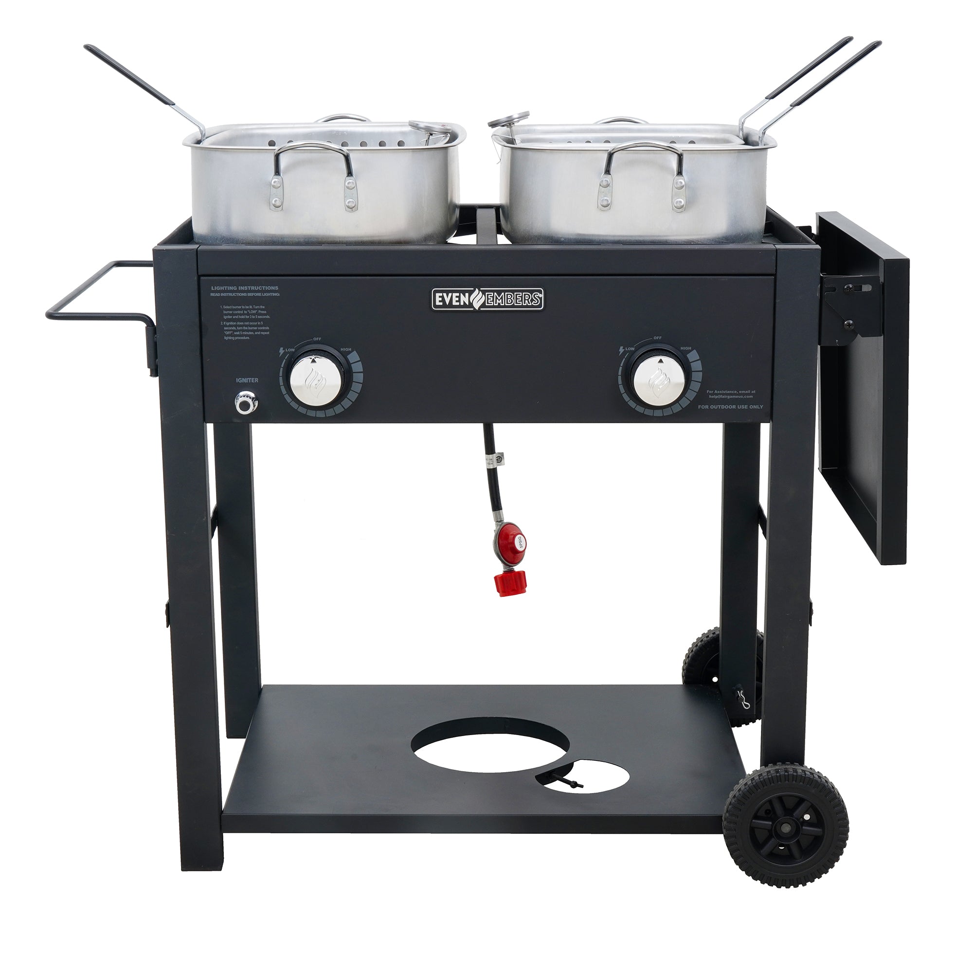 Built tough for outdoor cooking enthusiasts, the Even Embers 2-Burner Fryer Cart delivers powerful, professional-grade performance for all your frying favorites. With two 14 QT. aluminum frying pots and three frying baskets, you can easily fry up everything from wings to seafood with precision and speed. Dual burners with adjustable temperature control knobs produce an impressive 100,000 BTUs of heat, while the electronic ignition ensures quick and reliable startup every time. Equipped with two stainless steel thermometers, easily maintain accurate heat levels across both pots. Basket hangers and heat-resistant handles make handling food safe and easy, while the folding side shelf offers extra prep or storage space when you need it. Mounted on a rugged steel cart with two durable wheels, this fryer cart combines professional-grade performance with backyard-ready convenience.THIS APPLIANCE IS NOT FOR FRYING TURKEYS