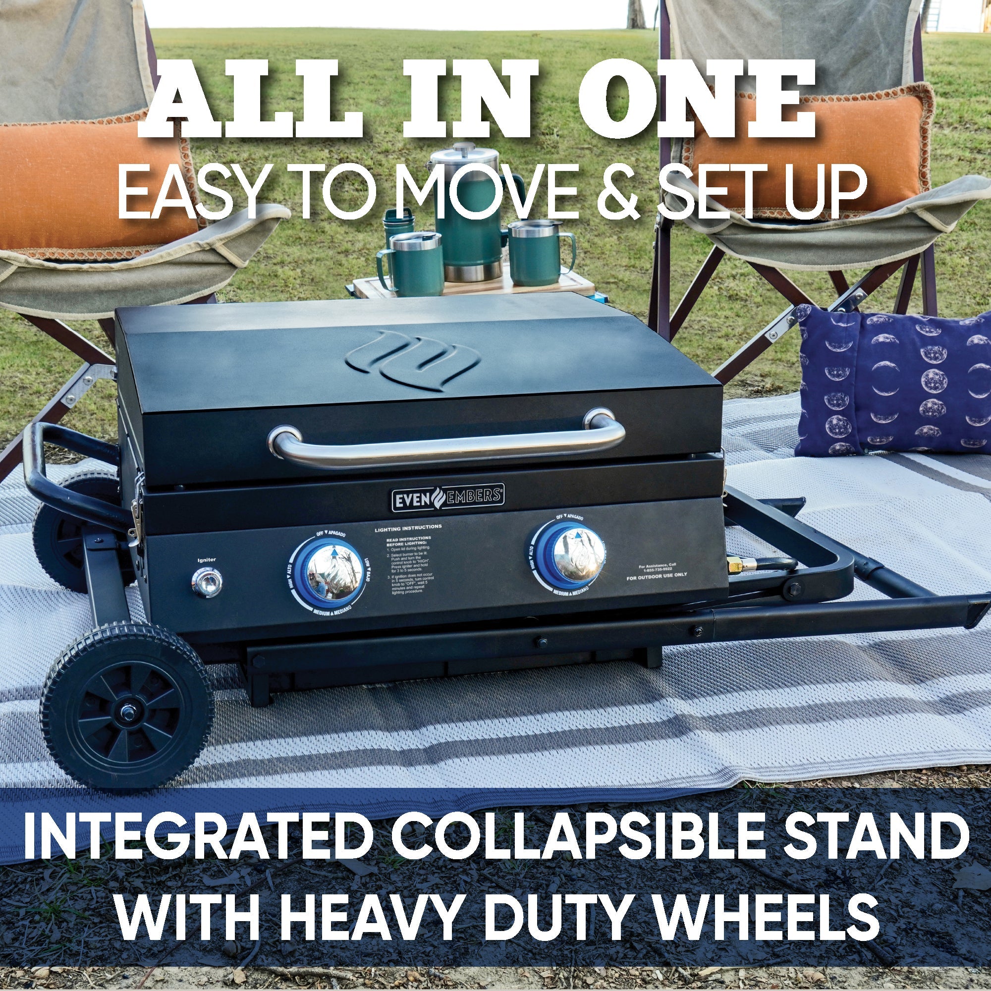 If you're looking for a versatile and easy-to-use outdoor cooking solution, look no further than the Even Embers 2-Burner Portable Gas Griddle with a collapsible stand! This 480 sq. in. griddle boasts a game-changing design that will make your outdoor adventures more enjoyable and less time-consuming. Featuring an integrated collapsible stand with 2 plastic wheels and removeable shelves, this griddle is easy to move and set up wherever you go. The 24" x 20" coated steel griddle is heated by 2 stainless steel burners with an electronic ignitor, delivering 32,000 BTUs. The fully functional locking steel lid allows easy transport and can be used to melt, steam, or bake, and protects the griddle when not in use. Six accessory peg hooks provide a convenient storage solution for your cookware and utensils. When you're done cooking, the collapsible stand pivots from the center and folds flat together, making transportation a breeze. Store the removeable side tables underneath the cart when not in use for added convenience. Whether you're tailgating, camping, or simply enjoying a day out with family and friends, this griddle is a must-have for anyone who loves outdoor cooking.