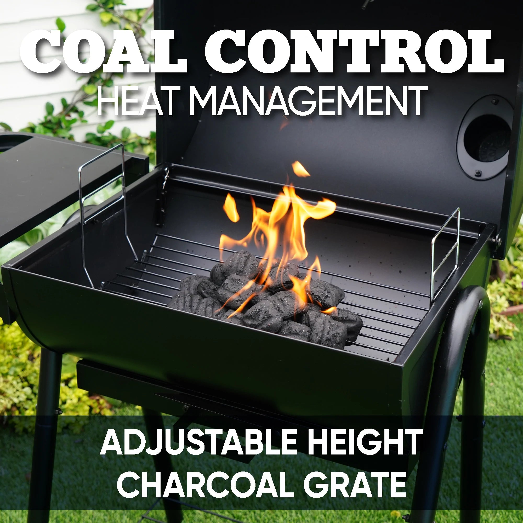 - Adjustable height charcoal grate