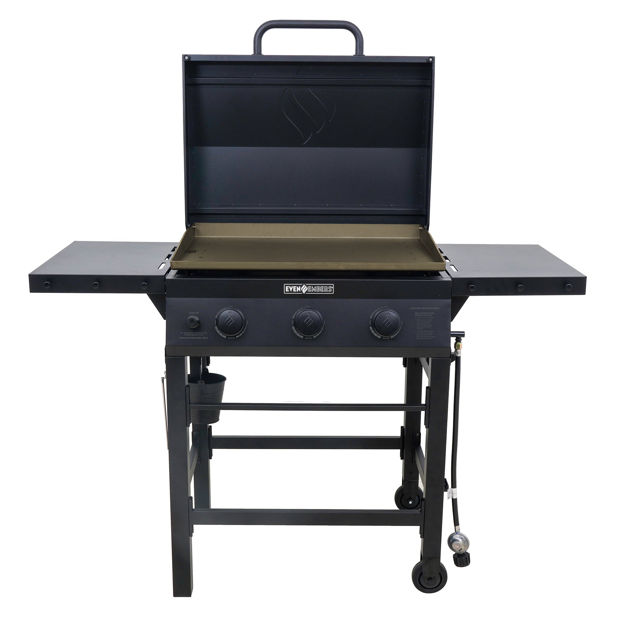 The Even Embers 3-Burner Griddle delivers powerful heat, versatile cooking, and convenience in a compact outdoor griddle experience. With 560 square inches of total cooking space and three stainless-steel burners producing 39,000 BTUs, enjoy multiple cooking zones all on one durable pre-seasoned steel griddle top. The fully functional steel lid protects the griddle when not in use and can also be used to melt, steam, or bake your favorite dishes while cooking. Foldable side shelves provide additional prep and storage space, while six accessory hooks keep your grilling tools organized and within reach. Cleanup is simple thanks to the large built-in grease bucket, and the included heavy-duty 300D custom-fitted cover ensures your griddle stays protected from the elements. Equipped with two durable wheels, this griddle is easy to move around your patio or deck, making it perfect for breakfast, lunch, or dinner outdoors.