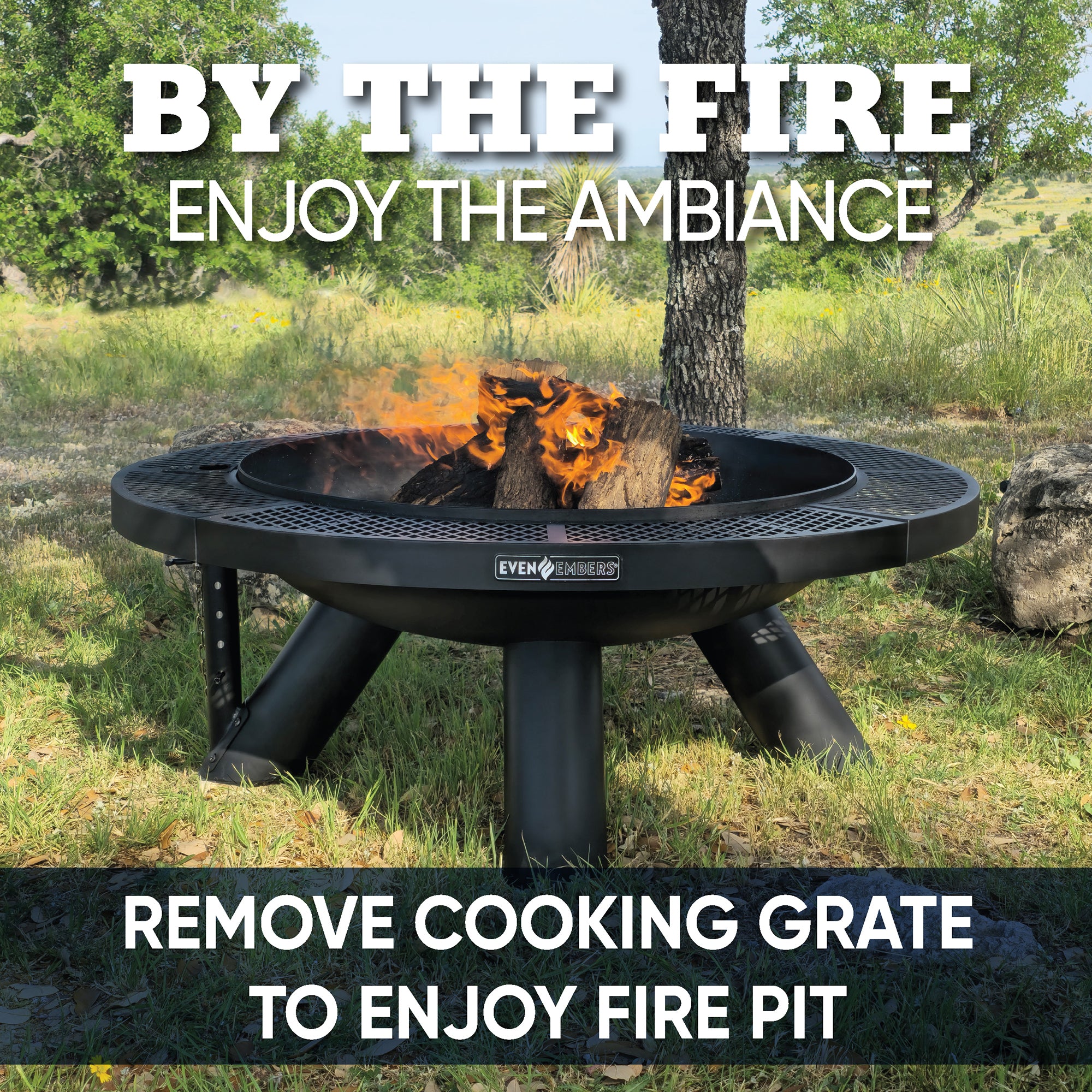 Bring your outdoor gatherings around the Even Embers 44-inch Round Fire Pit with Cooking Grate, the ultimate backyard essential. Constructed from heavy-gauge steel, this fire pit ensures durability and longevity for countless cozy gatherings. The 24-inch coated steel cooking grate with 452 square inches of cooking space smoothly swivels 360 degrees, making outdoor cooking a breeze. The locking pin on the adjustable height cooking grate ensures precise height adjustments, allowing you to cook to perfection. Equipped with an 8mm charcoal or wood grate, this fire pit offers versatile fuel options for your fireside feasts. The 6-inch wide outer ledge adds a touch of convenience, providing a handy space for utensils or your favorite fire pit snacks. Elevate your outdoor experiences with the multifunctional 44 in. Round Fire Pit with Cooking Grate by Even Embers.