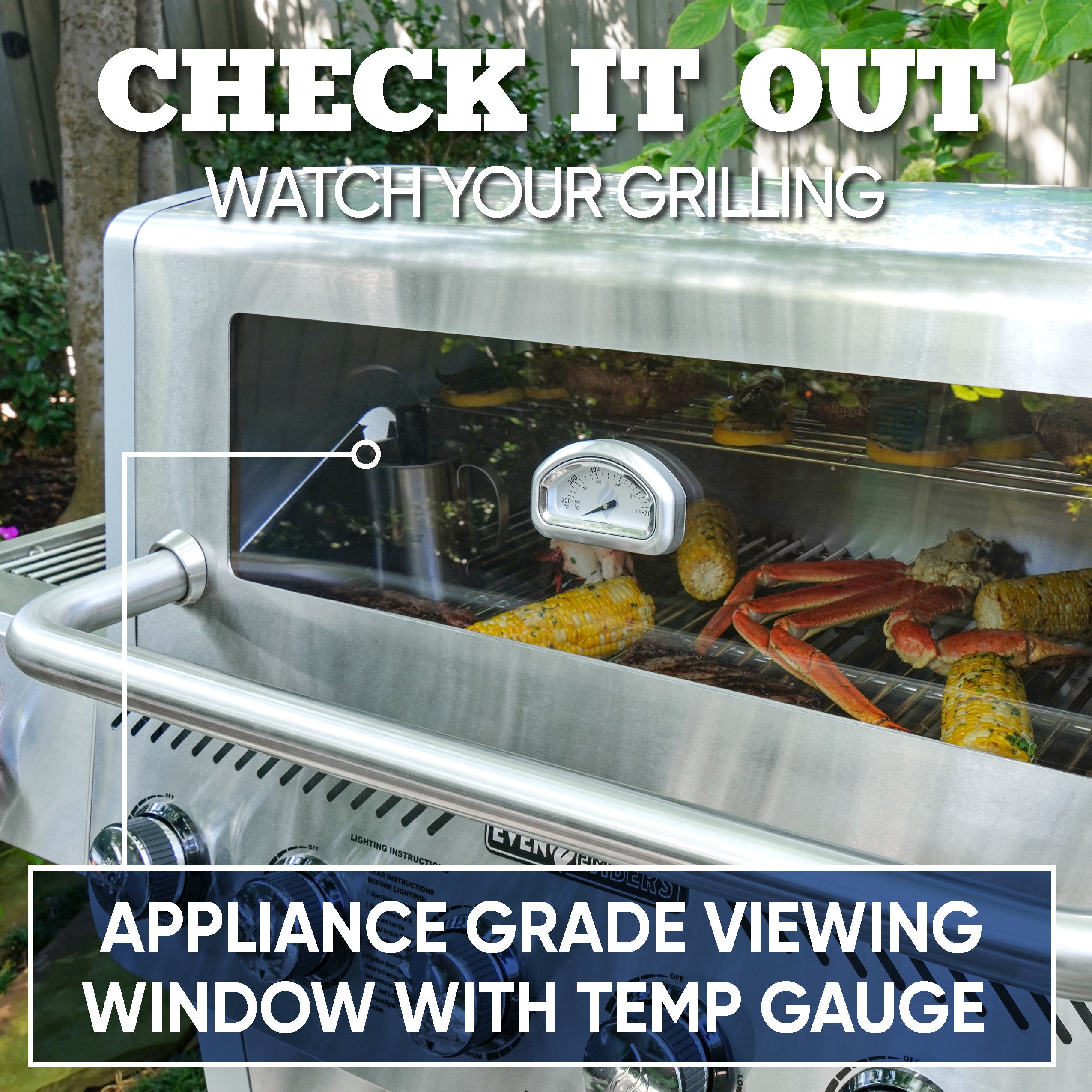 - Appliance-grade glass viewing window to monitor your grilling progress without lifting the lid