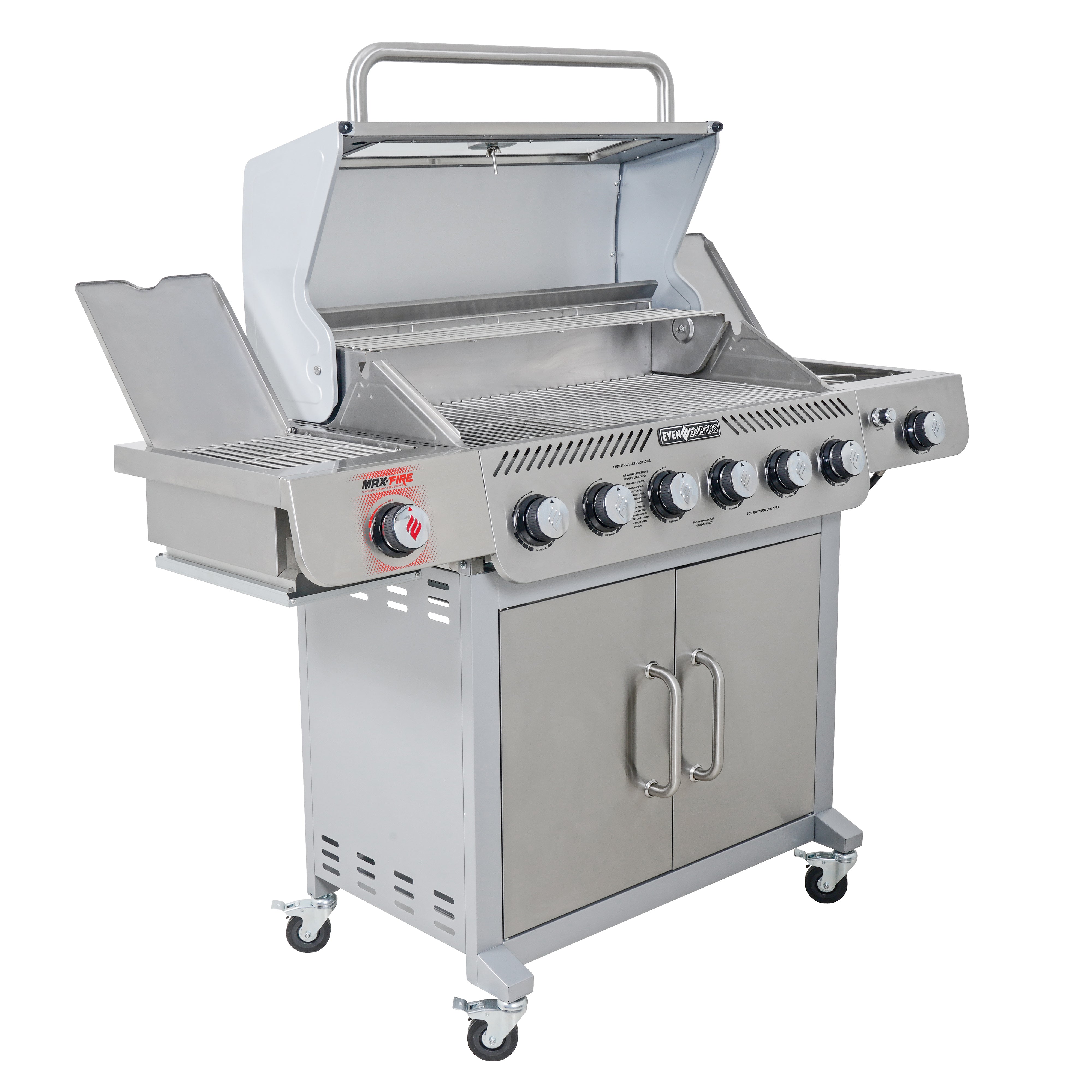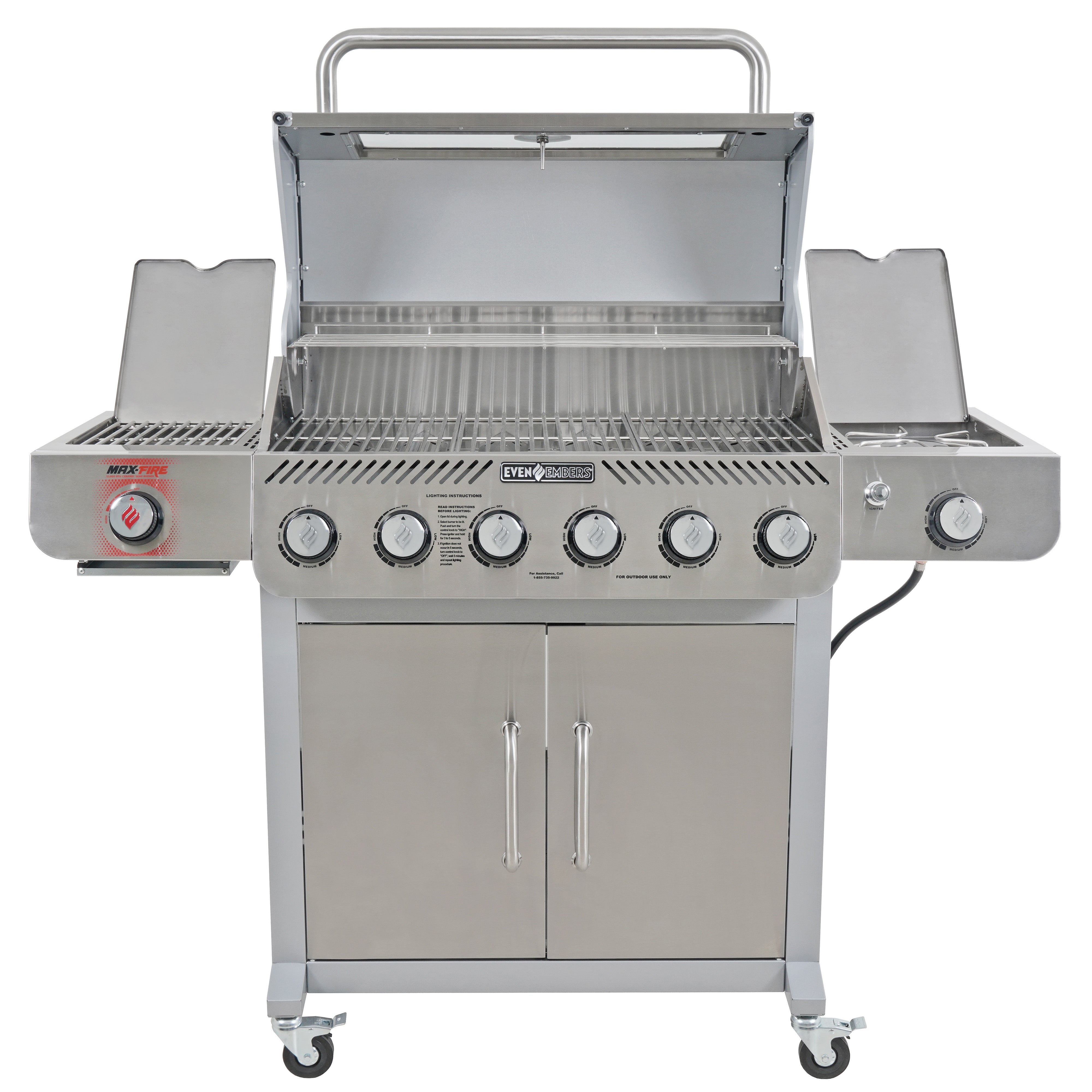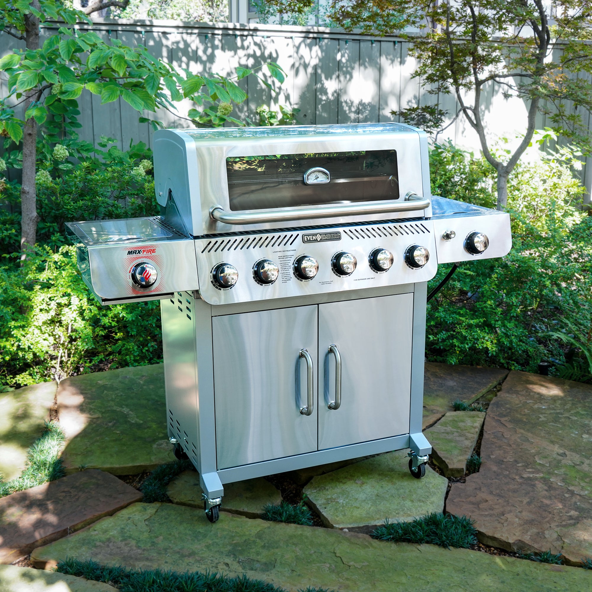 Take your grilling game to the next level with the Even Embers 6-Burner Gas Grill with Side and Sear Burners. Featuring six stainless steel burners that deliver an impressive 49,800 BTUs, this grill is built for serious backyard chefs. With 850 square inches of total cooking space, 552 square inches of primary space, and a spacious 298 square inches on the warming rack, you'll have all the room you need to cook for family and friends. Monitor your grilling progress effortlessly through the appliance-grade glass viewing window, and enjoy unmatched control with independent electronic ignition on every burner for reliable and precise startups. Elevate your cooking options with the 12,000 BTU ceramic Max Fire Sear Burner on the left side table, perfect for achieving restaurant-quality sears, and the 12,000 BTU stainless steel side burner on the right side table, ideal for preparing sauces or sides. The durable stainless steel hood, stainless steel firebox, and premium stainless steel cooking grates ensure long-lasting performance. With 3 accessory peg hooks and four locking swivel casters, this grill combines functionality with mobility, making it a versatile centerpiece for any outdoor kitchen.