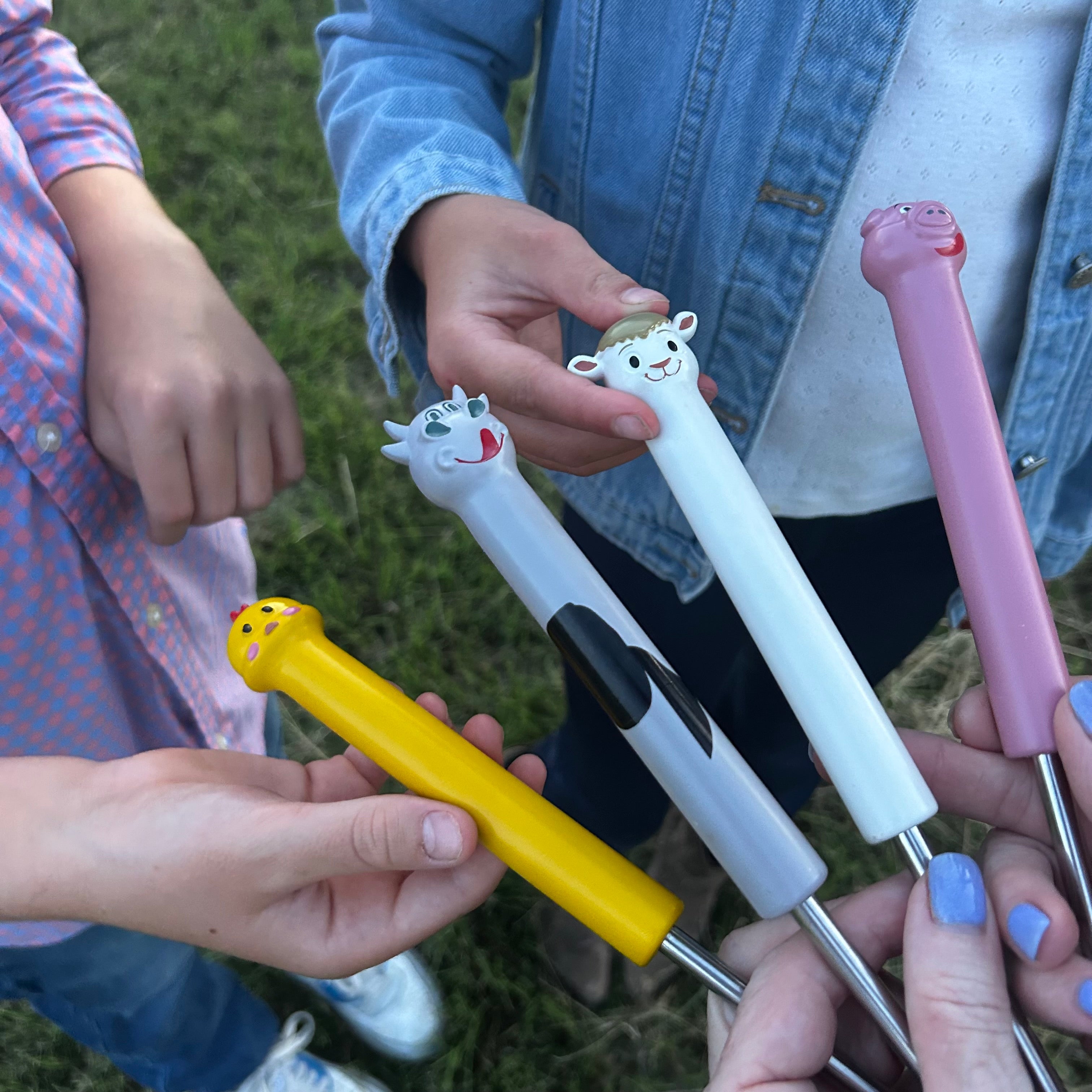 - Set of 4 farm animal roasting sticks: Cow, Pig, Sheep, and Chick