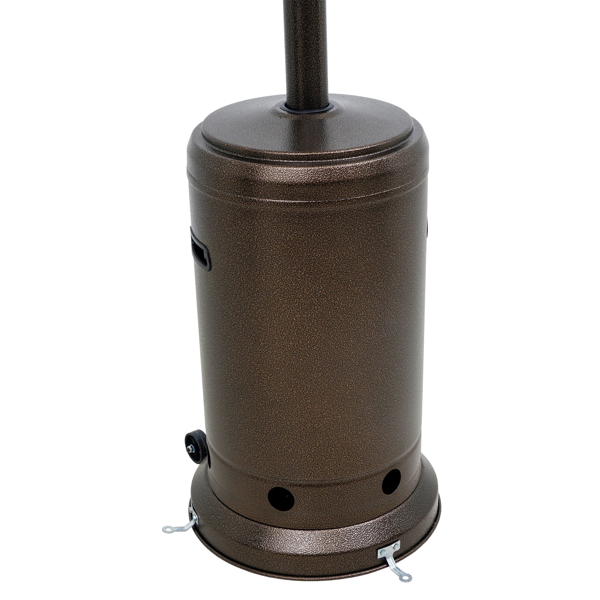 We've got your backyard covered this winter season with the Even Embers Gas Patio Heater. Producing 46,000 BTU's, it quickly heats up to 200 sq. ft., perfect for patios, decks, or outdoor gatherings. The electronic push-button ignition gets you started quickly, delivering steady warmth in under a minute. A wide 32-inch heat reflector spreads heat evenly, while the adjustable temperature knob gives you full control. Built-in safety systems include automatic tip-over shut-off and anchor brackets for secure setup. The built-in wheels and easy-lift tank housing make moving and maintaining the heater simple, so you can enjoy warmth wherever you need it. Finished in durable oil-rubbed bronze hammertone, this heater adds timeless style to any outdoor space.