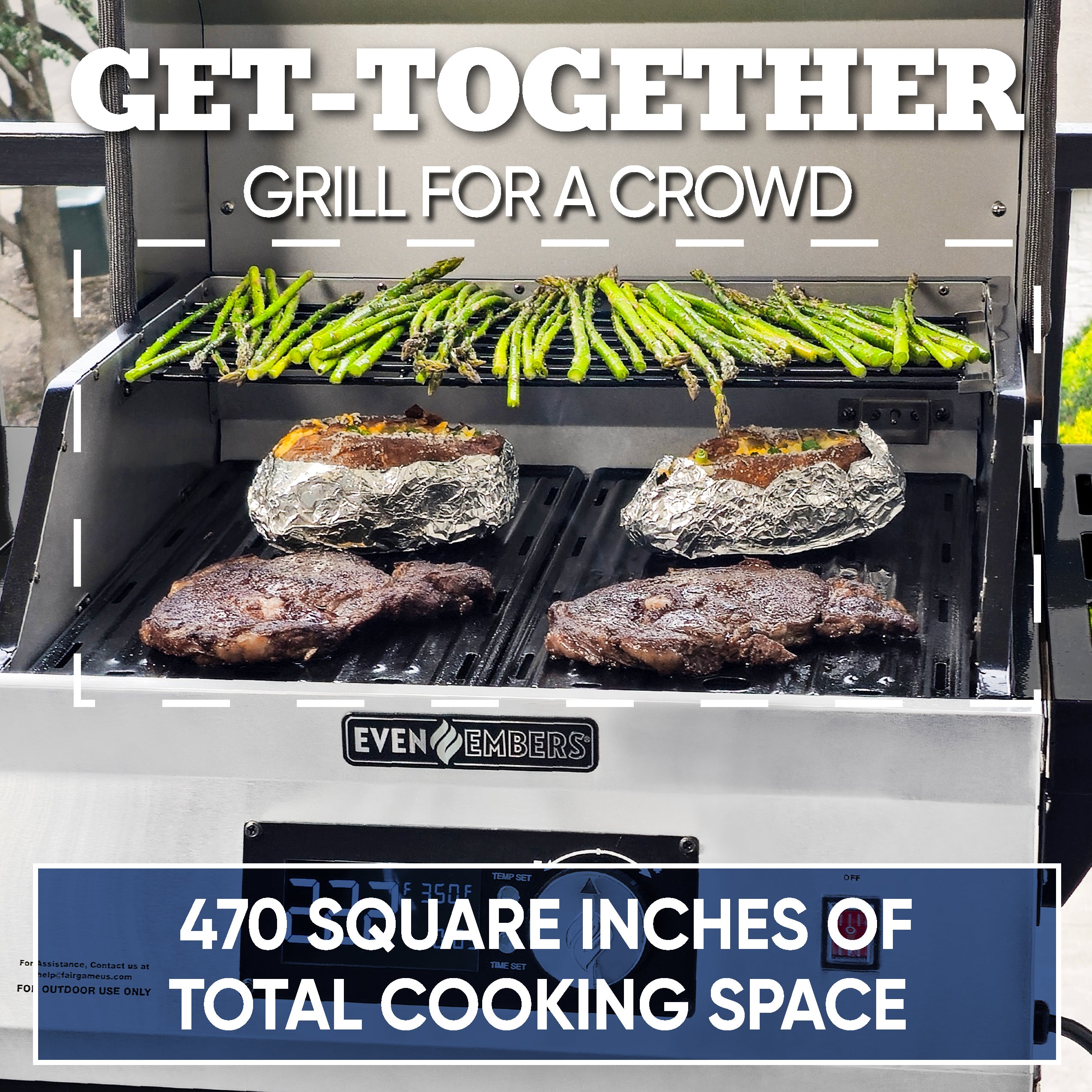 - Total cooking area: 470 sq. in., including 347 sq. in. of primary cooking space and 123 sq. in. of secondary cooking space