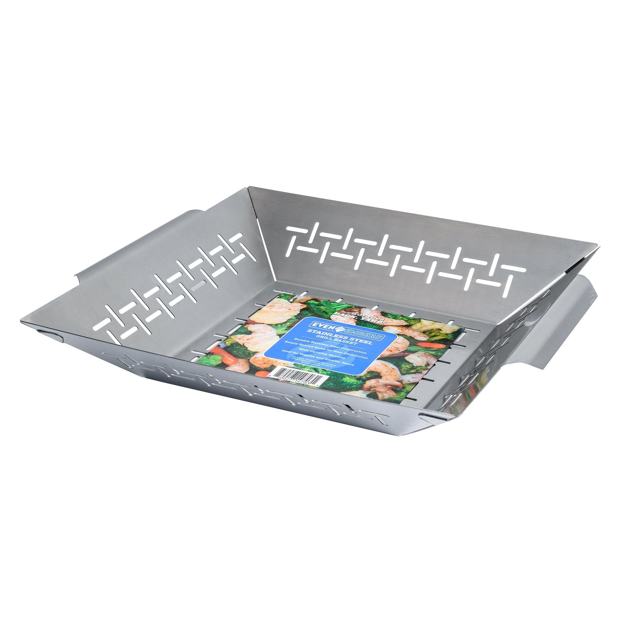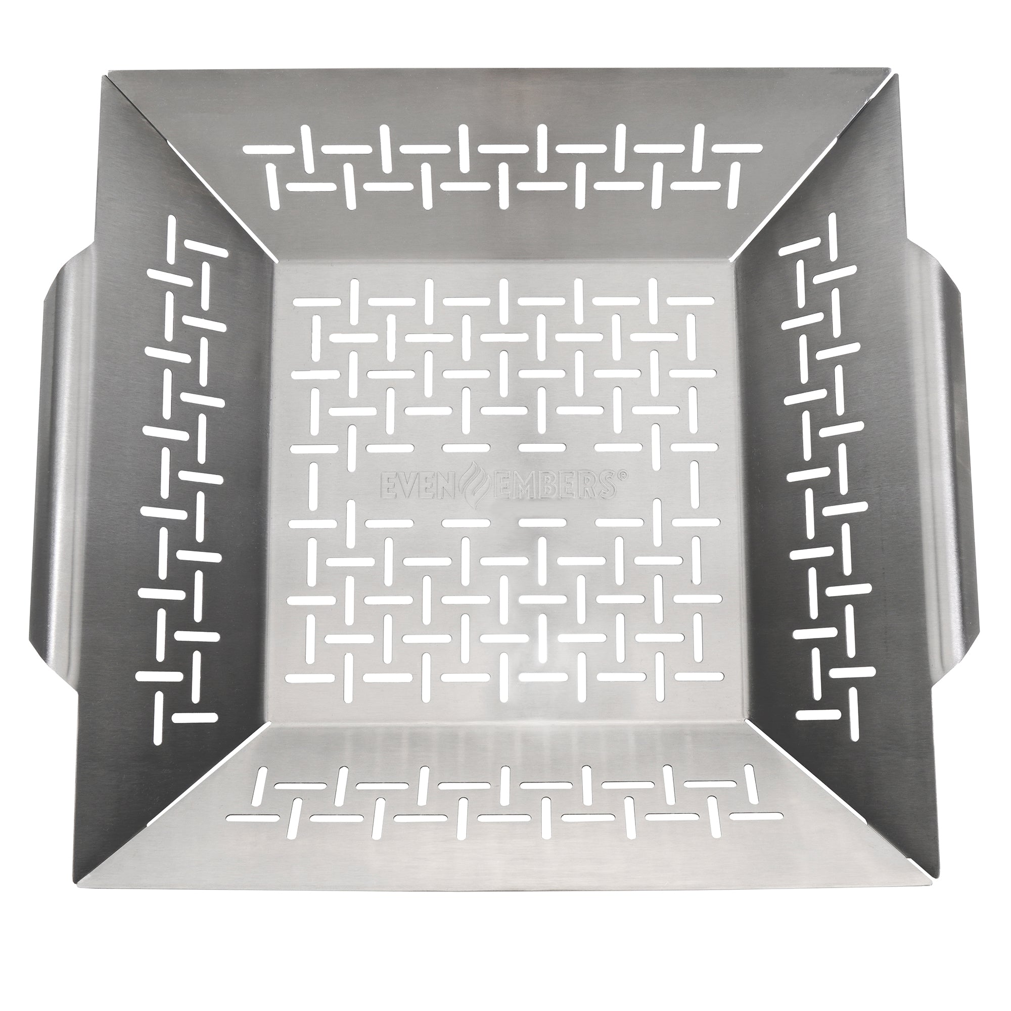 The Even Embers Stainless Steel Grilling Basket basket features evenly spaced holes for optimal heat distribution, ensuring every bite is perfectly cooked. The wide carrying handles provide easy maneuverability on the grill, while the sturdy stainless steel construction guarantees long lasting use. Ideal for grilling veggies and smaller cuts of meat, this versatile basket is designed to bring out the best flavors in your favorite ingredients.