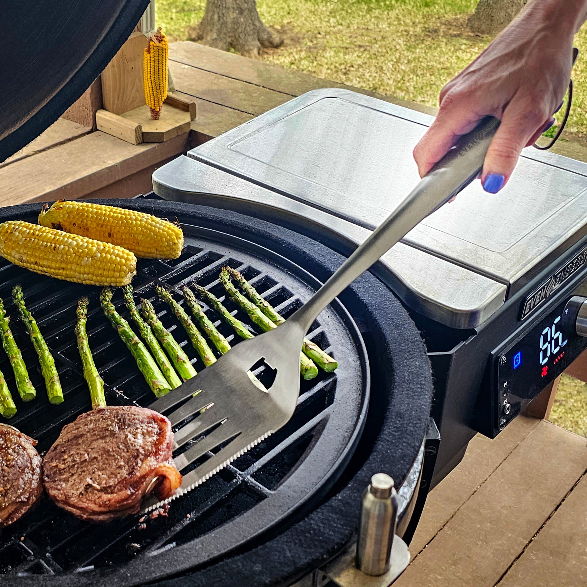The Even Embers Stainless Steel Spatula is the perfect tool to upgrade your grilling game. Constructed with heavy duty stainless steel, this spatula is built to last and features a ergonomic non-slip grip handle allowing you to flip and maneuver food with confidence. Crack open a cold one with the built-in bottle opener and cut with precision with the serrated knife edge. Whether you're flipping pancakes, turning burger patties, or just scooping grilled potatoes for your backyard party, this convenient and versatile tool will effortlessly make any cooking task easier.