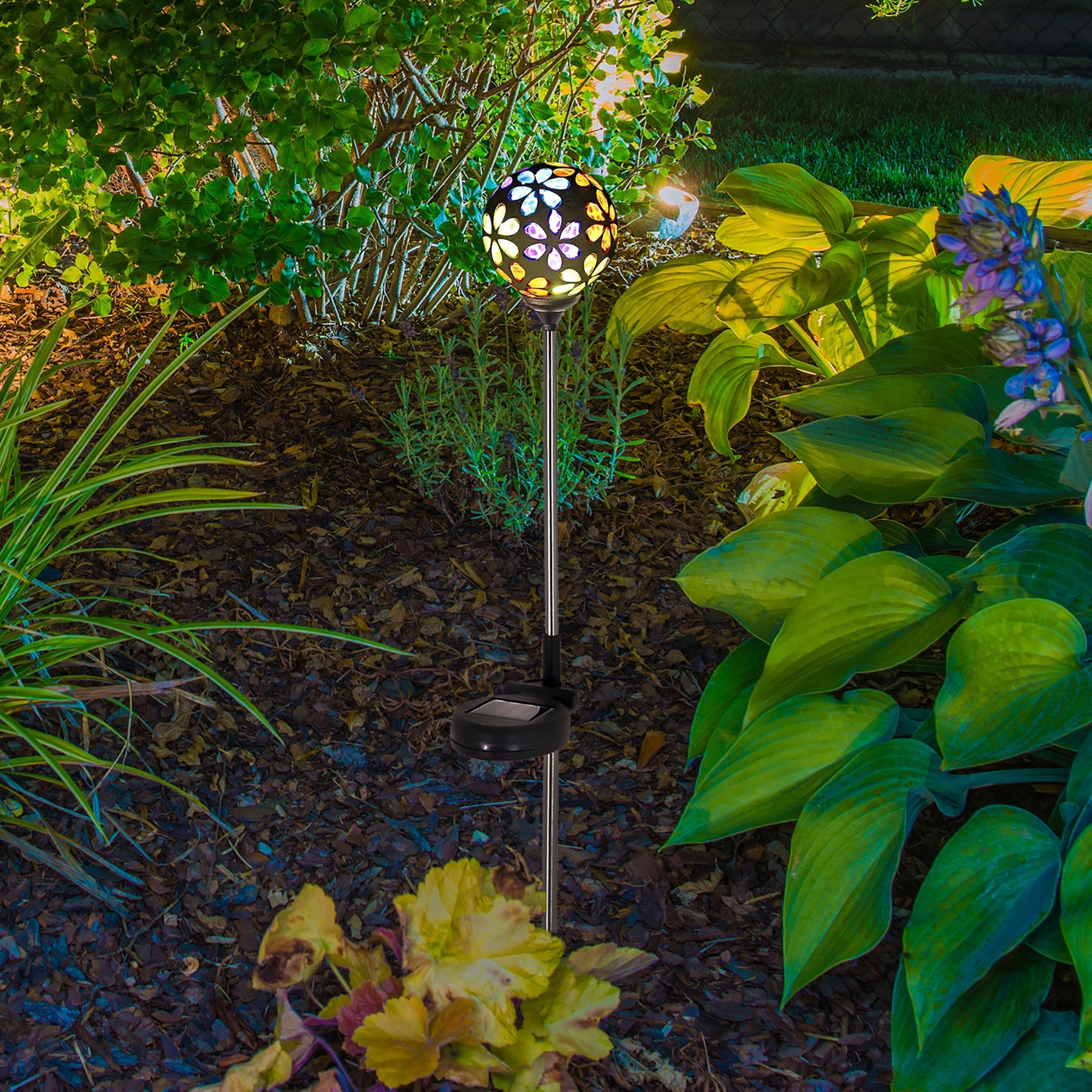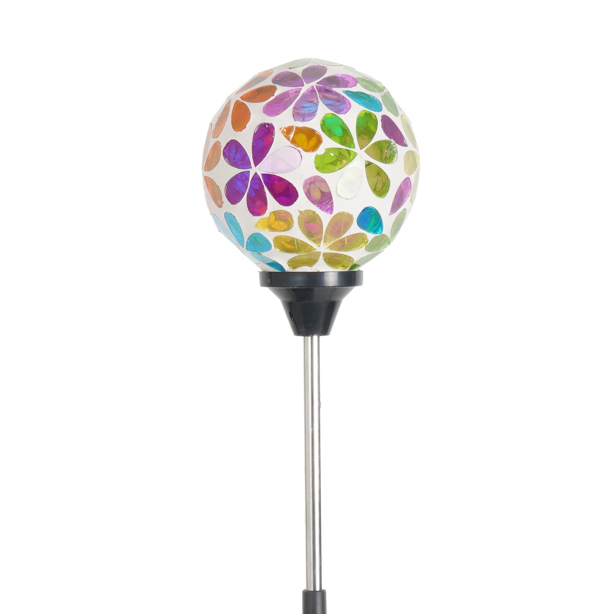 Decorate your outdoor space with the Lux-Landscape Solar Mosaic Flower Ball Light. This outdoor solar light features an integrated solar panel that charges the battery during the daytime. Insert the stake into the ground to brighten up your outdoor space this summer season.