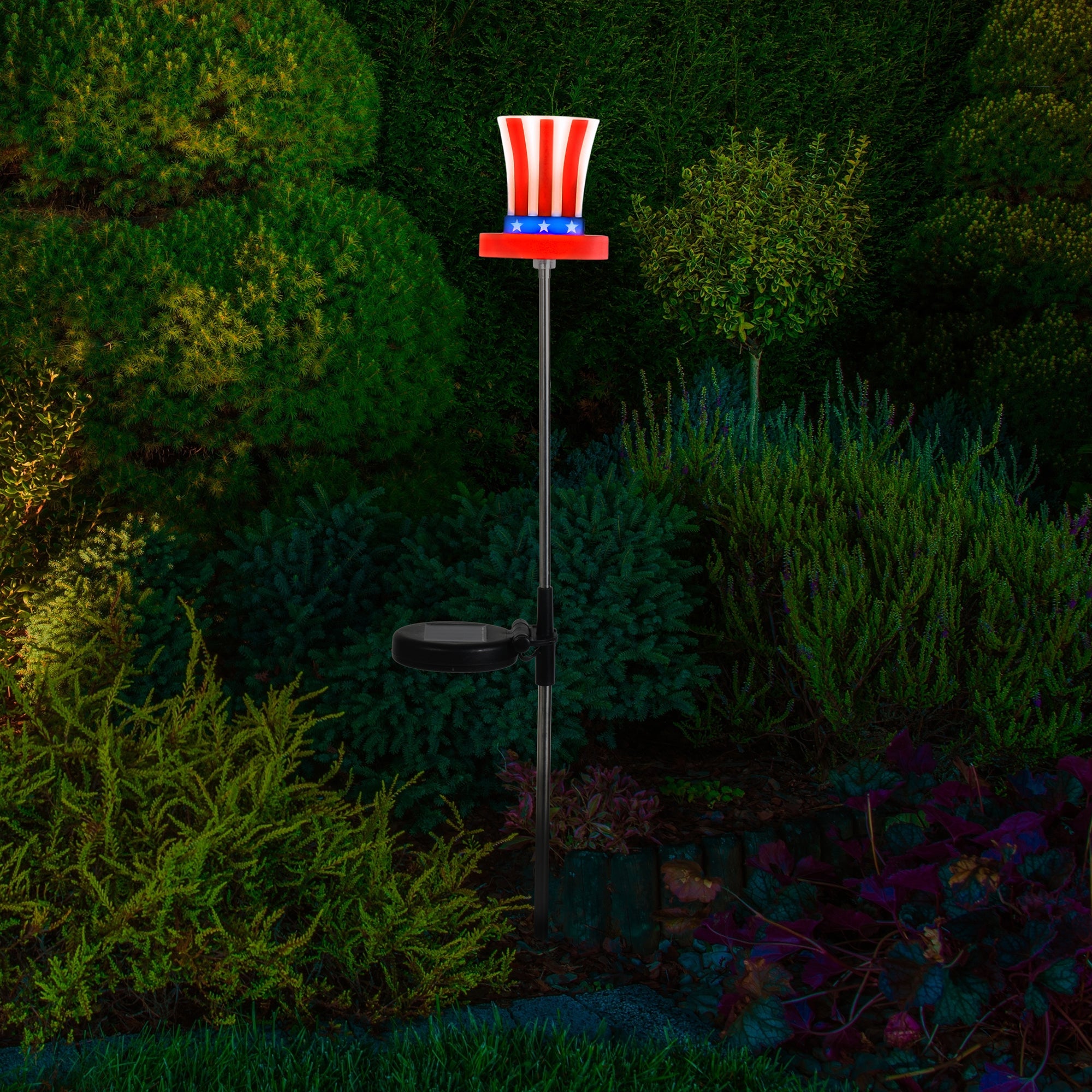 Bring the fun outdoors with the Lux-Landscape Solar Uncle Sam Hat Light. This outdoor solar Uncle Sam Hat light features an integrated solar panel that charges the battery during the daytime. Insert the Uncle Sam Hat light's stake into the ground to brighten up your outdoor space this spring season. Automatically turns on at night for up to 8 hours with a full charge Insert the stake into the ground to brighten up your outdoor space Integrated solar panel charges the battery