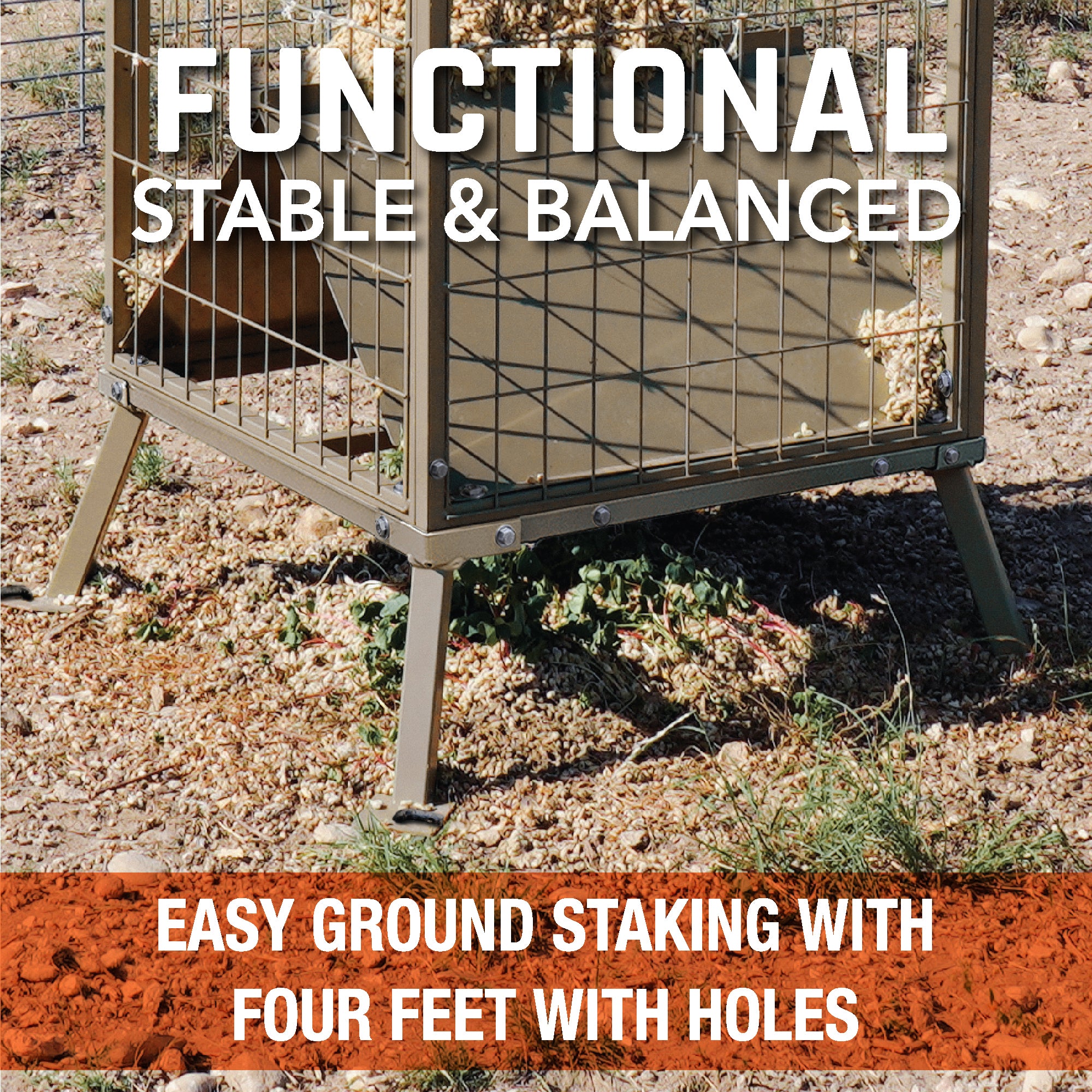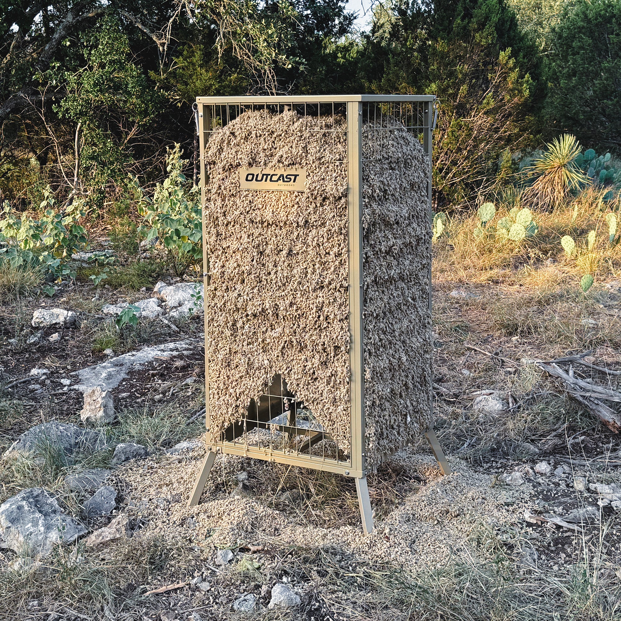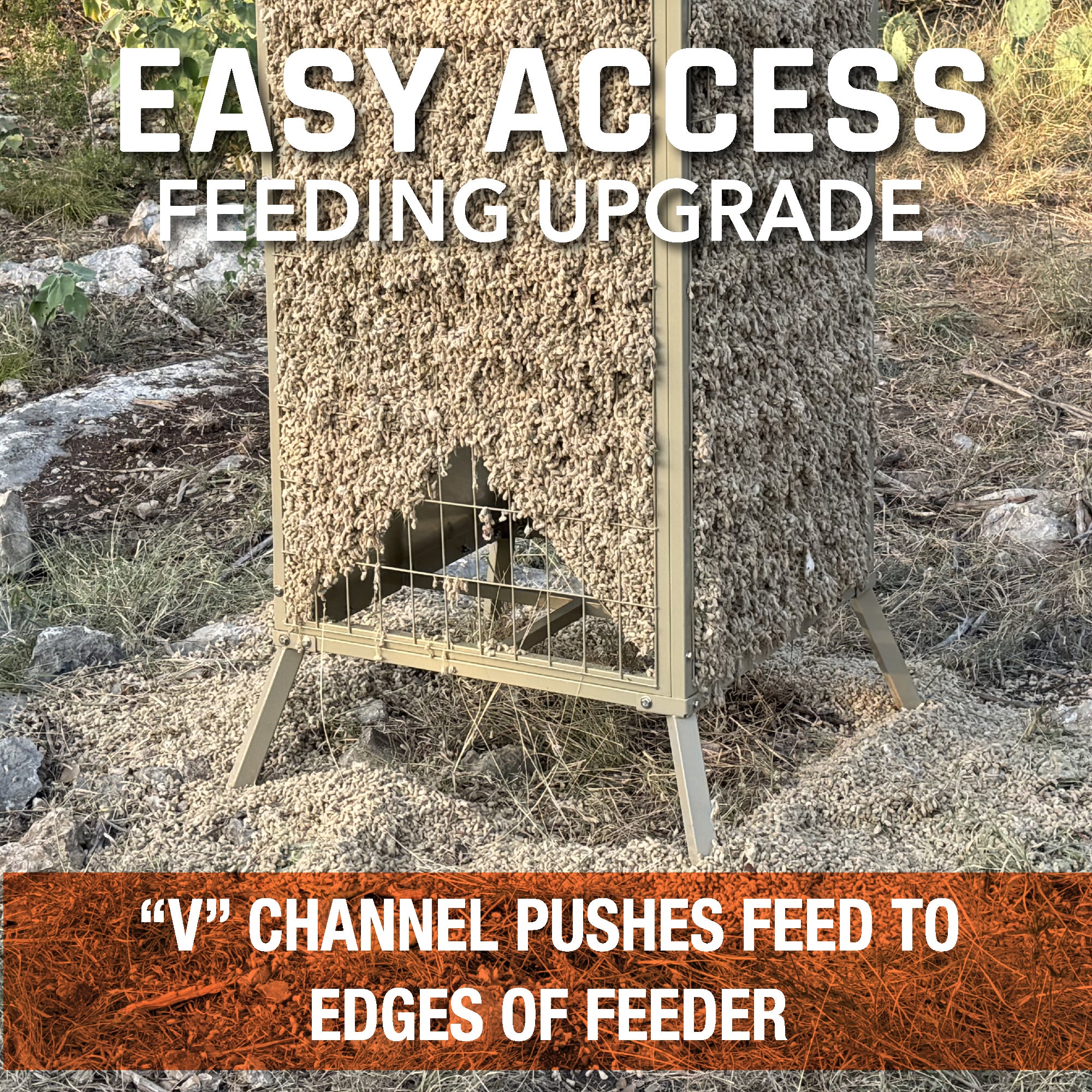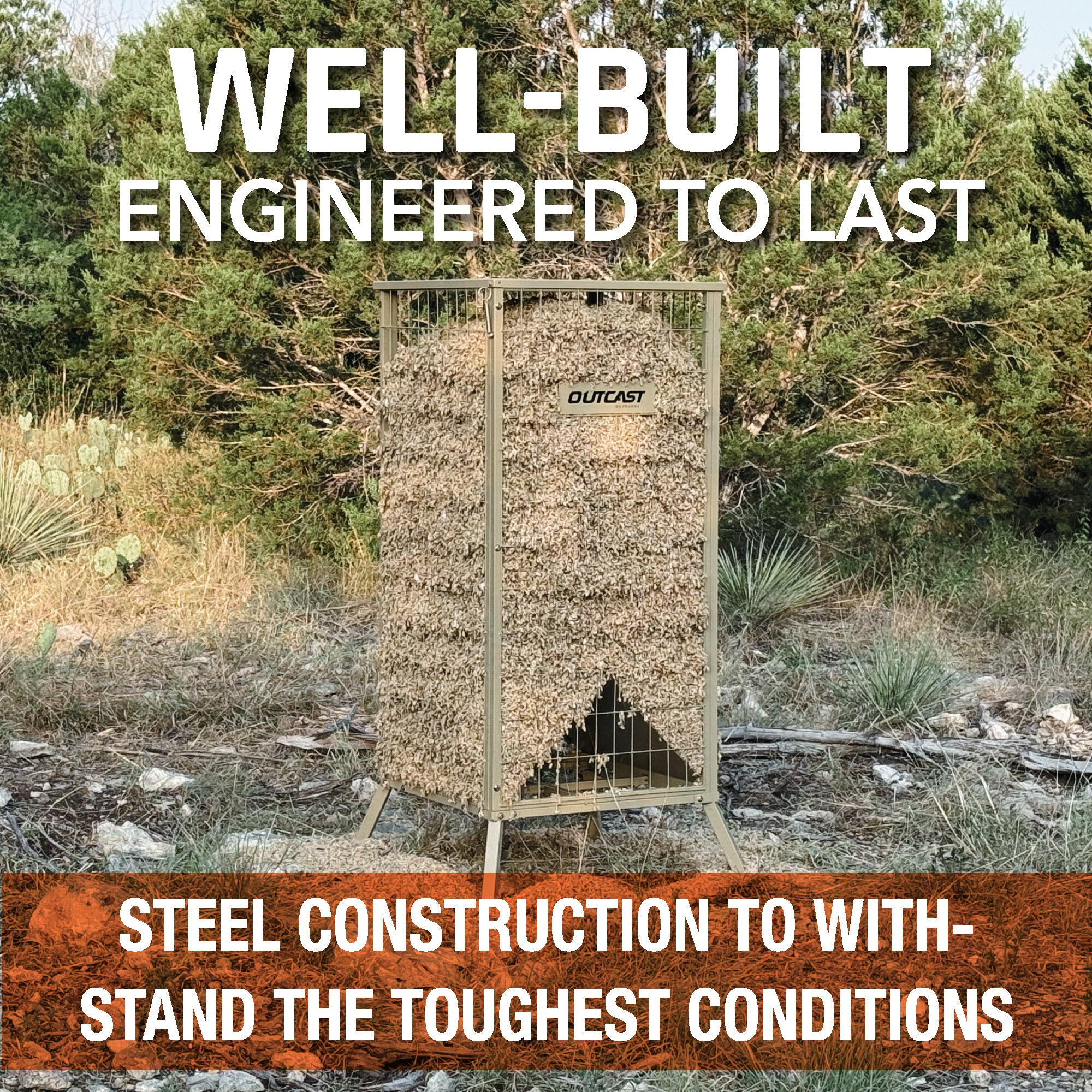 Do your part to keep the local deer well-fed by setting up the Outcast 350 lb. Cottonseed Feeder. It holds up to 350 lb. of cottonseed to supplement the natural deer forage diet. The game feeder is made from weather-resistant steel and has a V-shaped channel to help push the cottonseed to the edges.