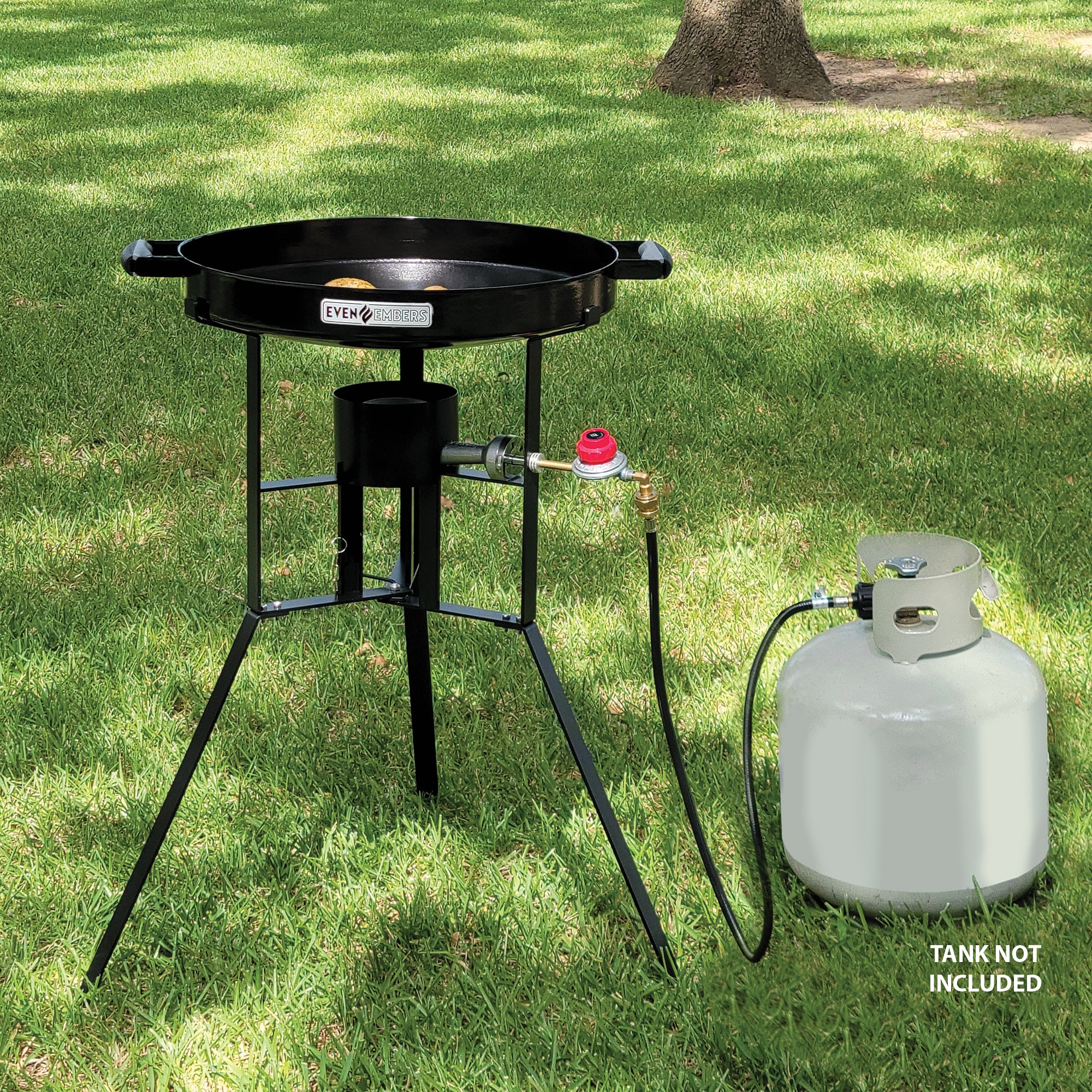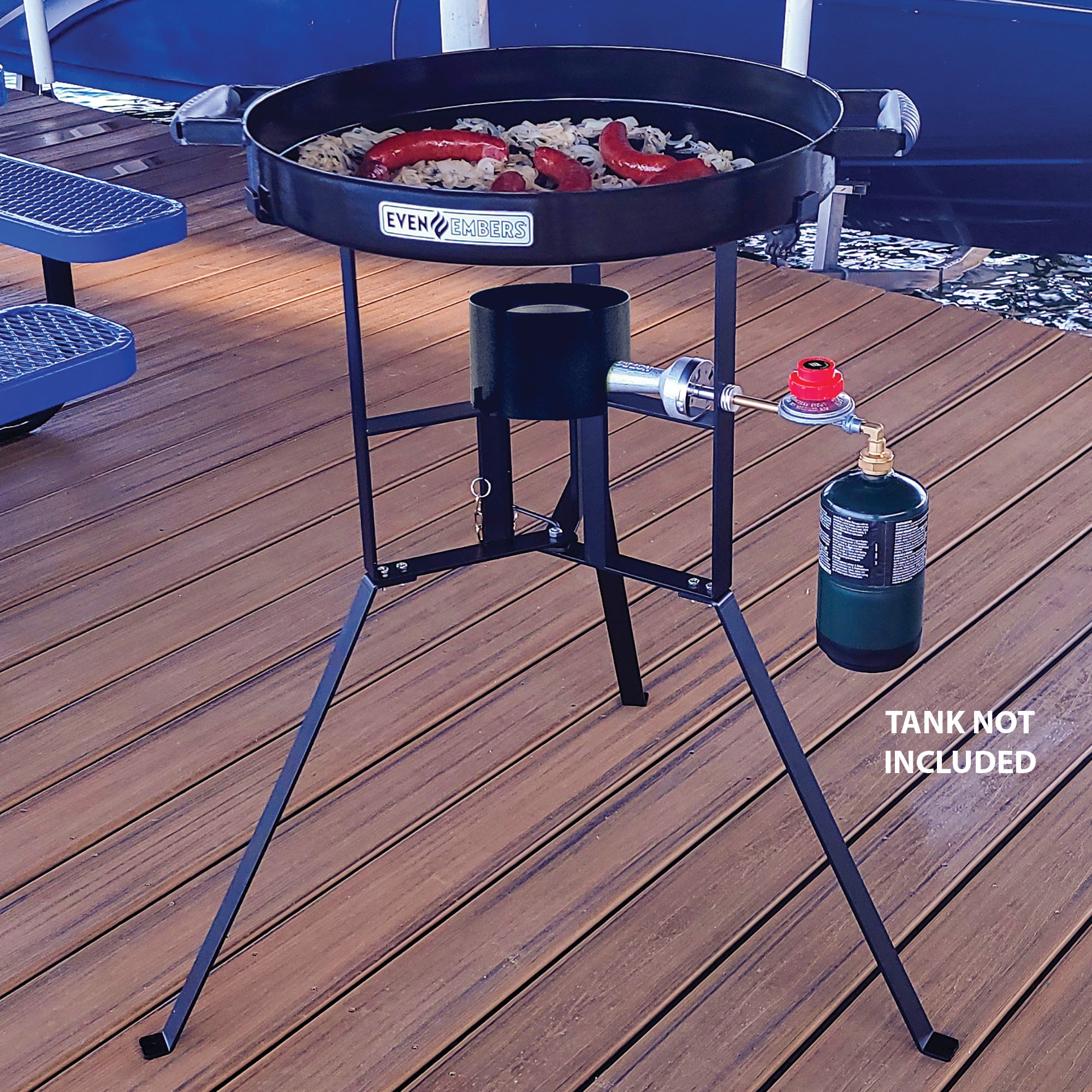 Cook like a pro wherever you go with the Even Embers Portable Grab-N-Go Grill, the ultimate companion for outdoor cooking enthusiasts. With a generous 22 in. Dia cooking surface (380 sq. in. of cooking space), this versatile cooker allows you to fry, grill, stir fry, simmer, saute, sear, melt, boil, steam, and braise, all in one compact unit. Designed with convenience in mind, the stand collapses and folds flat for easy storage, making it perfect for tailgating, camping, RV-ing, hunting, fishing, picnics, BBQs, and more. Featuring three distinct cooking zones (high, medium, and low) powered by a single 14,000 BTU burner, you'll have the control and flexibility to cook any meal to perfection.