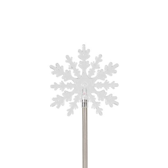 - Snowflake-shaped solar light with an integrated solar panel that charges the battery