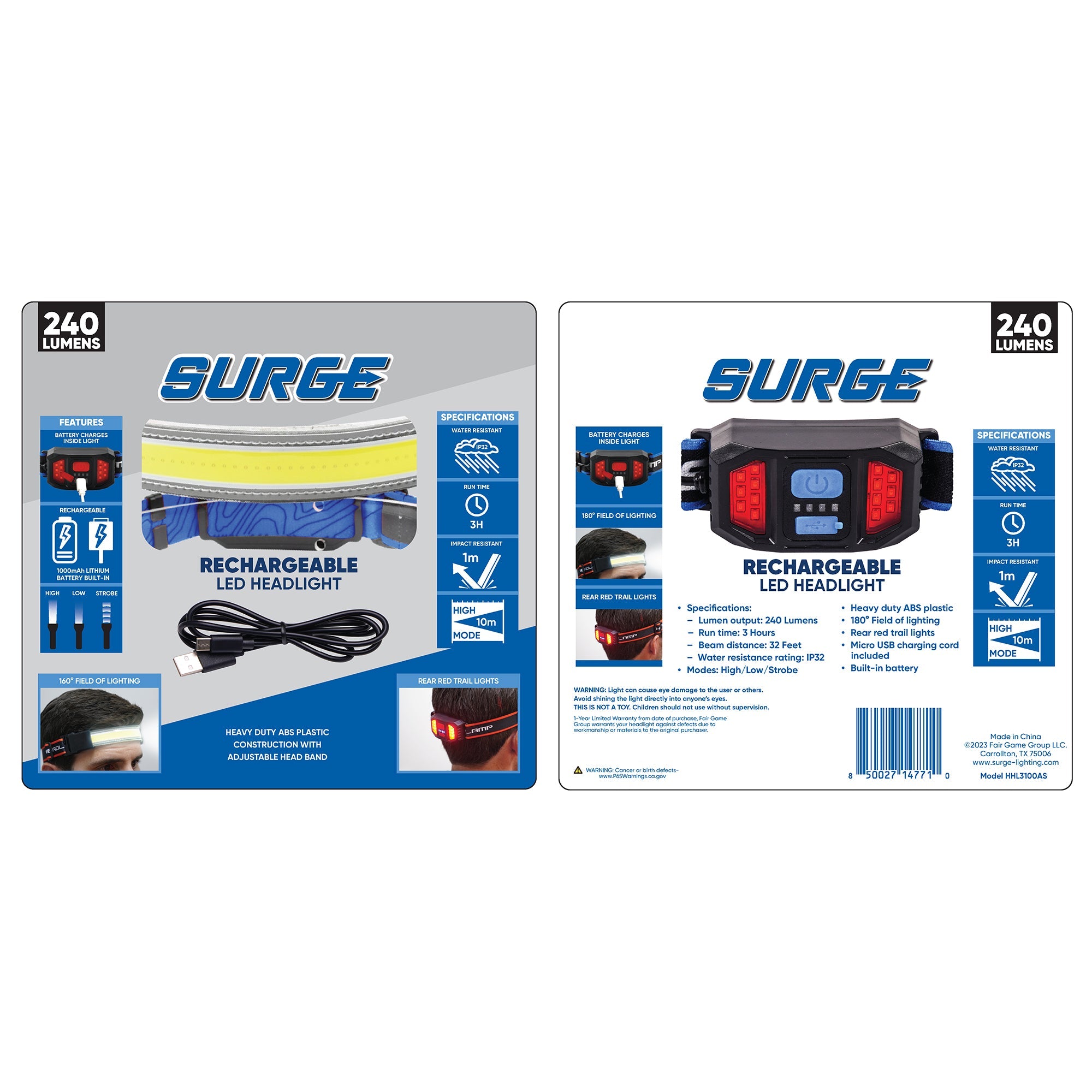 Ignite the night with the 240 Lumen Rechargeable Headlamp by Surge. The 180-degree broad spectrum design allows for a widespread beam, illuminating your surroundings. Rated IP32 water-resistant and 1-meter impact-resistant, this headlamp is suitable for all weather use. Includes a Micro-USB charging cord for quick and convenient recharging with a continuous run time of 3 hours on high, and 4 hours on low.