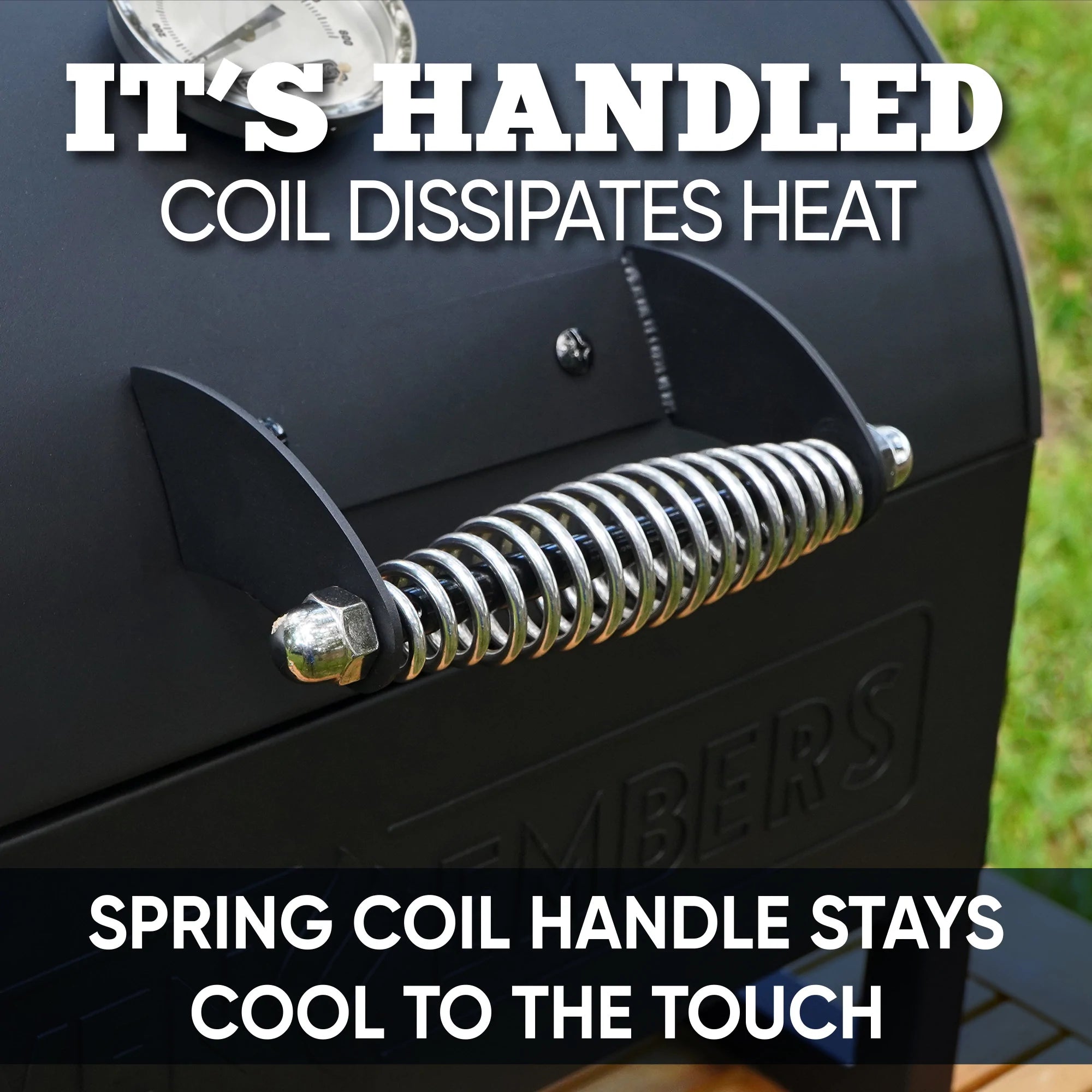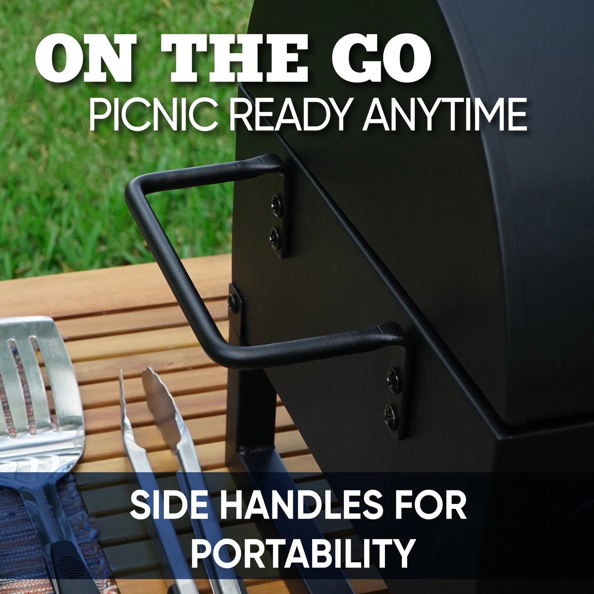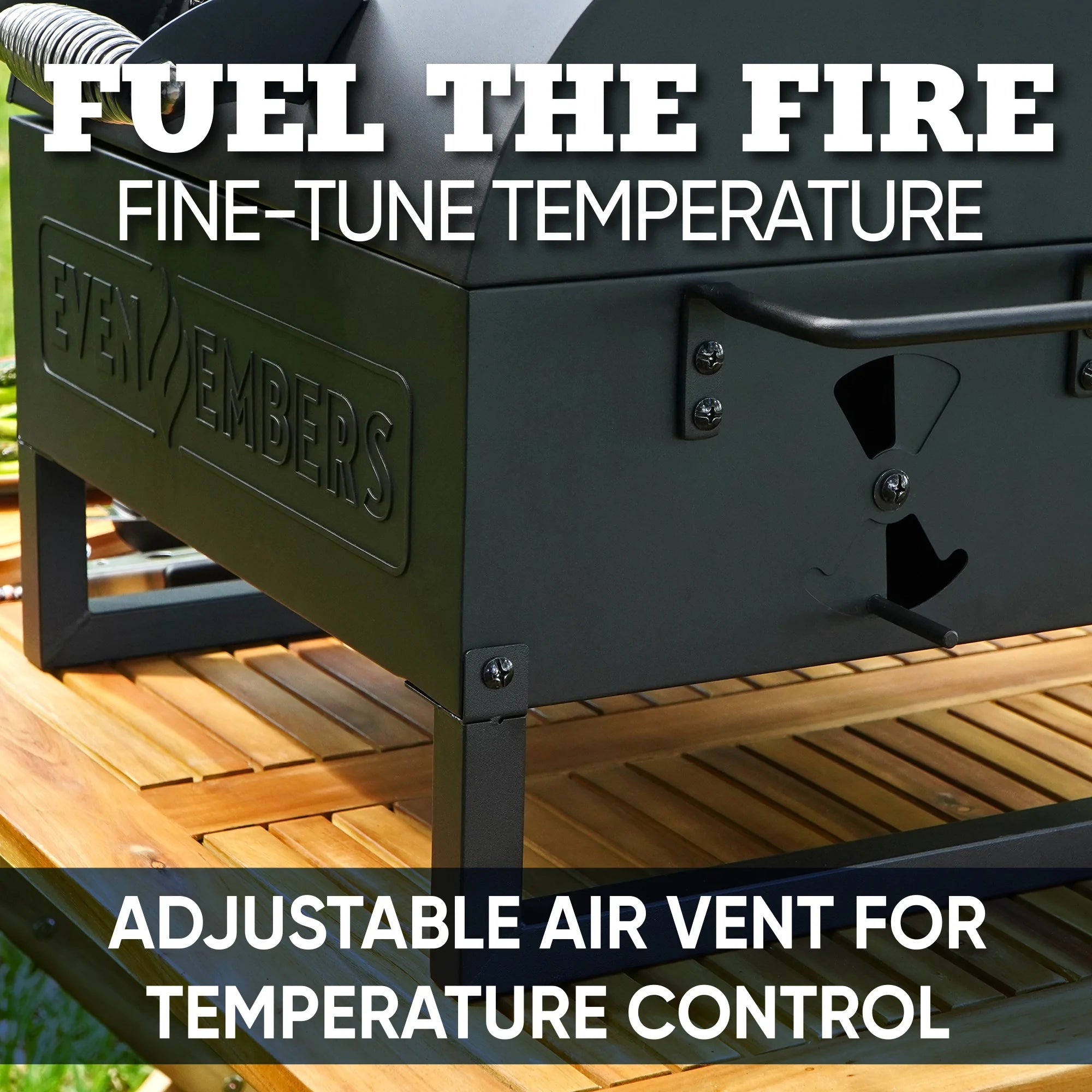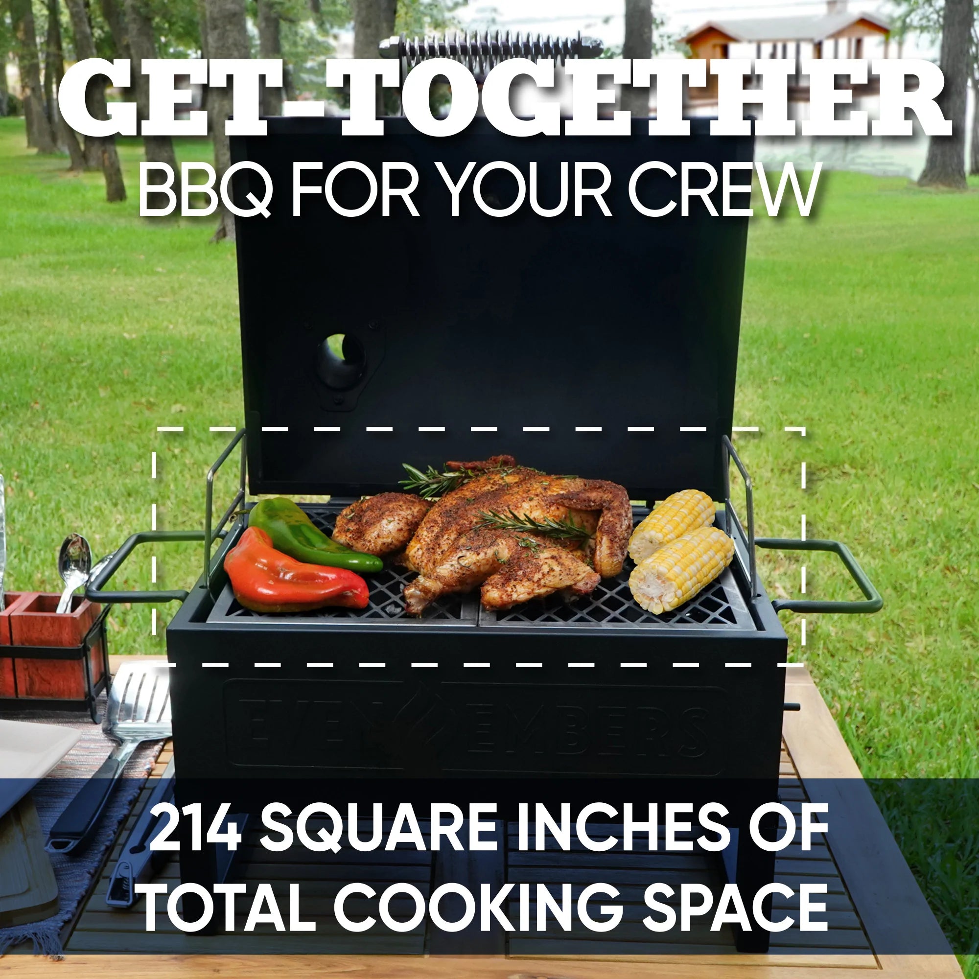 Compact, yet mighty, the Even Embers Tabletop Charcoal Grill offers 214 square inches of cooking space on heavy-duty pierced steel cooking grates. Cooking heat is in your control with an adjustable height charcoal grate, accessible air vent and easy to read temperature gauge. Side handles for portability make this Even Embers tabletop grill perfect for picnics on the go, camping, or backyard get-togethers.