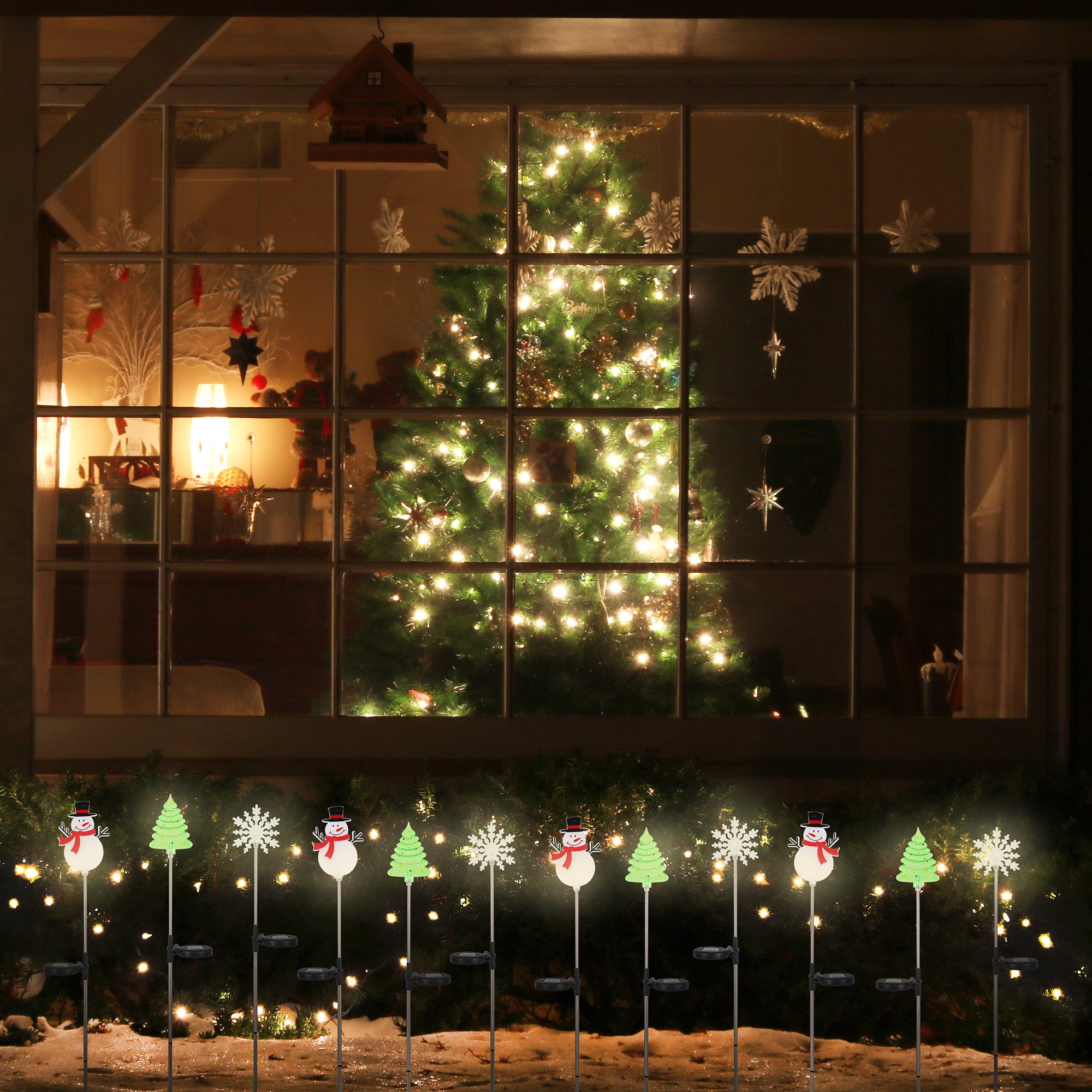 - QTY 4 Christmas Trees, QTY 4 Snowflakes, QTY 4 Snowmen solar lights in a pack