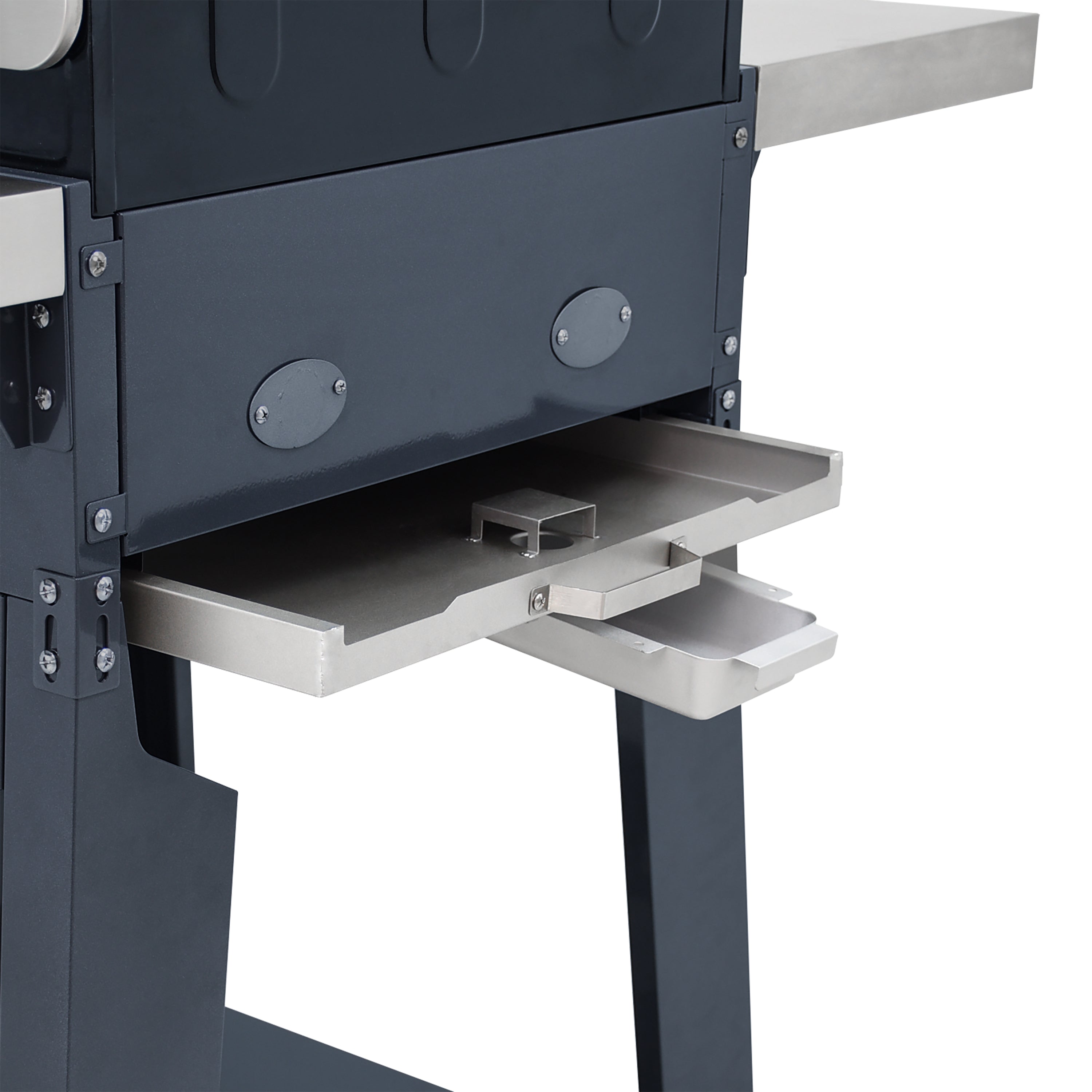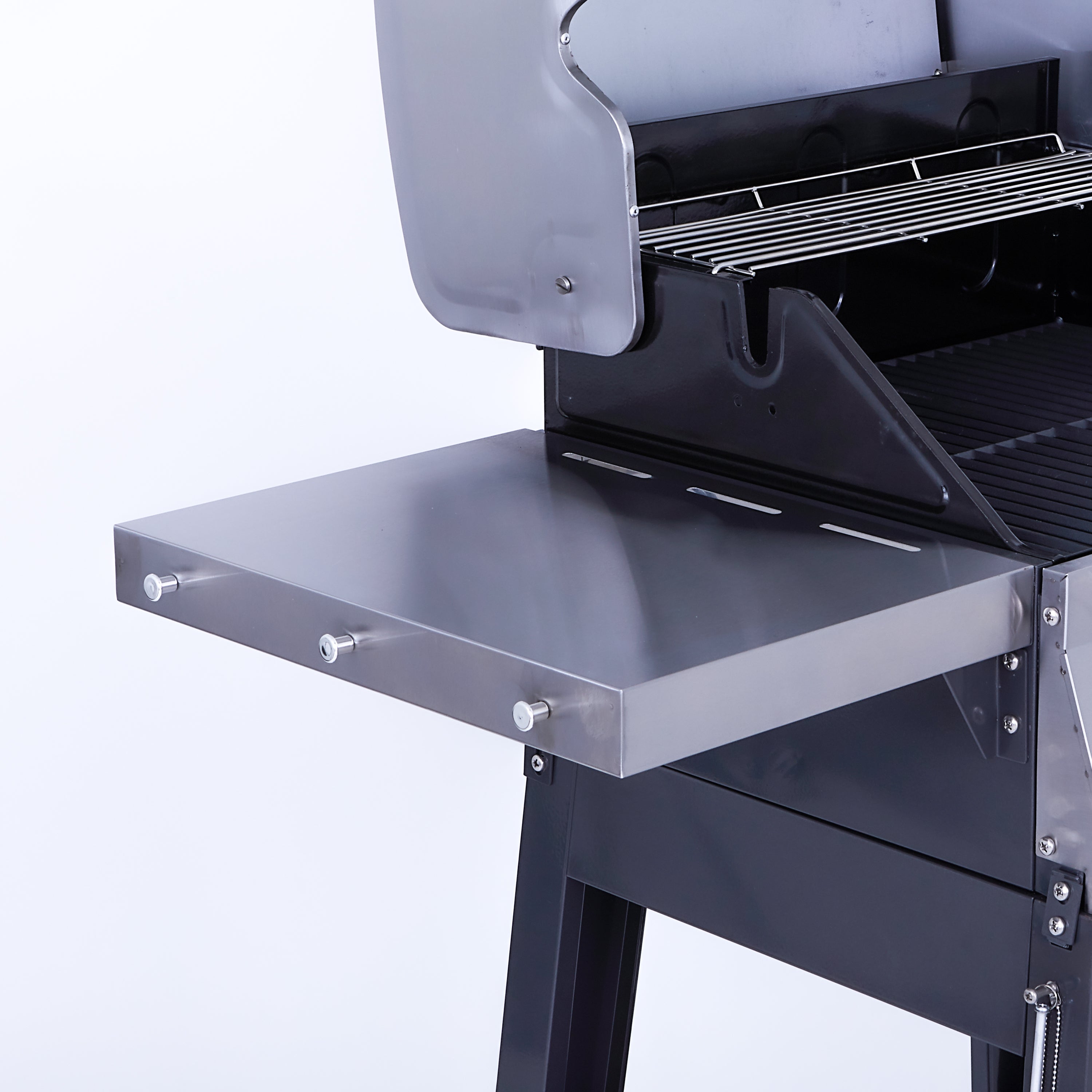 - Folding side shelves make it easy to store or position the grill, creating a convenient cook and prep space.