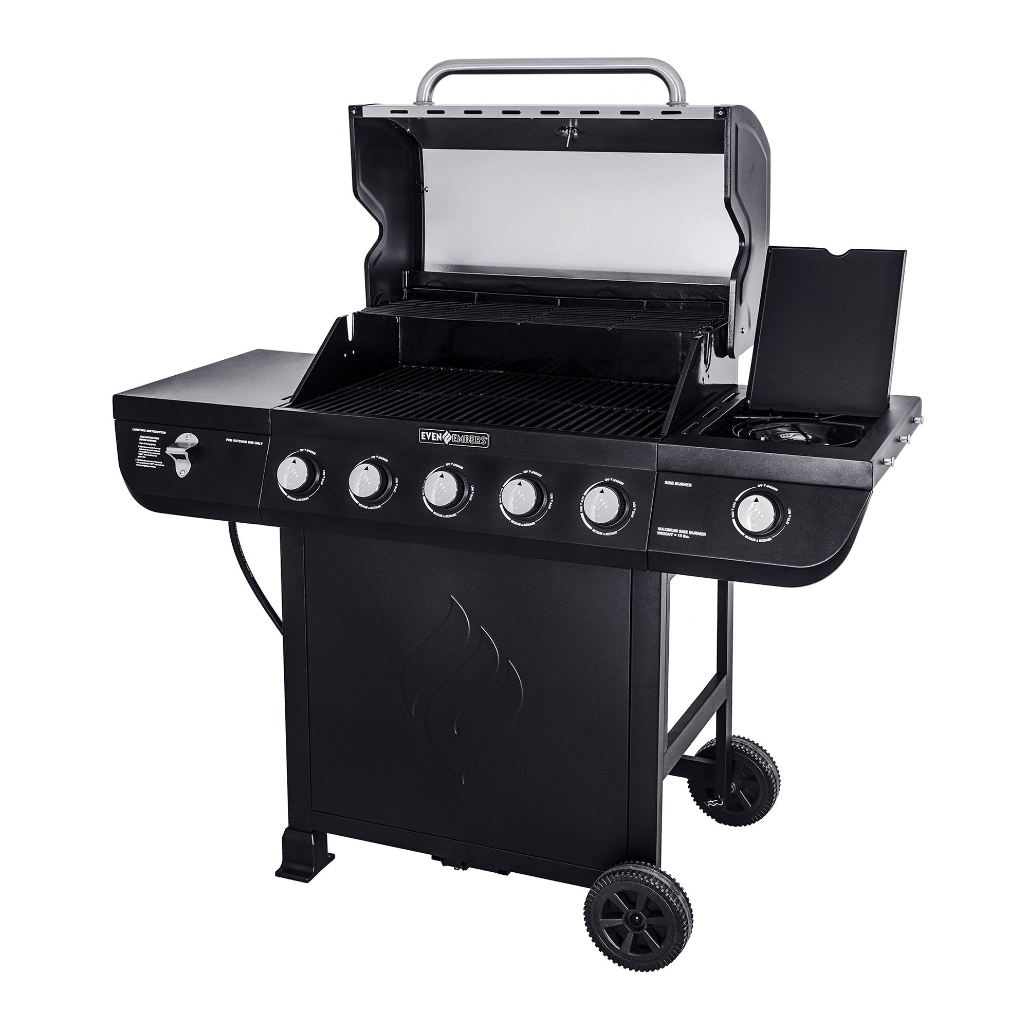 Built to last, The Even Embers GAS7540BS Even Embers Five-Burner Gas Grill is perfect for the daily griller. Equipped with a fully welded lid, independent ignition, and porcelain-coated cast-iron cooking grates, this versatile Even Embers grill includes plastic wheels for easy movement. Complete with 715 sq. in. of cooking space, this gas grill is a must for your next BBQ. Enjoy quality meals when you cook with this outdoor grill!