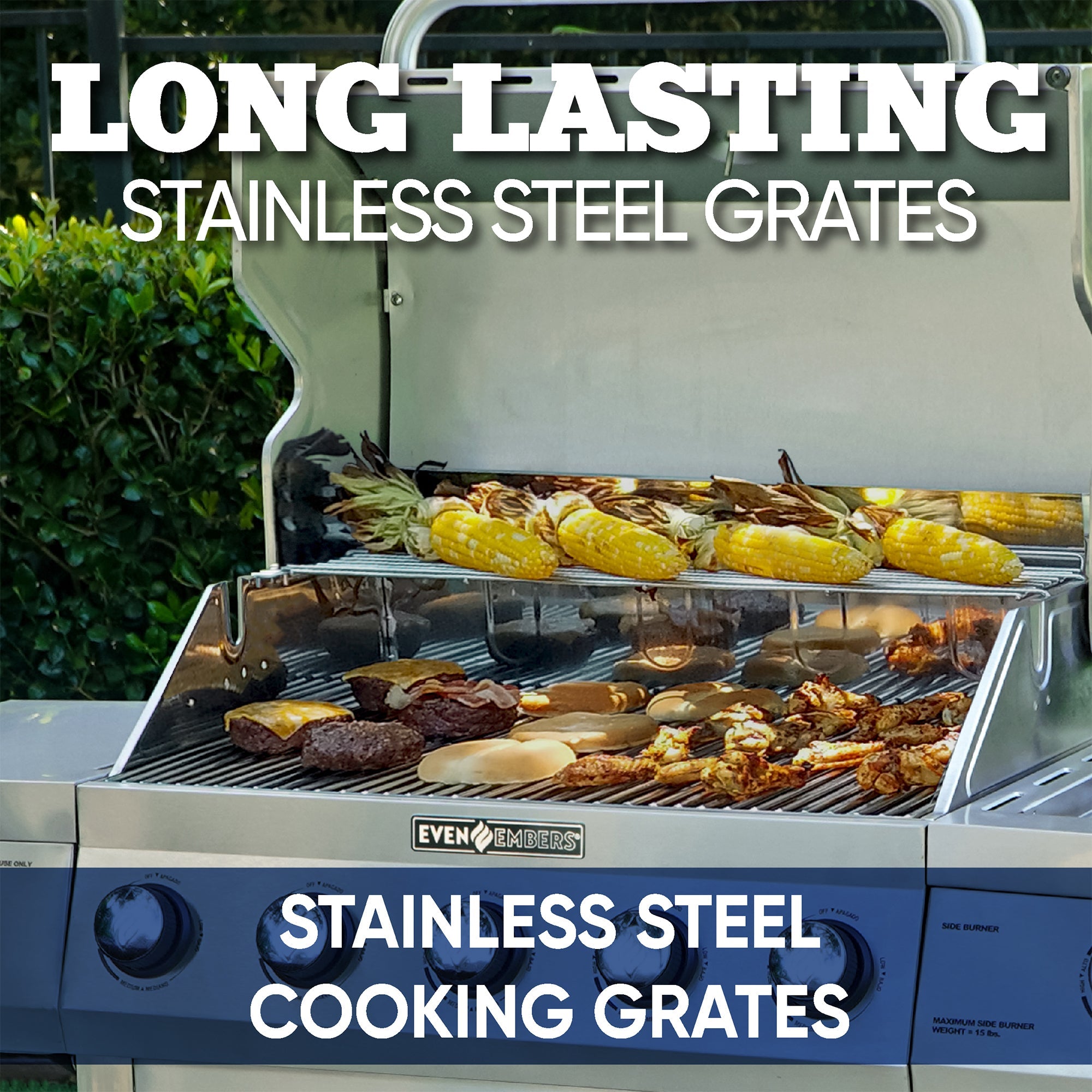 The Even Embers Five Burner Stainless Steel Gas Grill is built out of stainless steel material offering 715 sq. in. of total cooking surface for plenty of grilling space. It is equipped with solid stainless steel cooking grates that retain heat exceptionally well. Perched above the 5-ceramic-coated stainless steel burners are stainless steel heat tents that distribute heat evenly across the entire cooking surface. Integrated ignition on every burner allows burners to fire up instantly and the built-in thermometer enables precise temperature regulation. 4 locking casters make this grill easy to move around.