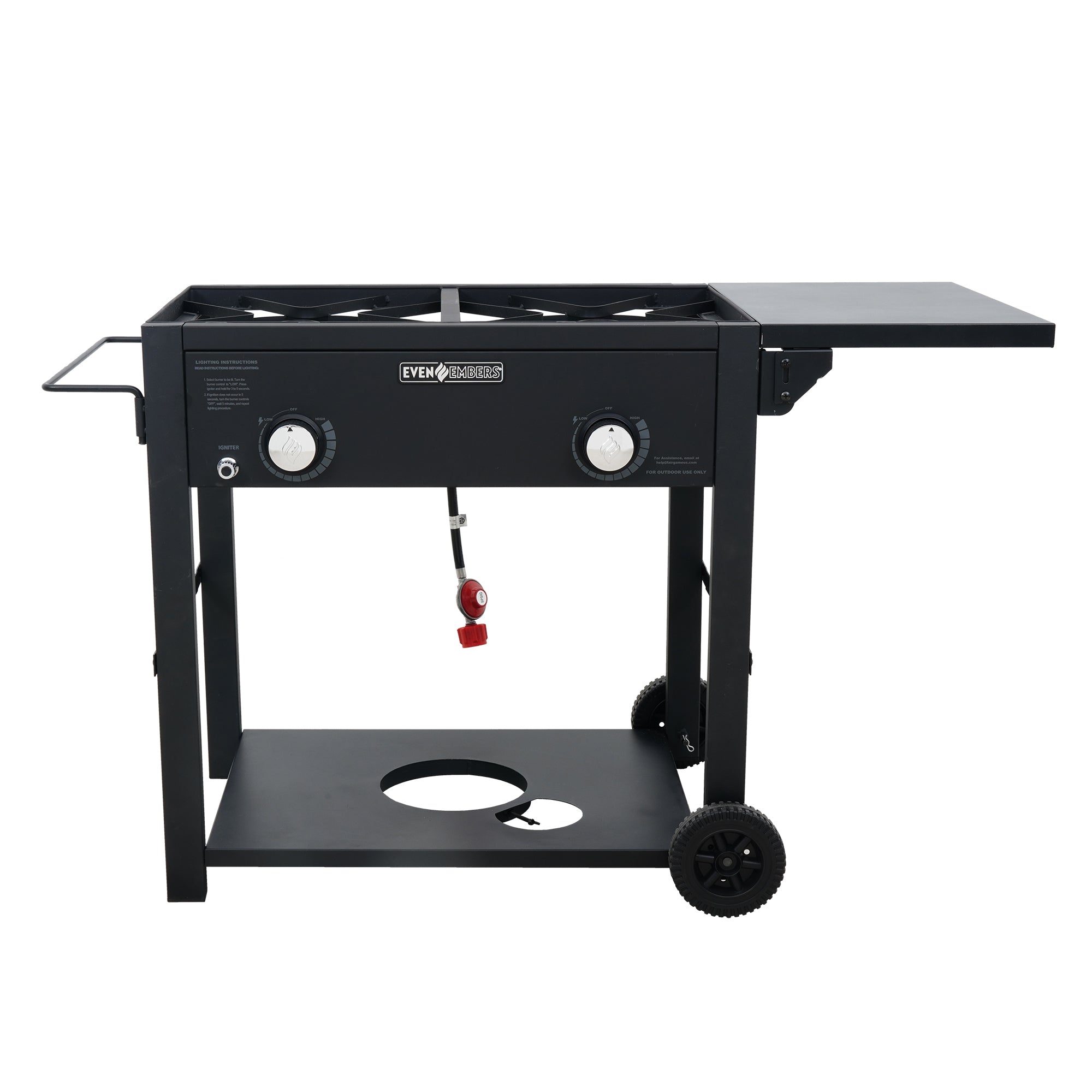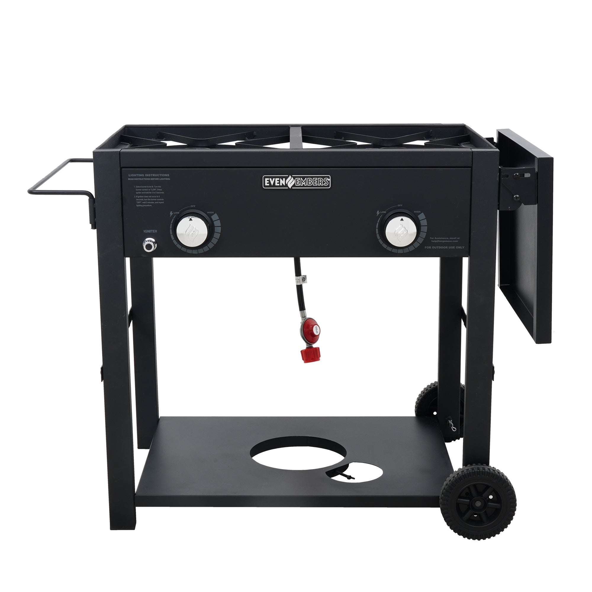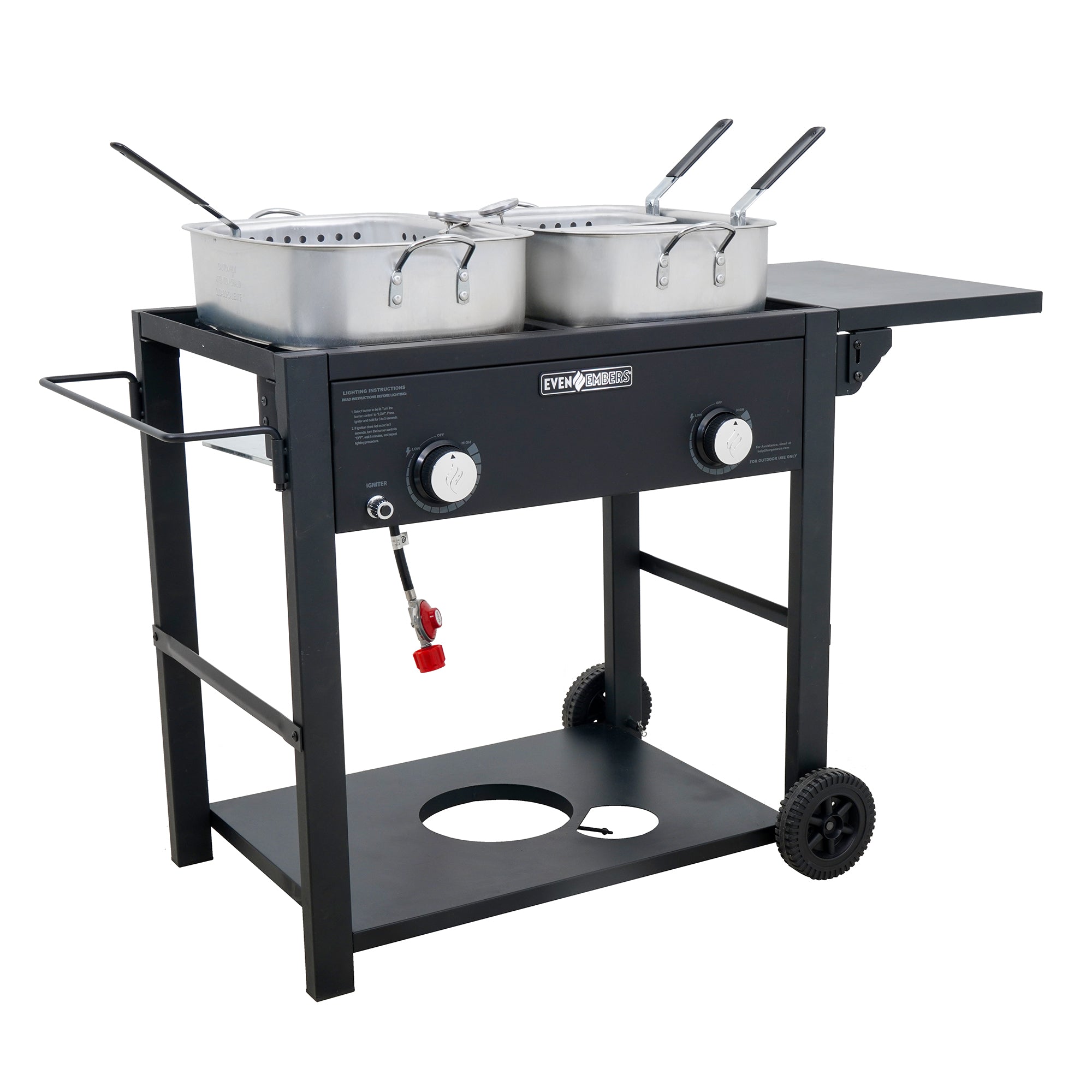 Built tough for outdoor cooking enthusiasts, the Even Embers 2-Burner Fryer Cart delivers powerful, professional-grade performance for all your frying favorites. With two 14 QT. aluminum frying pots and three frying baskets, you can easily fry up everything from wings to seafood with precision and speed. Dual burners with adjustable temperature control knobs produce an impressive 100,000 BTUs of heat, while the electronic ignition ensures quick and reliable startup every time. Equipped with two stainless steel thermometers, easily maintain accurate heat levels across both pots. Basket hangers and heat-resistant handles make handling food safe and easy, while the folding side shelf offers extra prep or storage space when you need it. Mounted on a rugged steel cart with two durable wheels, this fryer cart combines professional-grade performance with backyard-ready convenience.THIS APPLIANCE IS NOT FOR FRYING TURKEYS