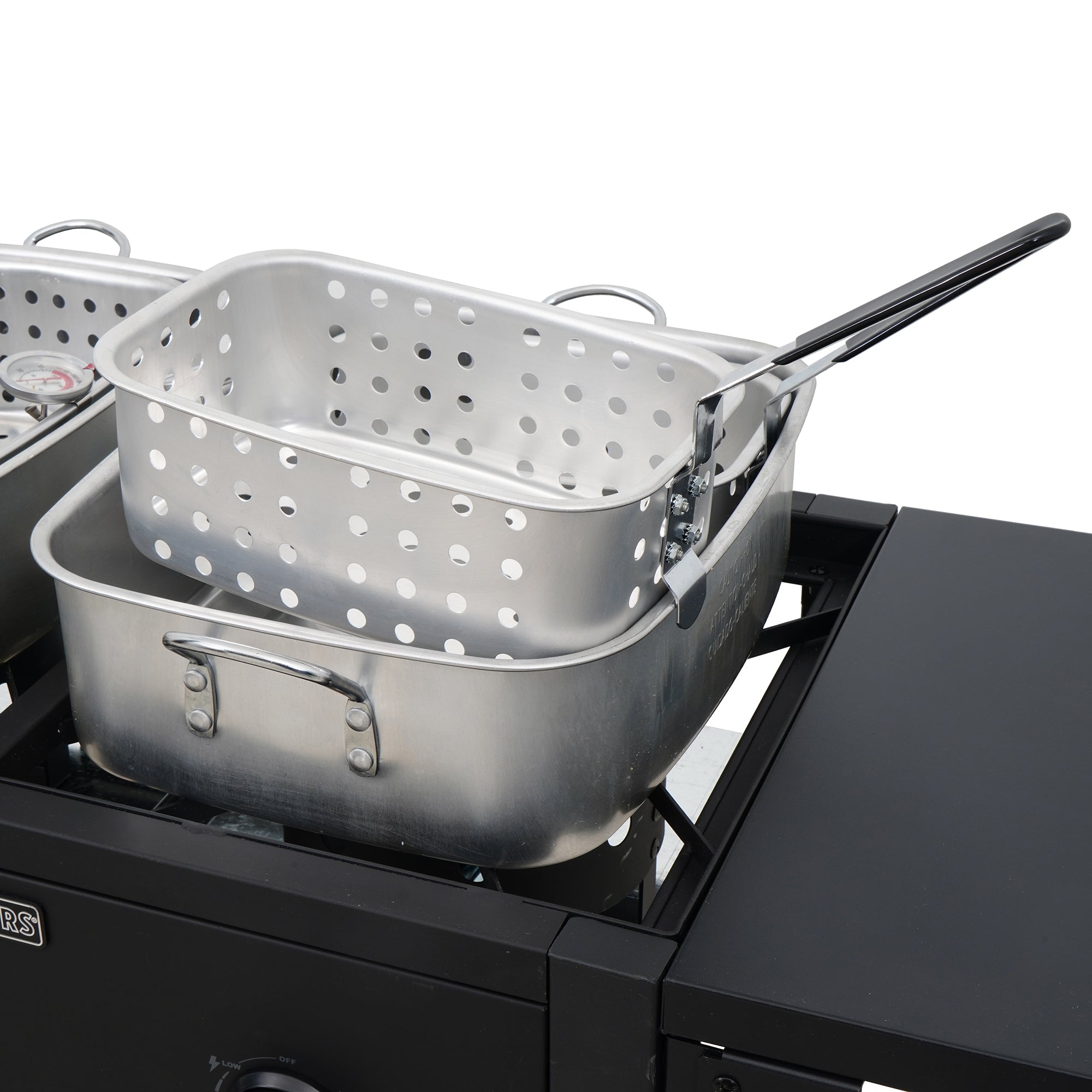 - Two 14 QT. professional-grade aluminum frying pots with three frying baskets