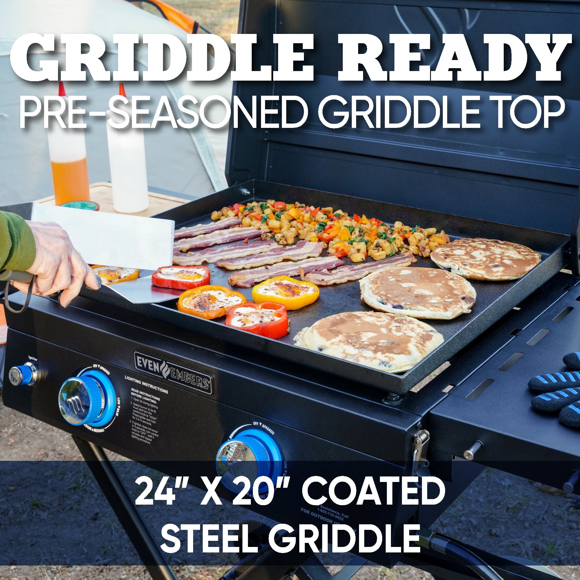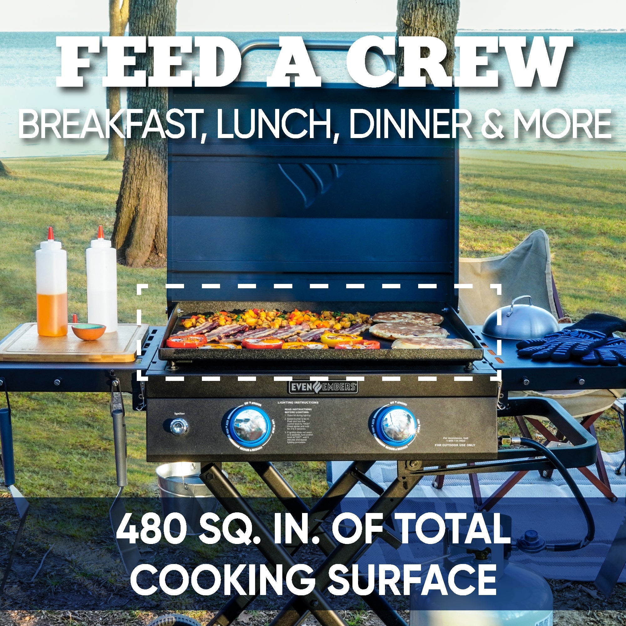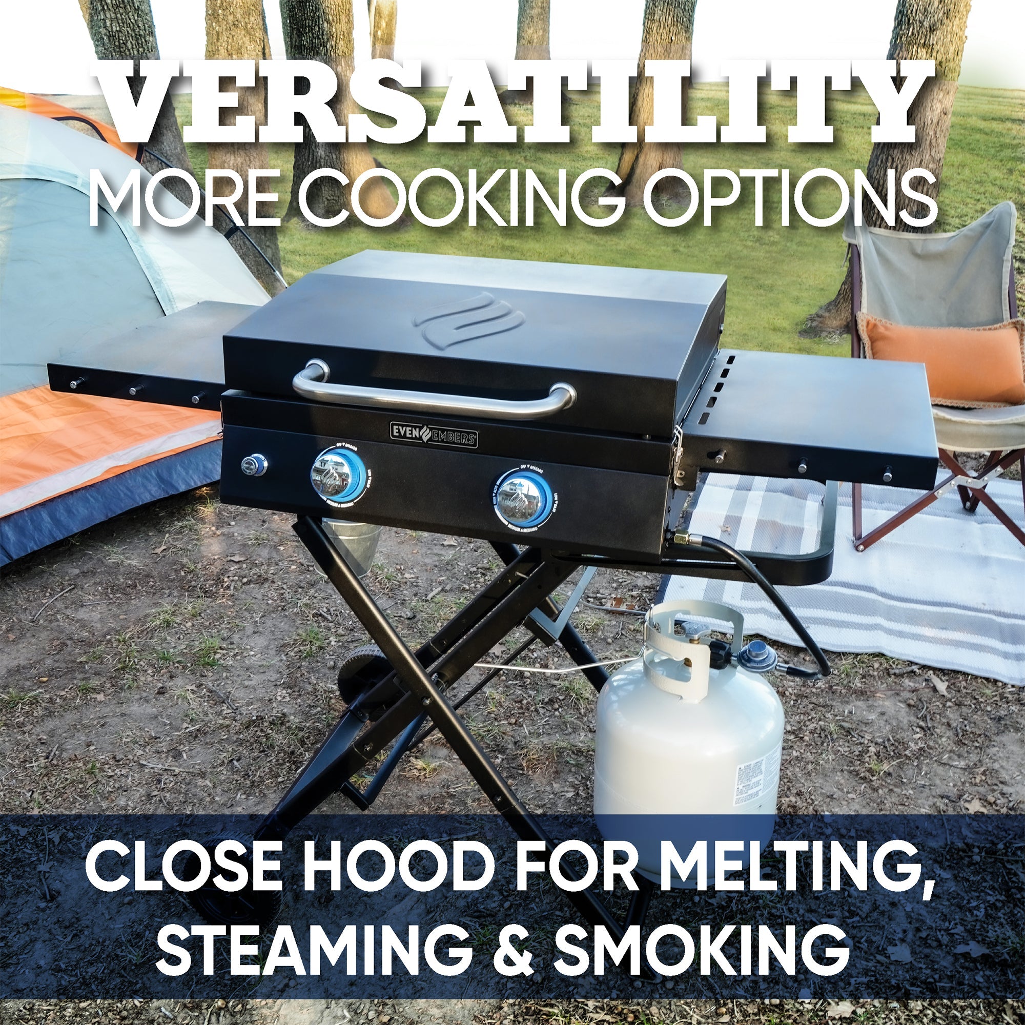 If you're looking for a versatile and easy-to-use outdoor cooking solution, look no further than the Even Embers 2-Burner Portable Gas Griddle with a collapsible stand! This 480 sq. in. griddle boasts a game-changing design that will make your outdoor adventures more enjoyable and less time-consuming. Featuring an integrated collapsible stand with 2 plastic wheels and removeable shelves, this griddle is easy to move and set up wherever you go. The 24" x 20" coated steel griddle is heated by 2 stainless steel burners with an electronic ignitor, delivering 32,000 BTUs. The fully functional locking steel lid allows easy transport and can be used to melt, steam, or bake, and protects the griddle when not in use. Six accessory peg hooks provide a convenient storage solution for your cookware and utensils. When you're done cooking, the collapsible stand pivots from the center and folds flat together, making transportation a breeze. Store the removeable side tables underneath the cart when not in use for added convenience. Whether you're tailgating, camping, or simply enjoying a day out with family and friends, this griddle is a must-have for anyone who loves outdoor cooking.