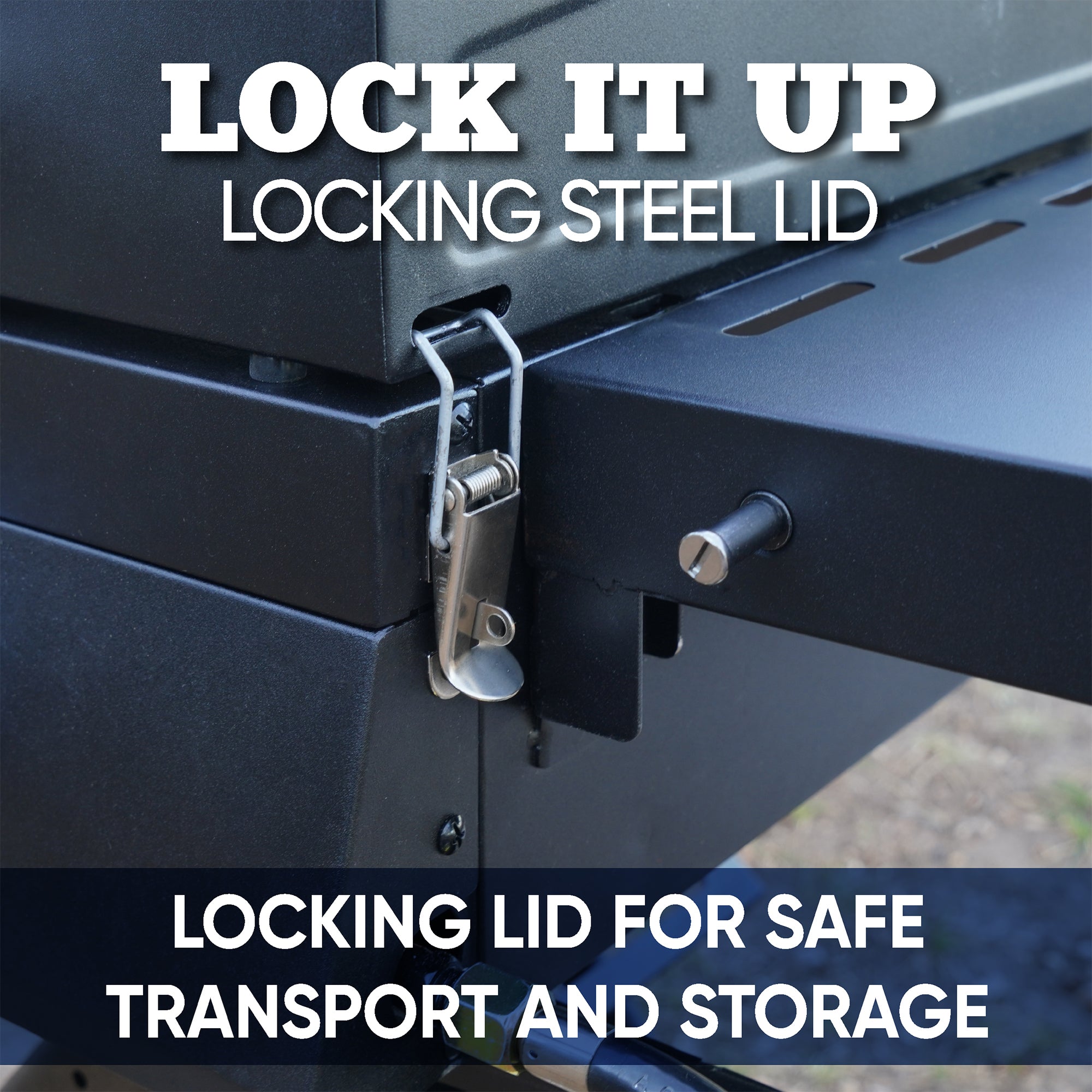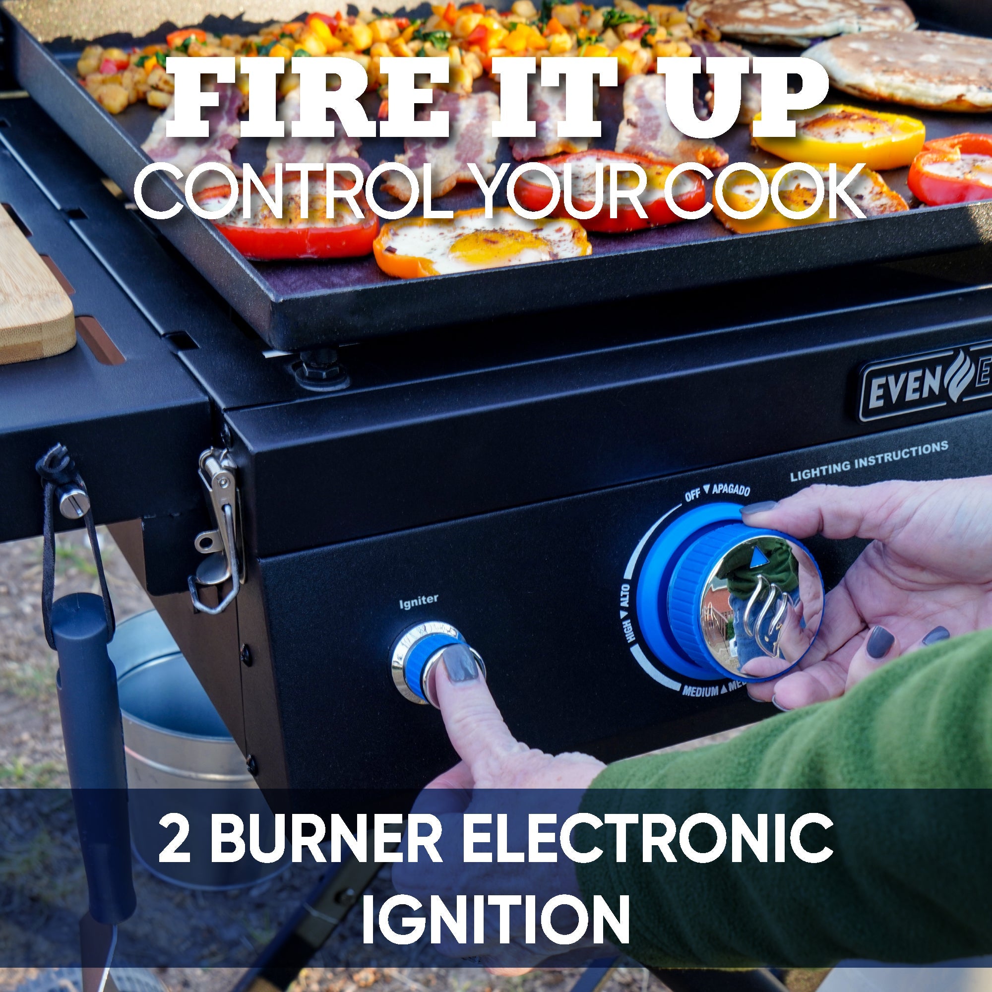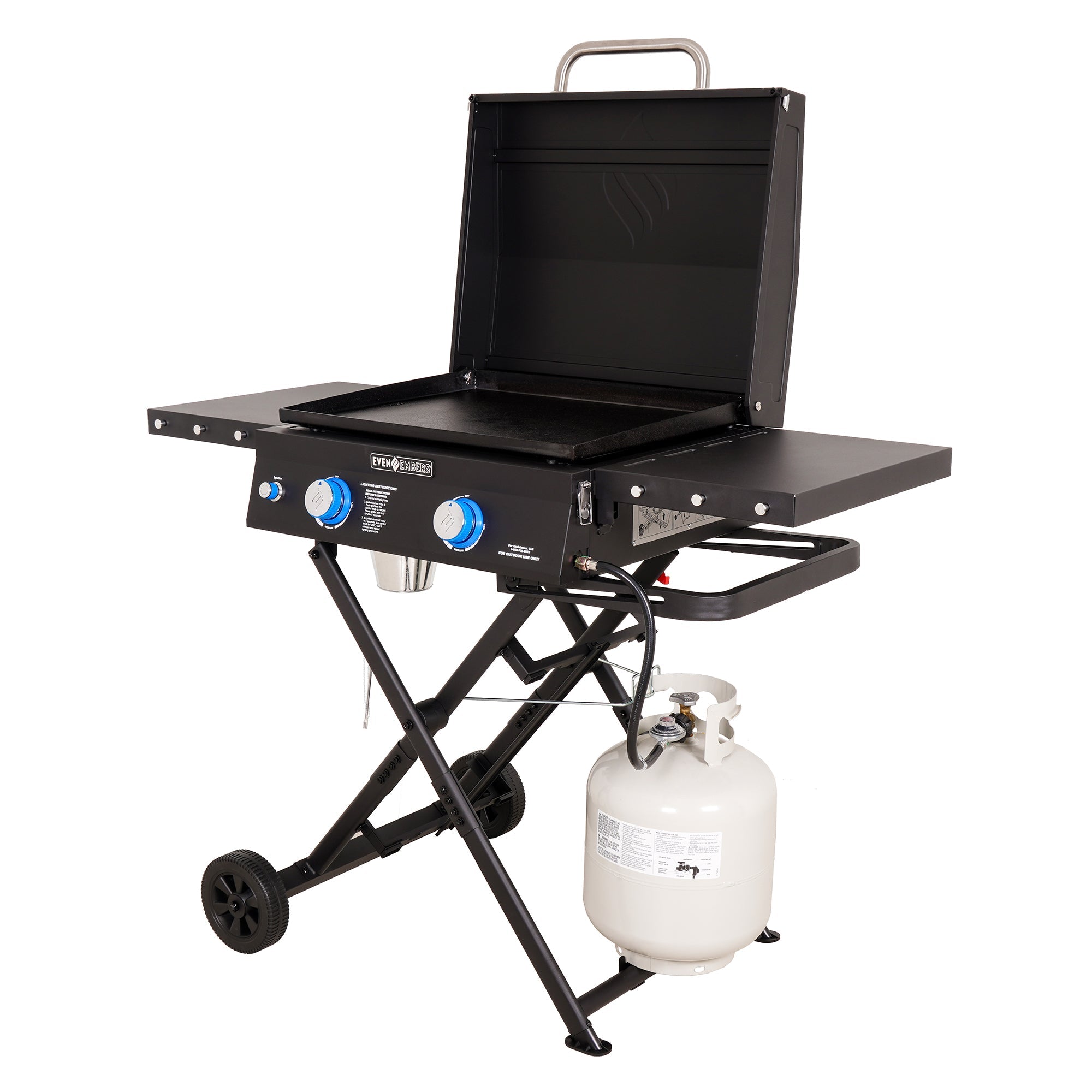 If you're looking for a versatile and easy-to-use outdoor cooking solution, look no further than the Even Embers 2-Burner Portable Gas Griddle with a collapsible stand! This 480 sq. in. griddle boasts a game-changing design that will make your outdoor adventures more enjoyable and less time-consuming. Featuring an integrated collapsible stand with 2 plastic wheels and removeable shelves, this griddle is easy to move and set up wherever you go. The 24" x 20" coated steel griddle is heated by 2 stainless steel burners with an electronic ignitor, delivering 32,000 BTUs. The fully functional locking steel lid allows easy transport and can be used to melt, steam, or bake, and protects the griddle when not in use. Six accessory peg hooks provide a convenient storage solution for your cookware and utensils. When you're done cooking, the collapsible stand pivots from the center and folds flat together, making transportation a breeze. Store the removeable side tables underneath the cart when not in use for added convenience. Whether you're tailgating, camping, or simply enjoying a day out with family and friends, this griddle is a must-have for anyone who loves outdoor cooking.