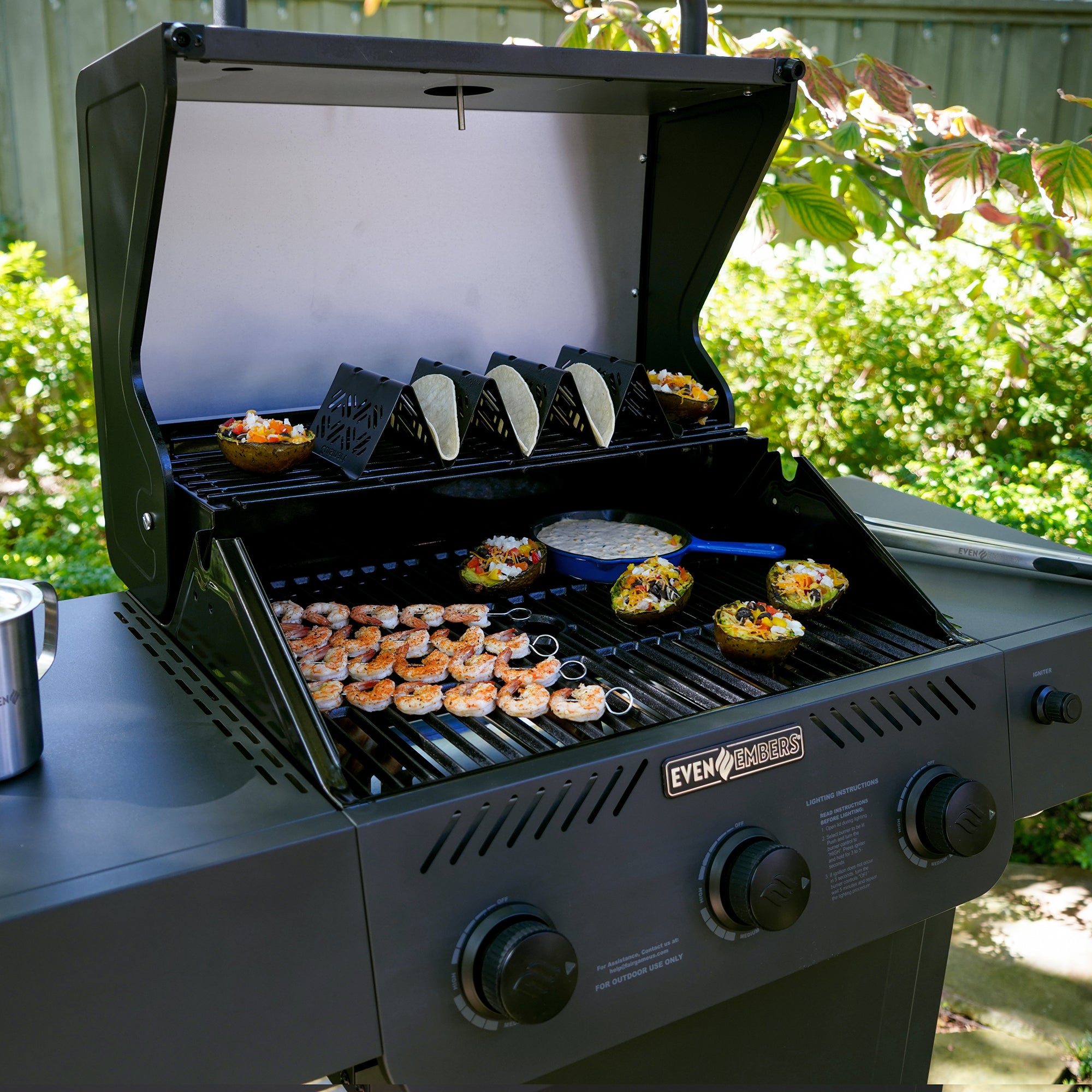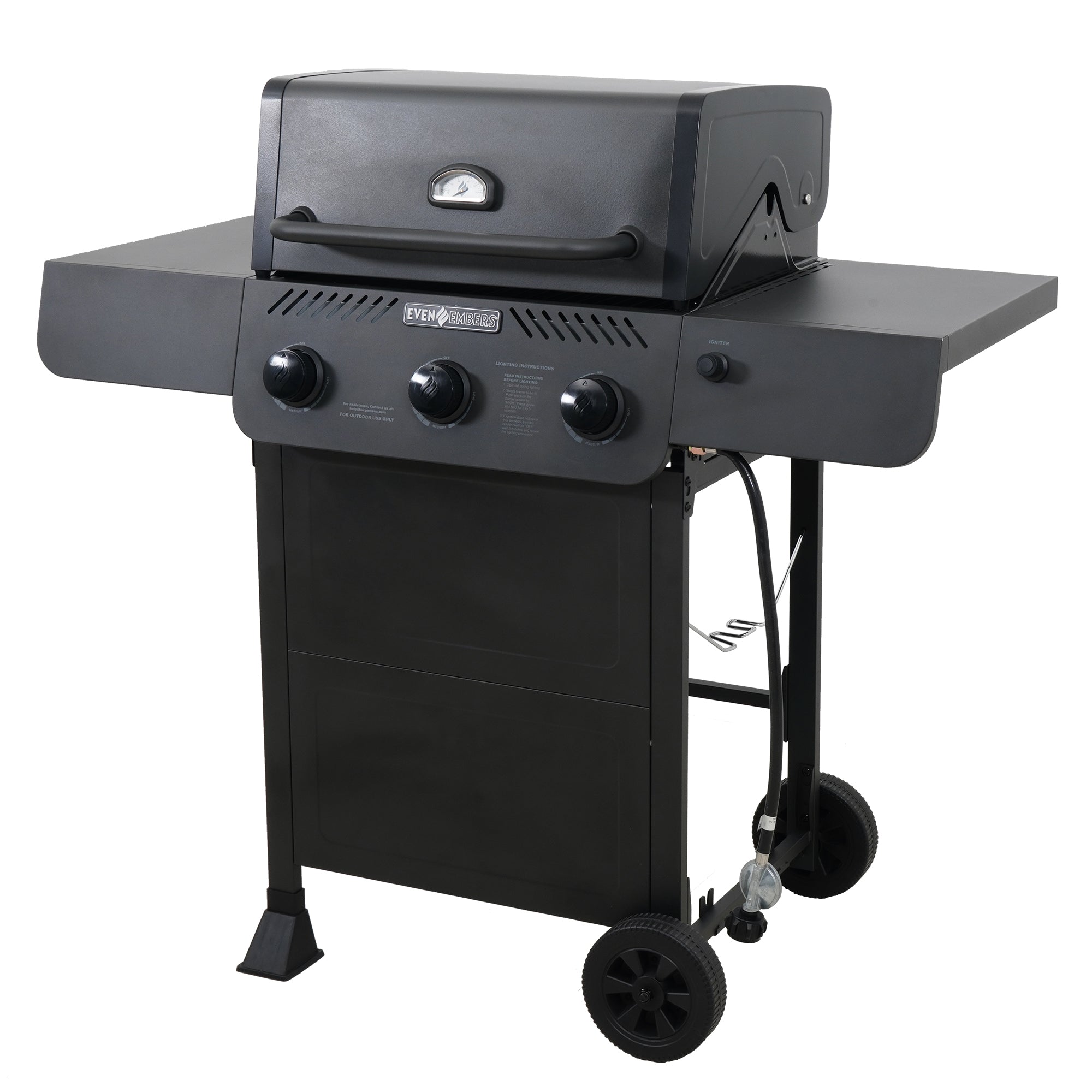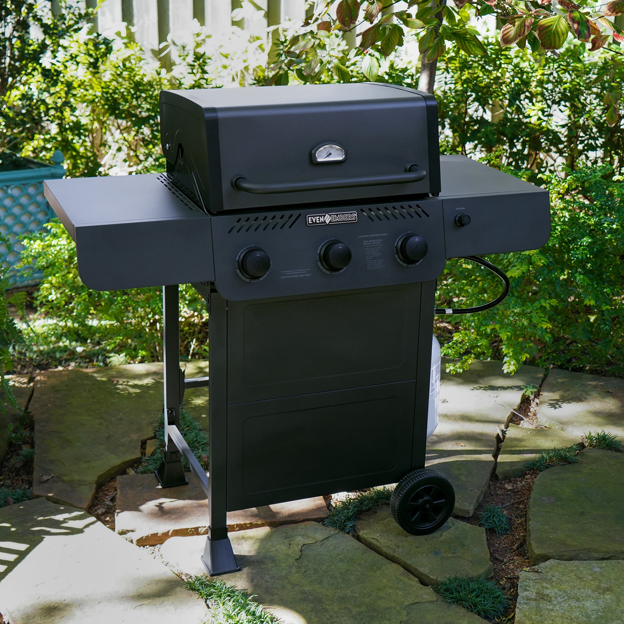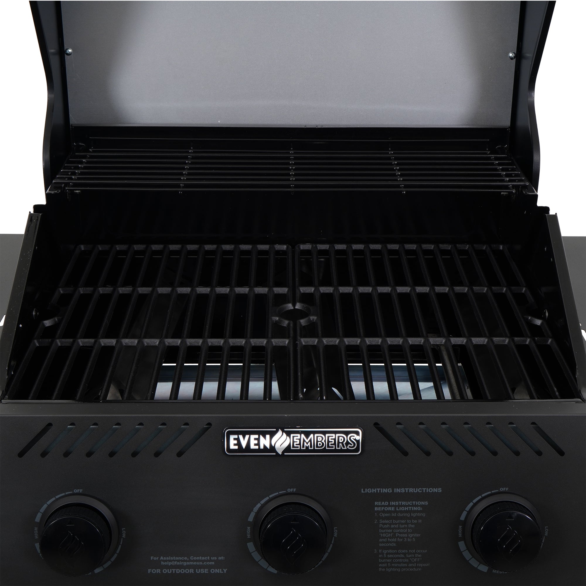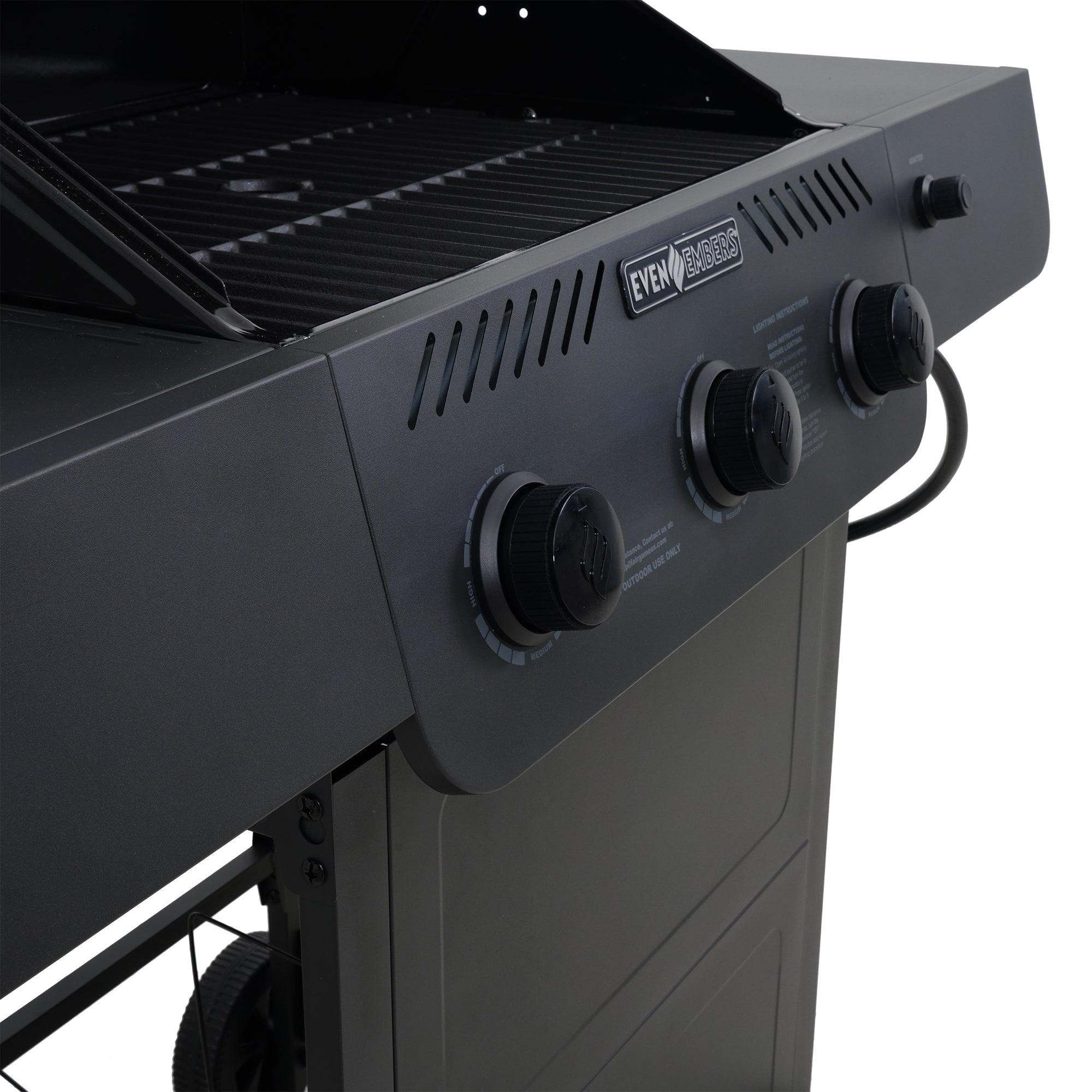 Bring dependable performance to your backyard with the Even Embers 3-Burner Gas Grill. Delivering 34,500 BTUs across three stainless steel burners, each with independent electronic ignition, this grill offers reliable performance every time you fire it up. With 550 square inches of total cooking space, you'll have plenty of room for everything from quick weeknight dinners to full weekend cookouts. Durable porcelain-coated cast-iron cooking grates retain heat for even searing, while the warming rack keeps food hot or lightly toasts buns. A built-in temperature gauge and precise control knobs help you grill with confidence, and two sturdy wheels make it easy to move wherever the action is. Fire up great meals all season long with the Even Embers 3-Burner Gas Grill.