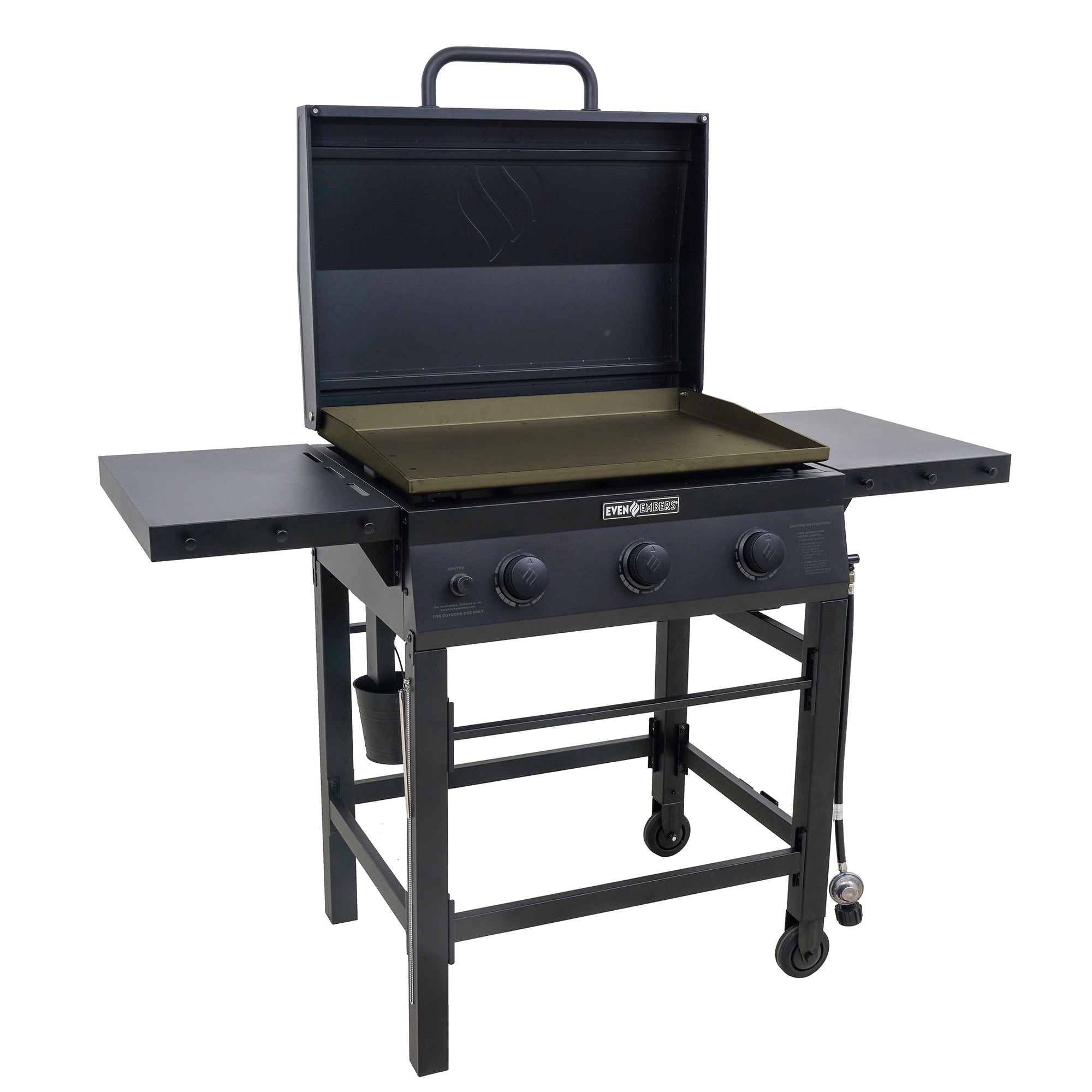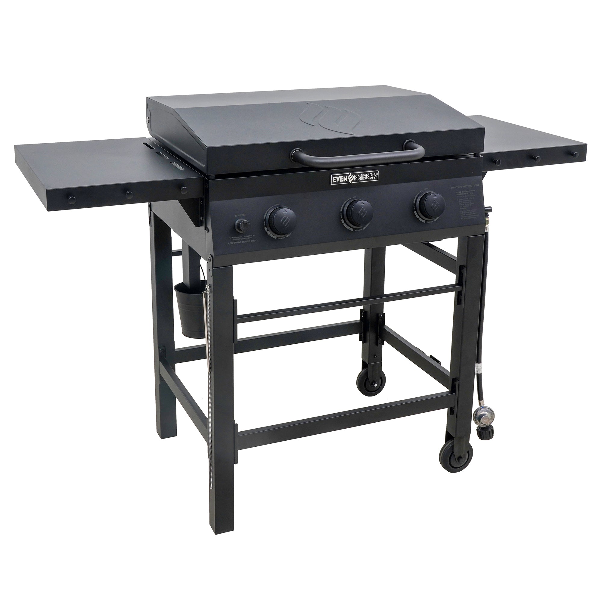 The Even Embers 3-Burner Griddle delivers powerful heat, versatile cooking, and convenience in a compact outdoor griddle experience. With 560 square inches of total cooking space and three stainless-steel burners producing 39,000 BTUs, enjoy multiple cooking zones all on one durable pre-seasoned steel griddle top. The fully functional steel lid protects the griddle when not in use and can also be used to melt, steam, or bake your favorite dishes while cooking. Foldable side shelves provide additional prep and storage space, while six accessory hooks keep your grilling tools organized and within reach. Cleanup is simple thanks to the large built-in grease bucket, and the included heavy-duty 300D custom-fitted cover ensures your griddle stays protected from the elements. Equipped with two durable wheels, this griddle is easy to move around your patio or deck, making it perfect for breakfast, lunch, or dinner outdoors.