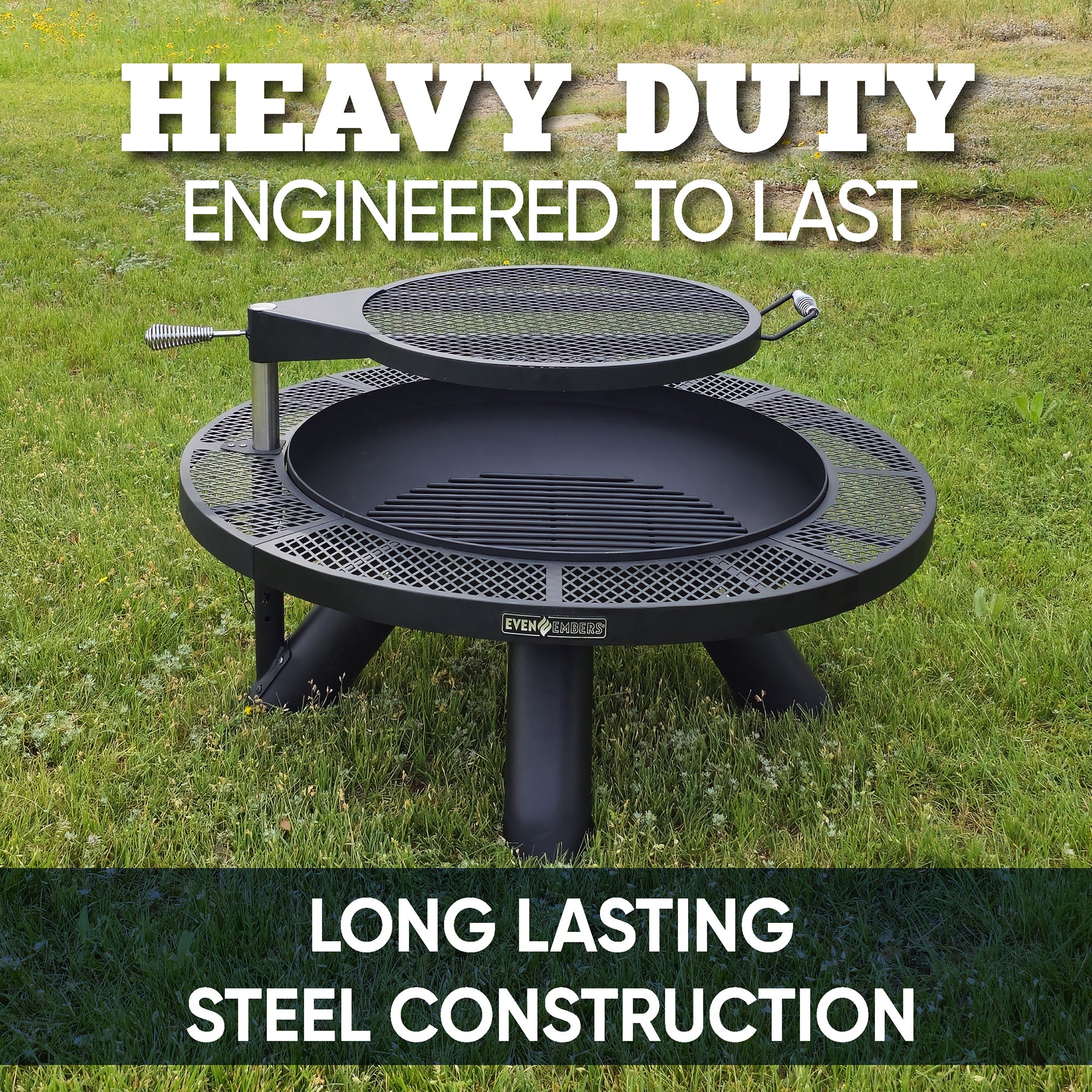Bring your outdoor gatherings around the Even Embers 44-inch Round Fire Pit with Cooking Grate, the ultimate backyard essential. Constructed from heavy-gauge steel, this fire pit ensures durability and longevity for countless cozy gatherings. The 24-inch coated steel cooking grate with 452 square inches of cooking space smoothly swivels 360 degrees, making outdoor cooking a breeze. The locking pin on the adjustable height cooking grate ensures precise height adjustments, allowing you to cook to perfection. Equipped with an 8mm charcoal or wood grate, this fire pit offers versatile fuel options for your fireside feasts. The 6-inch wide outer ledge adds a touch of convenience, providing a handy space for utensils or your favorite fire pit snacks. Elevate your outdoor experiences with the multifunctional 44 in. Round Fire Pit with Cooking Grate by Even Embers.