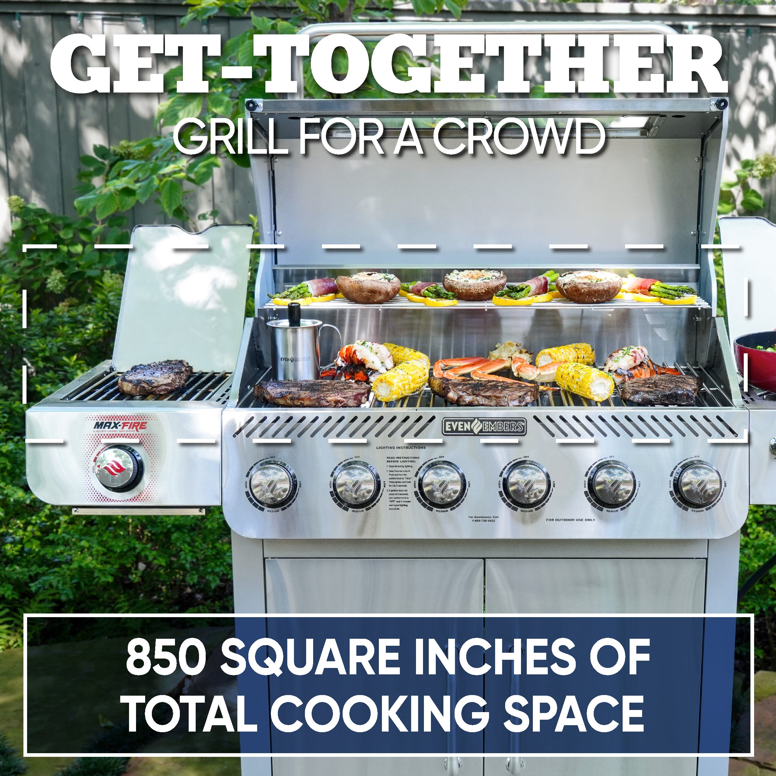Take your grilling game to the next level with the Even Embers 6-Burner Gas Grill with Side and Sear Burners. Featuring six stainless steel burners that deliver an impressive 49,800 BTUs, this grill is built for serious backyard chefs. With 850 square inches of total cooking space, 552 square inches of primary space, and a spacious 298 square inches on the warming rack, you'll have all the room you need to cook for family and friends. Monitor your grilling progress effortlessly through the appliance-grade glass viewing window, and enjoy unmatched control with independent electronic ignition on every burner for reliable and precise startups. Elevate your cooking options with the 12,000 BTU ceramic Max Fire Sear Burner on the left side table, perfect for achieving restaurant-quality sears, and the 12,000 BTU stainless steel side burner on the right side table, ideal for preparing sauces or sides. The durable stainless steel hood, stainless steel firebox, and premium stainless steel cooking grates ensure long-lasting performance. With 3 accessory peg hooks and four locking swivel casters, this grill combines functionality with mobility, making it a versatile centerpiece for any outdoor kitchen.