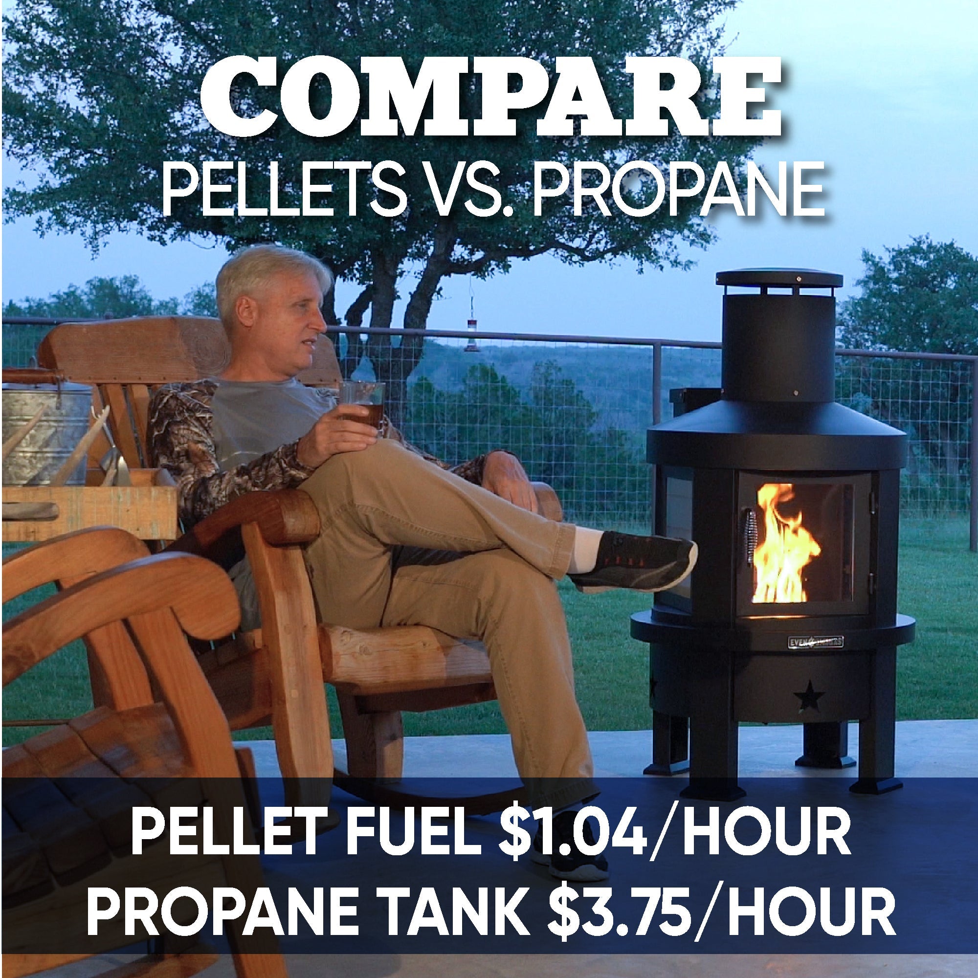 We've got your backyard covered year-round with the Even Embers Pellet Chiminea. The Even Embers Pellet Chiminea brings MORE Efficient Heat, MORE Control, MORE Fuel Efficiency, and MORE Cost Savings to your outdoor heating experience. With over one hundred square feet of heating space producing 70,000 total BTUs, enjoy twice the heat compared to your traditional propane heater. After assembling, fill the 25 lb. pellet hopper with your choice of hardwood pellets, apply a small amount of lighter fluid onto the pellets and use a lighter to ignite the pellets. Sit back and relax by the enclosed flame through the large glass viewing windows for the perfect campfire ambiance. This chiminea outperforms traditional propane heaters by heating from the ground up for more efficient heating, providing more heat fueled by hardwood pellets and saving up to 75% of the average fuel cost of traditional propane units. Easily adjust the pellet flow system from low to high settings, providing the perfect warmth solution for you and your guests. Enjoy no auger, no cords, and no hassle. The easy 2-step ash cleanout system provides a quick and easy clean-up process after every use. Heat up your backyard patio, local tailgate, and all other outdoor gatherings with the heater designed to provide an even heat experience from your toes to your nose.