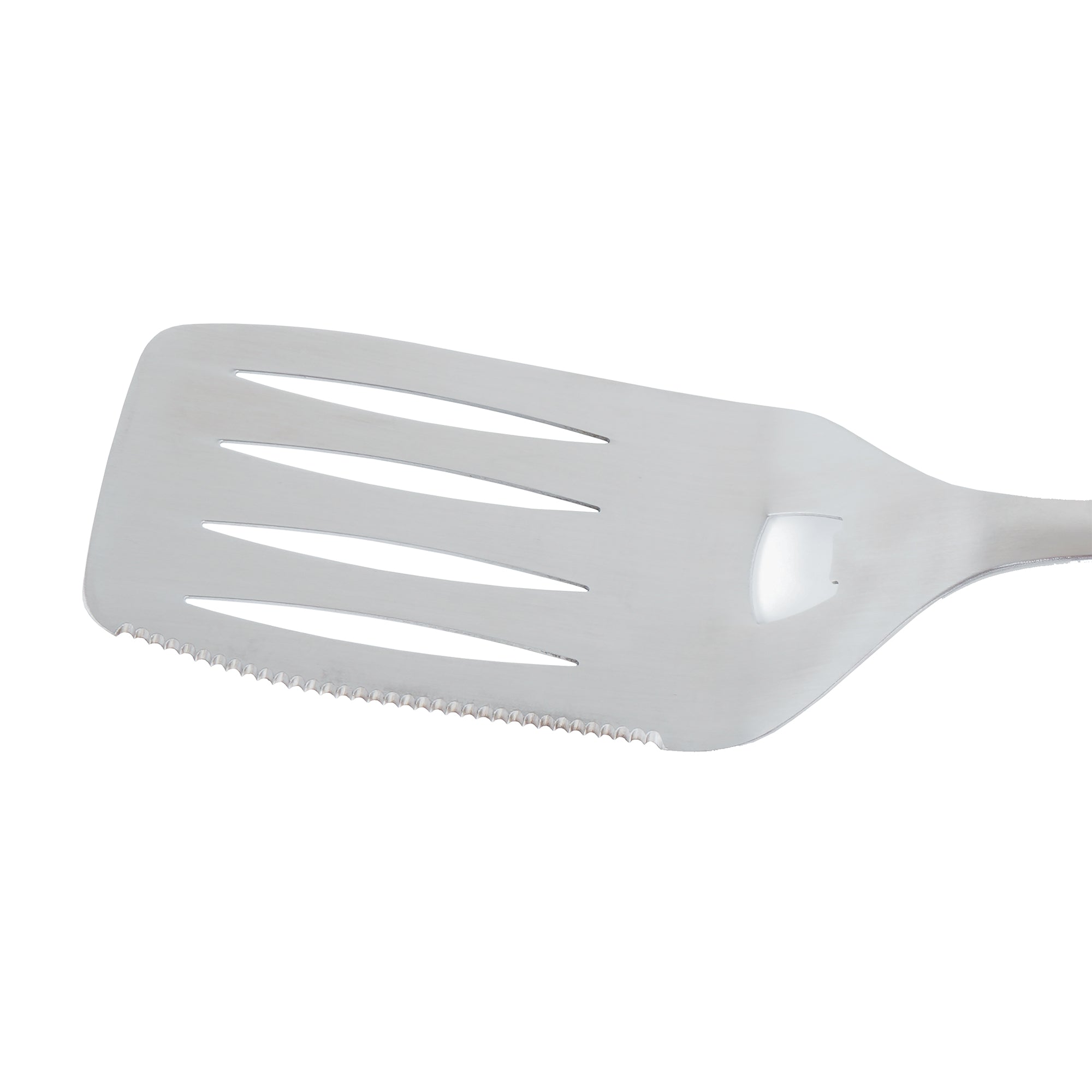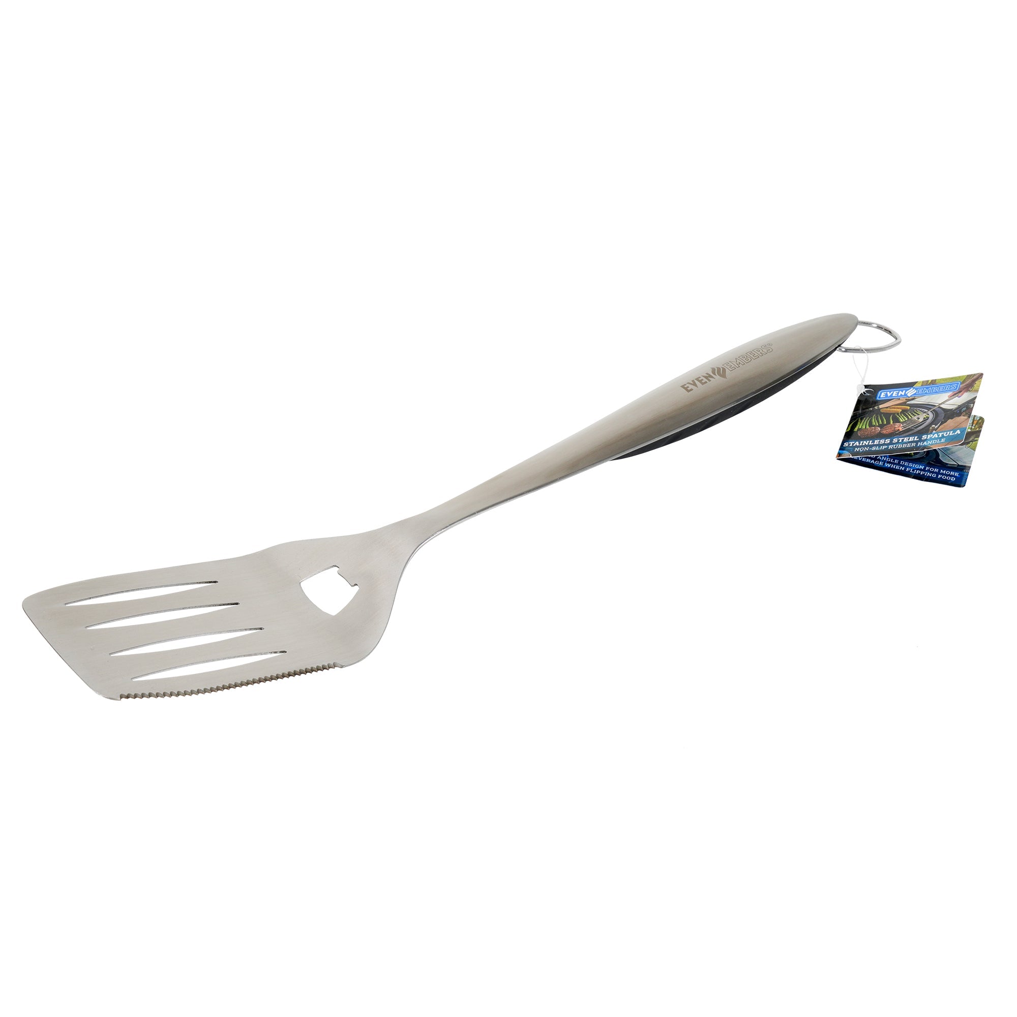 The Even Embers Stainless Steel Spatula is the perfect tool to upgrade your grilling game. Constructed with heavy duty stainless steel, this spatula is built to last and features a ergonomic non-slip grip handle allowing you to flip and maneuver food with confidence. Crack open a cold one with the built-in bottle opener and cut with precision with the serrated knife edge. Whether you're flipping pancakes, turning burger patties, or just scooping grilled potatoes for your backyard party, this convenient and versatile tool will effortlessly make any cooking task easier.