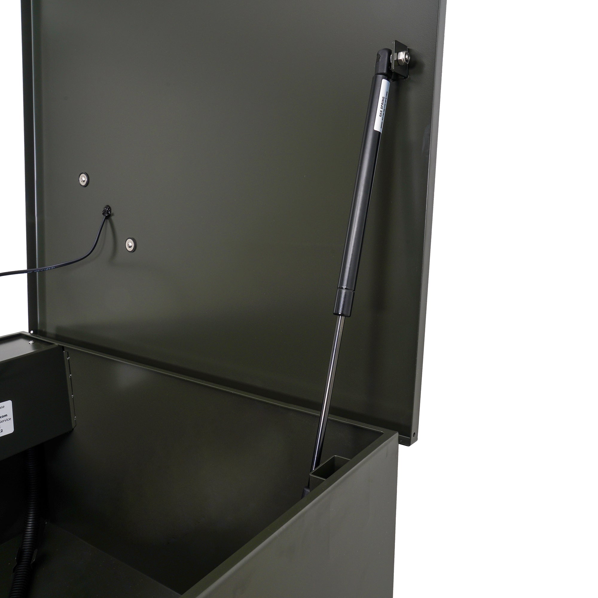 - The spring-latched lid, equipped with a gas strut and low-profile design, provides convenient access to the corn feeder for refills.