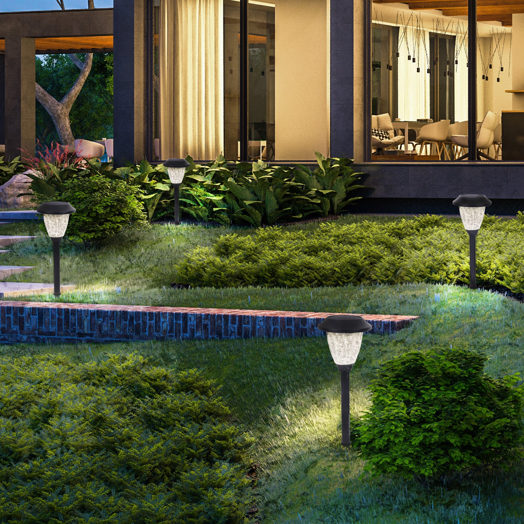 Bring the decor outdoors with the 4-Pack 20 Lumen Solar Lights by Lux Landscape. The stylish glass housing, featuring a decorative design, includes an integrated solar panel that charges the battery during the daytime. Insert the stake into the ground to brighten up your outdoor space year-round.