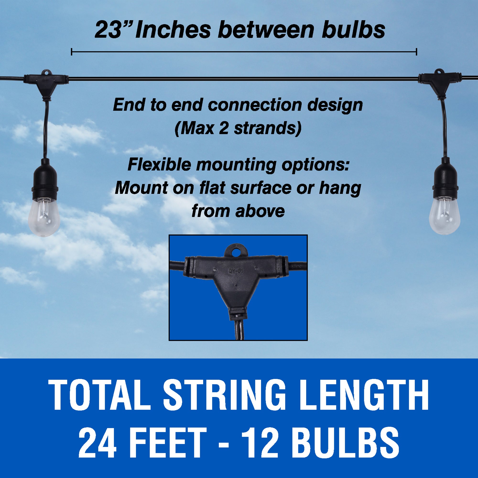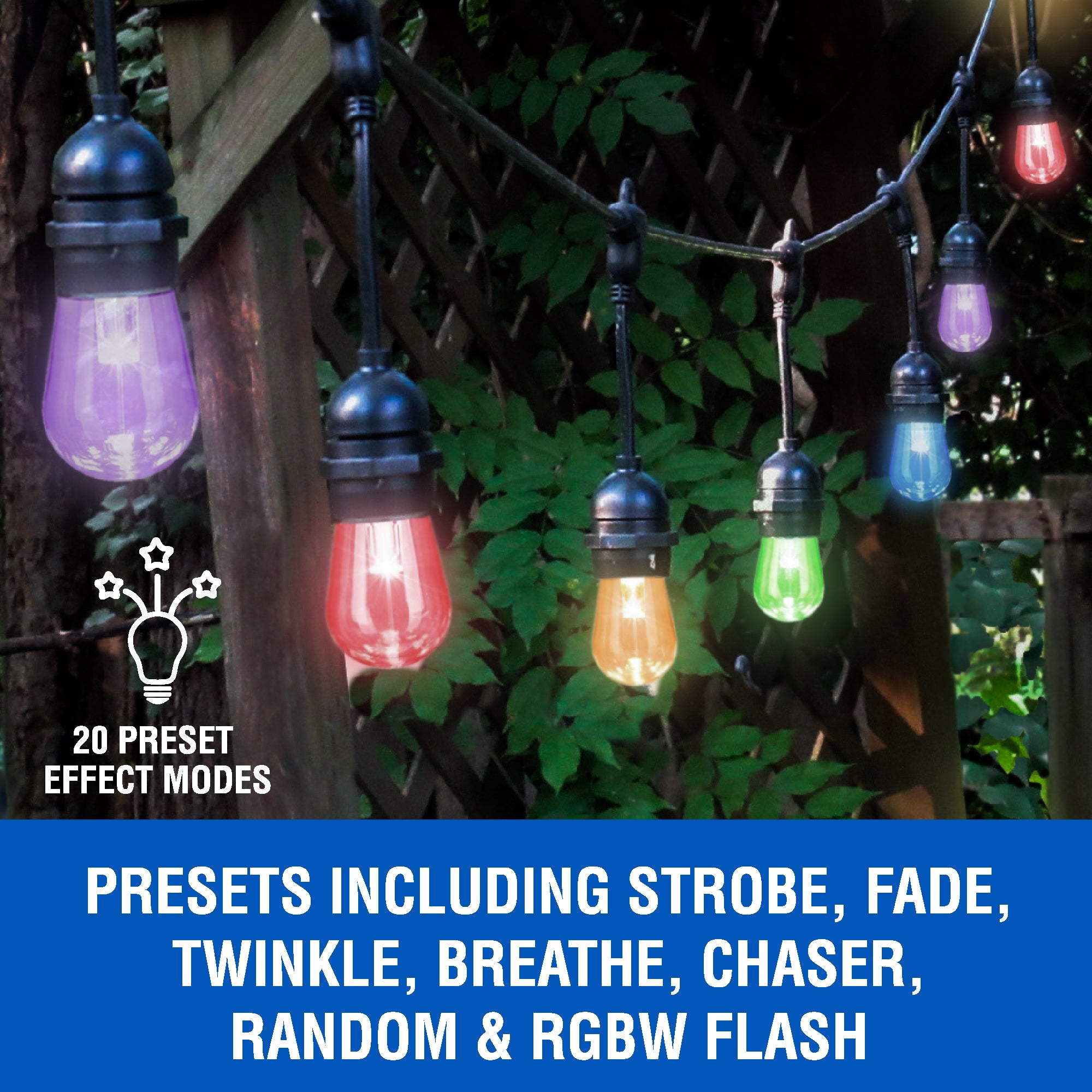 Illuminate your indoor or outdoor spaces with Lux Landscape LED Multi-Color String Lights with RF remote. Create the perfect ambiance for celebrations, holidays, or family get-togethers with your choice of 12 lively colors, custom lighting presets and entertaining effect modes. Easy to install and maintain energy saving LED bulb string lights are ideal for daily use. Enjoy peace of mind with safe, shatter resistant bulbs that have been designed to be durable and weather resistant for year-round use.
