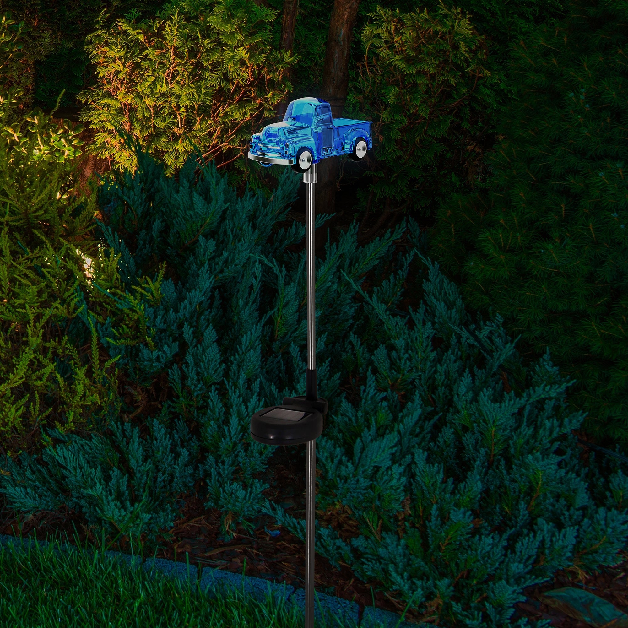 Bring the patriotic spirit outdoors with the Lux-Landscape Truck Light. This outdoor solar light features an integrated solar panel that charges the battery during the daytime. Insert the stake into the ground to brighten up your outdoor space this summer season.