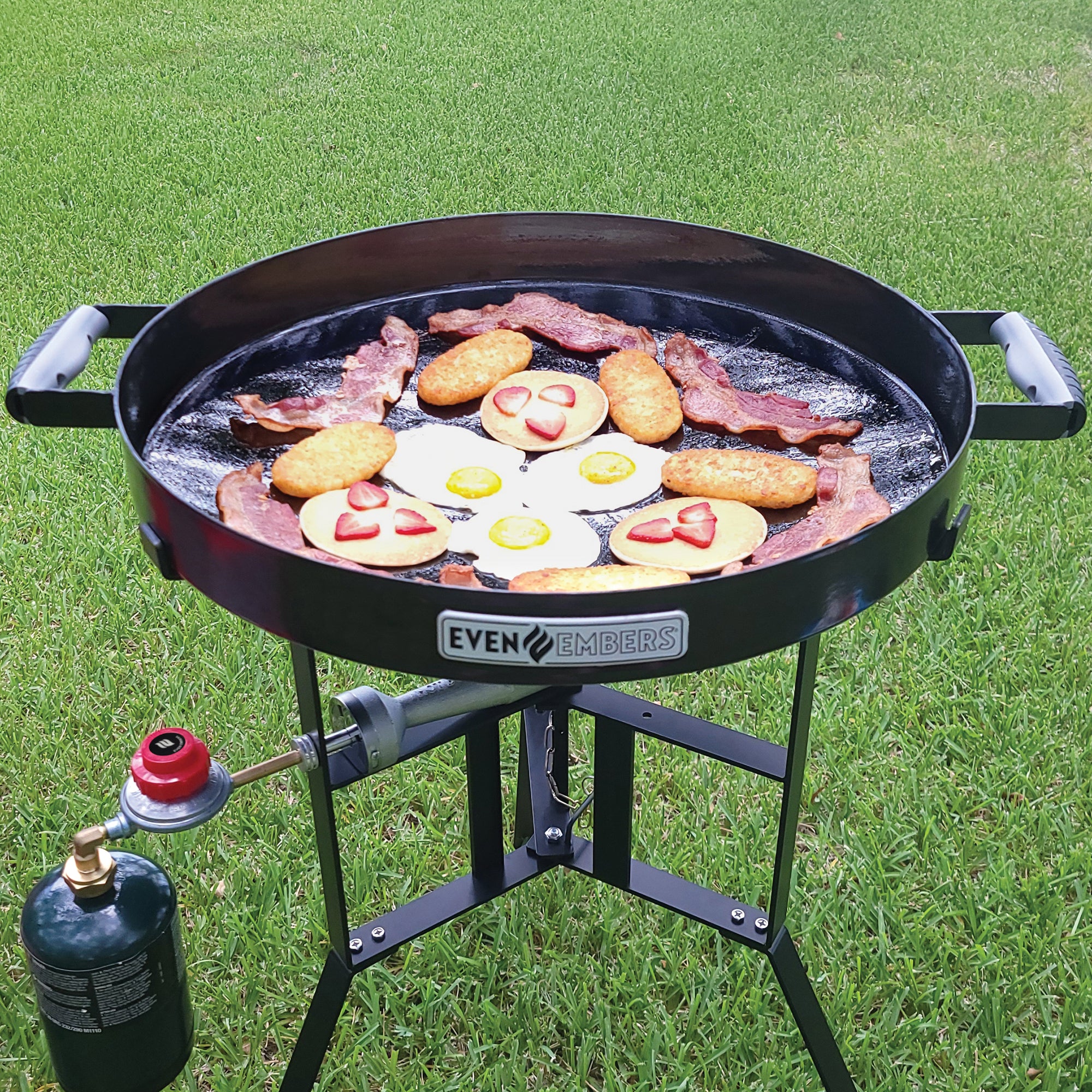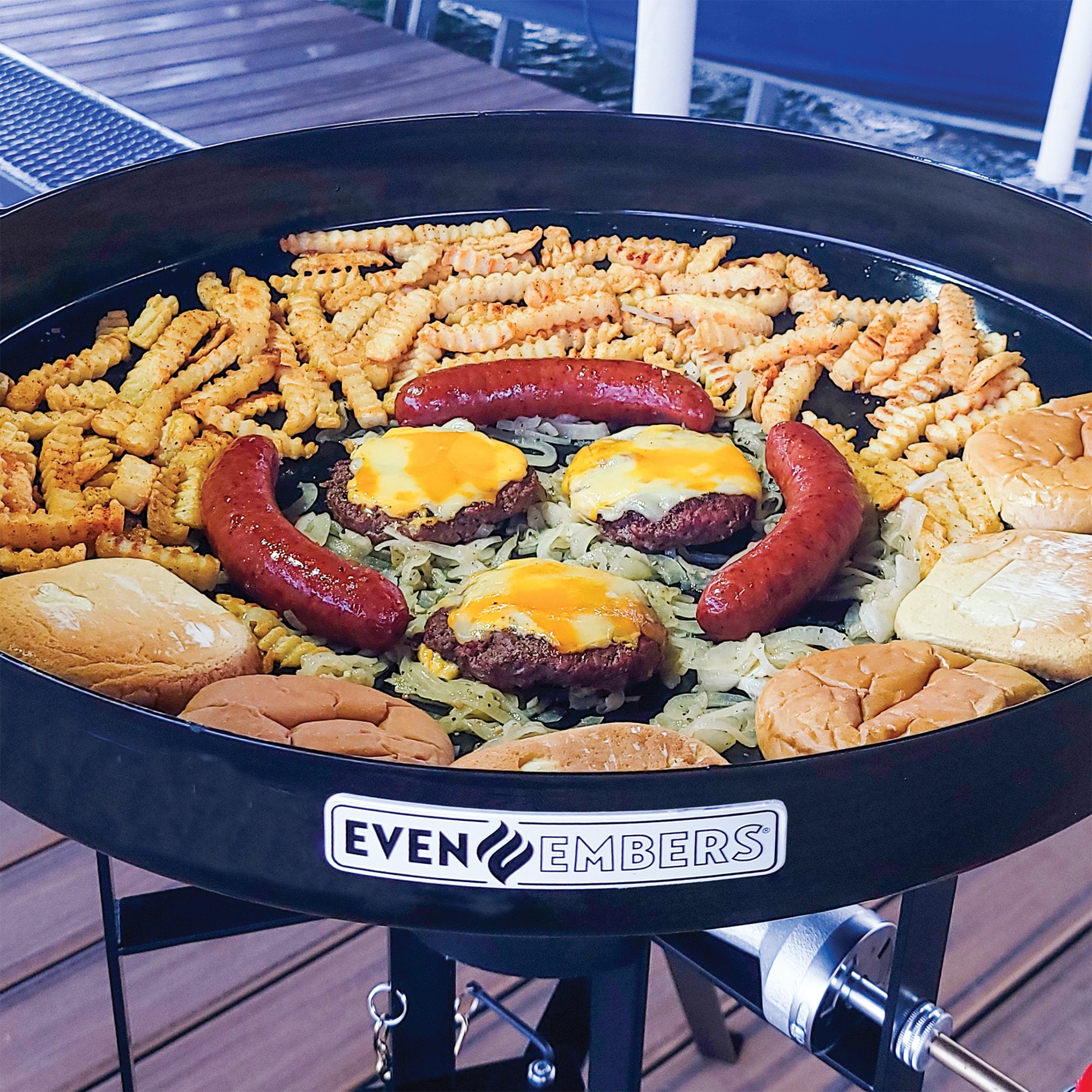 Cook like a pro wherever you go with the Even Embers Portable Grab-N-Go Grill, the ultimate companion for outdoor cooking enthusiasts. With a generous 22 in. Dia cooking surface (380 sq. in. of cooking space), this versatile cooker allows you to fry, grill, stir fry, simmer, saute, sear, melt, boil, steam, and braise, all in one compact unit. Designed with convenience in mind, the stand collapses and folds flat for easy storage, making it perfect for tailgating, camping, RV-ing, hunting, fishing, picnics, BBQs, and more. Featuring three distinct cooking zones (high, medium, and low) powered by a single 14,000 BTU burner, you'll have the control and flexibility to cook any meal to perfection.