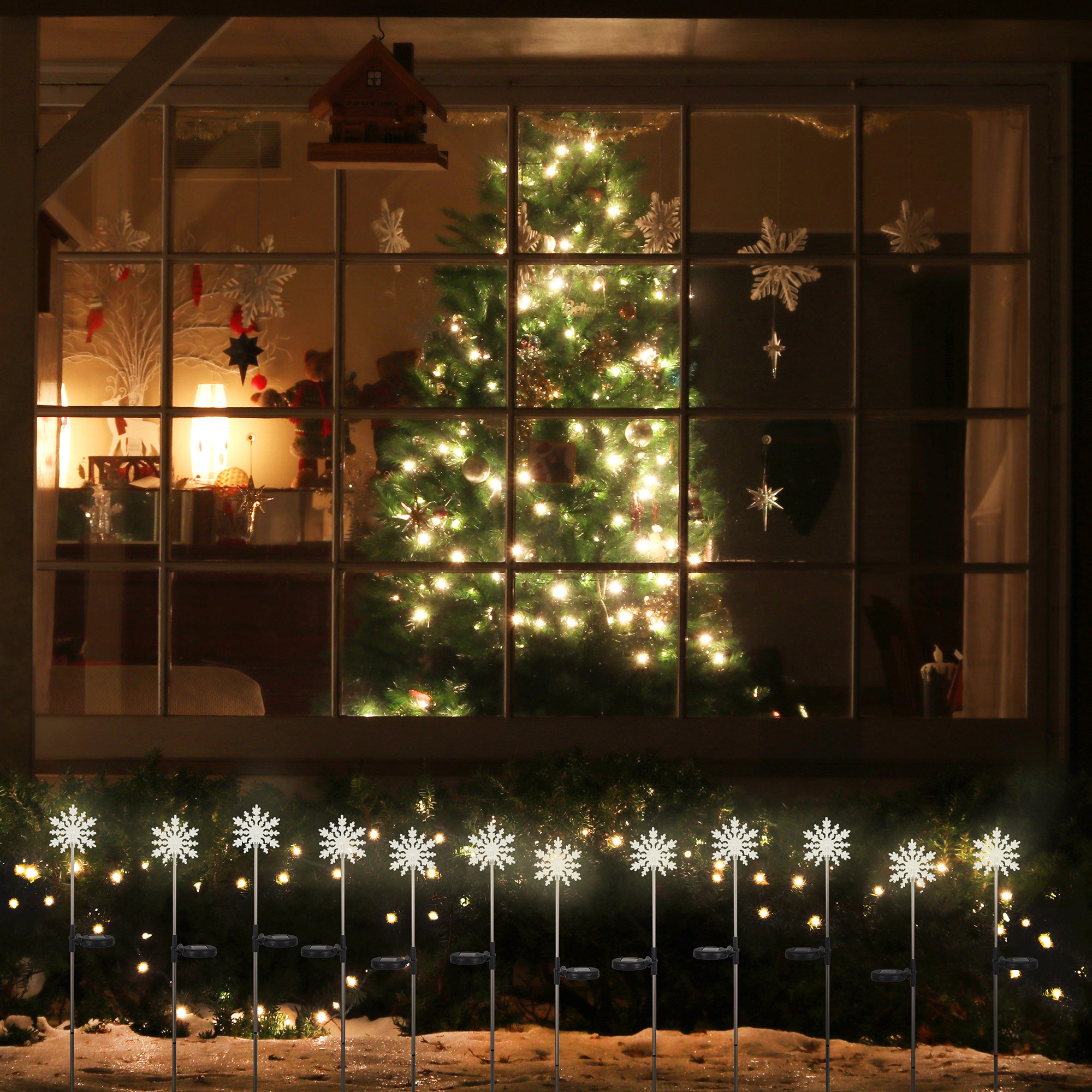 - Snowflake-shaped solar light with an integrated solar panel that charges the battery