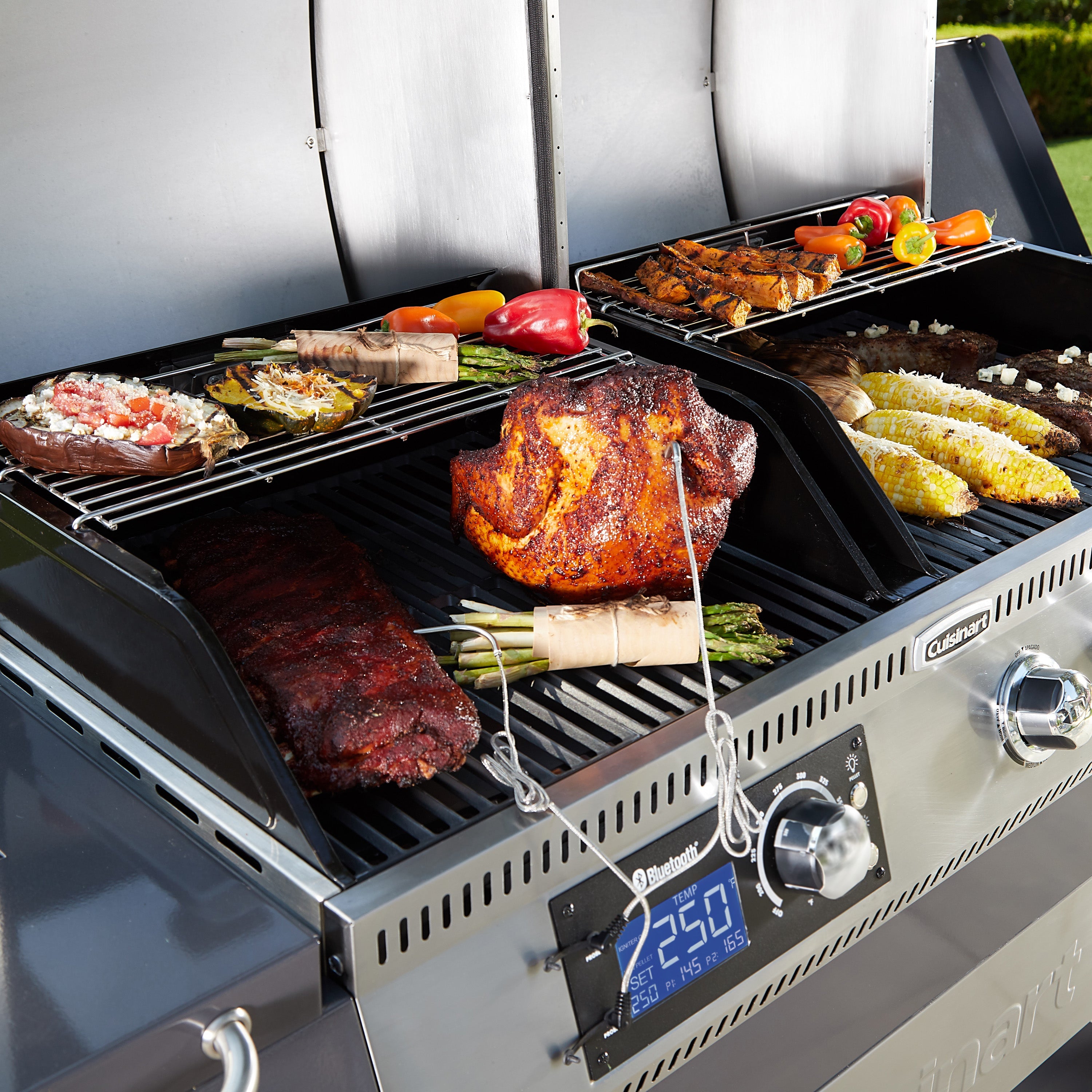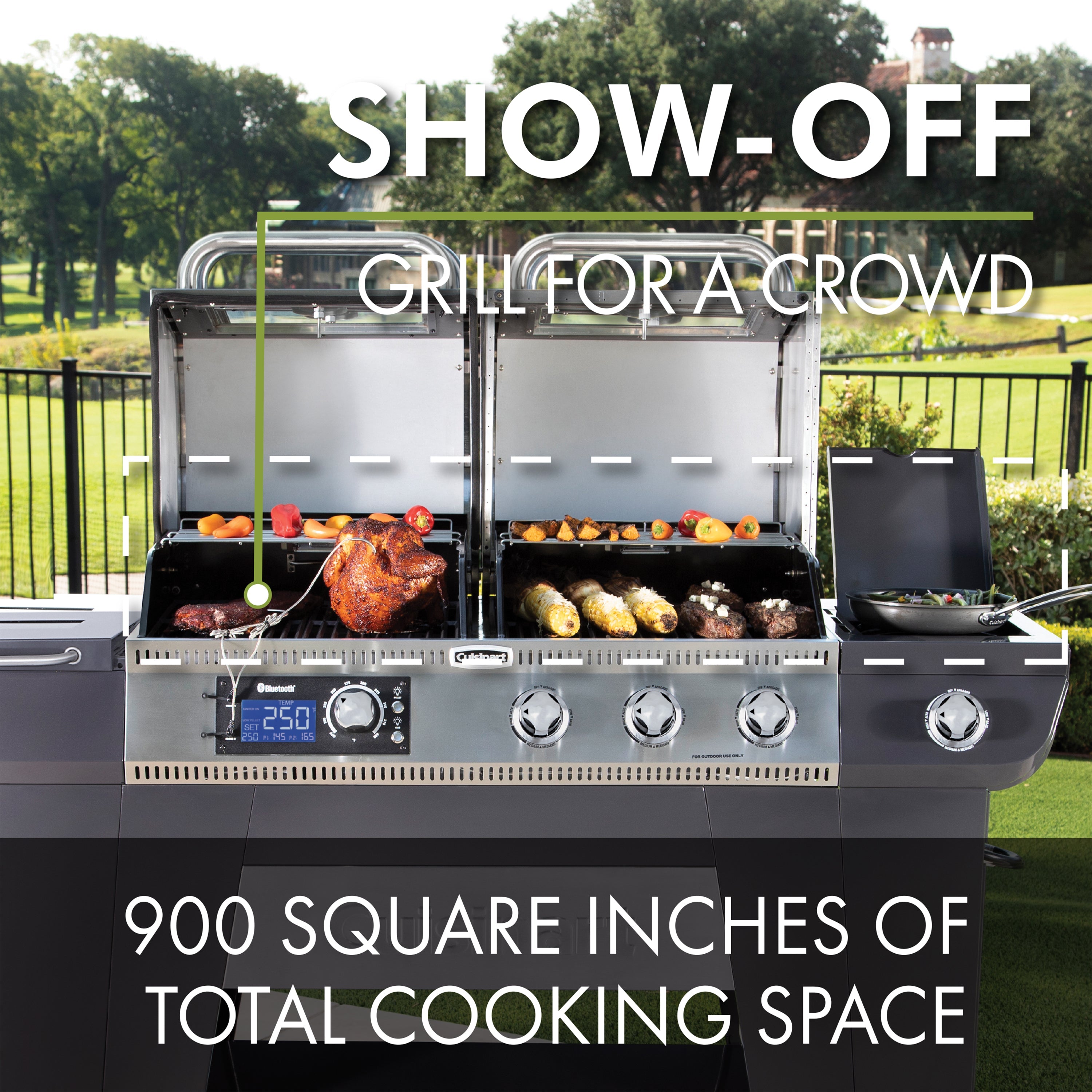 The Cuisinart® Twin Oaks Pellet and Gas Grill delivers both flavor and convenience all in one. No matter your grilling aspirations the Twin Oaks is ready to griddle the finest breakfast hash, smoke for hours with a 30-pound pellet hopper, or grilling tonight's chicken dinner. Revel in the ease of cooking with 900 square inches of cooking space that includes heavy-duty cast-iron grates. Never be in the dark about what is happening under the lid, with an appliance-grade viewing window and two ten-watt halogen lights, sit back and relax while mastering the grill. Smoke to perfection with two meat probes equipped with Bluetooth readouts on the LCD controller and the Cuisinart® Easy Connect® BBQ app. Lock in the flavor you dream of in a pellet grill with the insulated lid designed with a gasket seal that prevents smoke from escaping. We took the hassle out of cleaning with the express clean-out system that removes ash as easily as one-two-three. Whether you are smoking a brisket, grilling up some burgers, or griddling your favorite recipes the Twin Oaks does it all. Exclusively sold at Walmart.