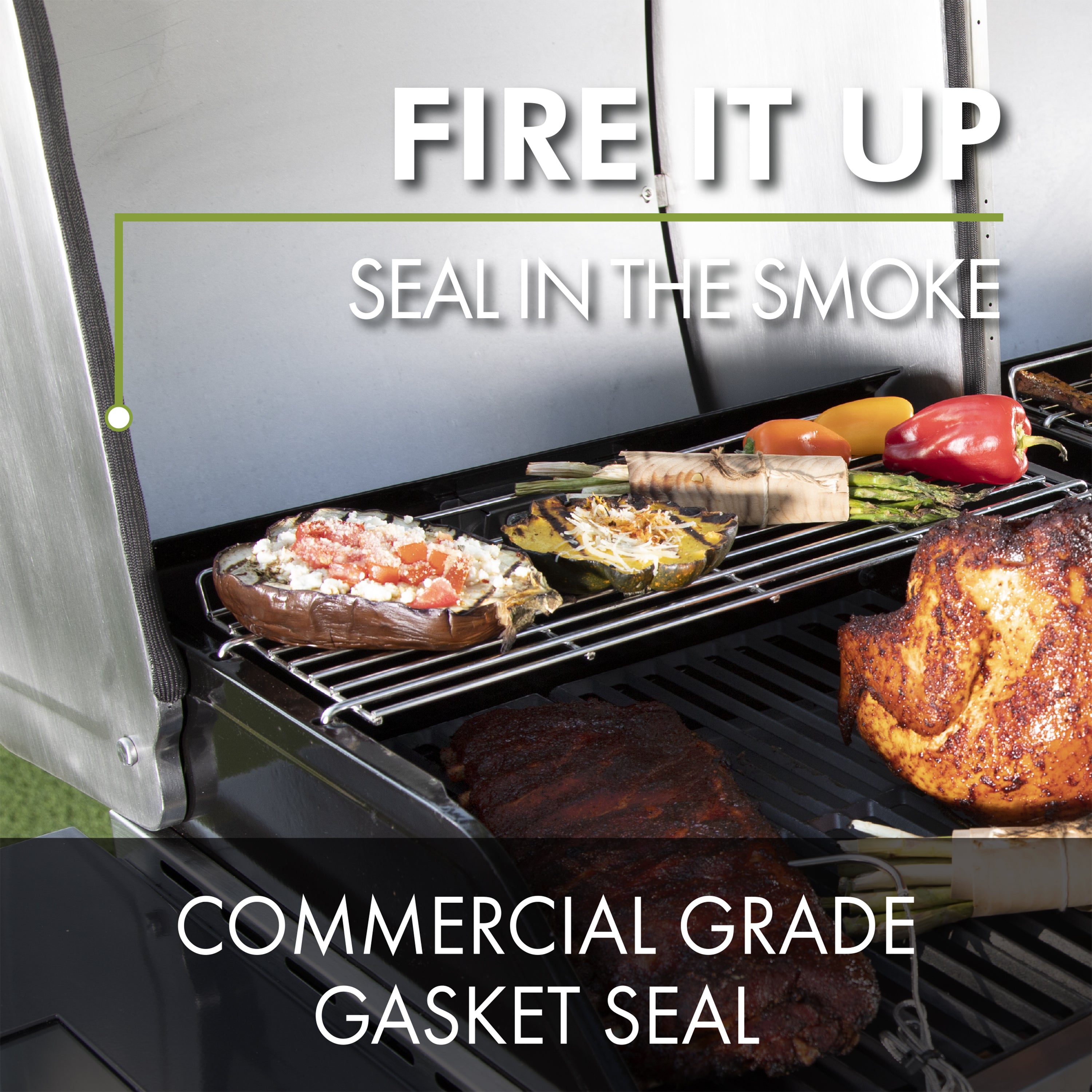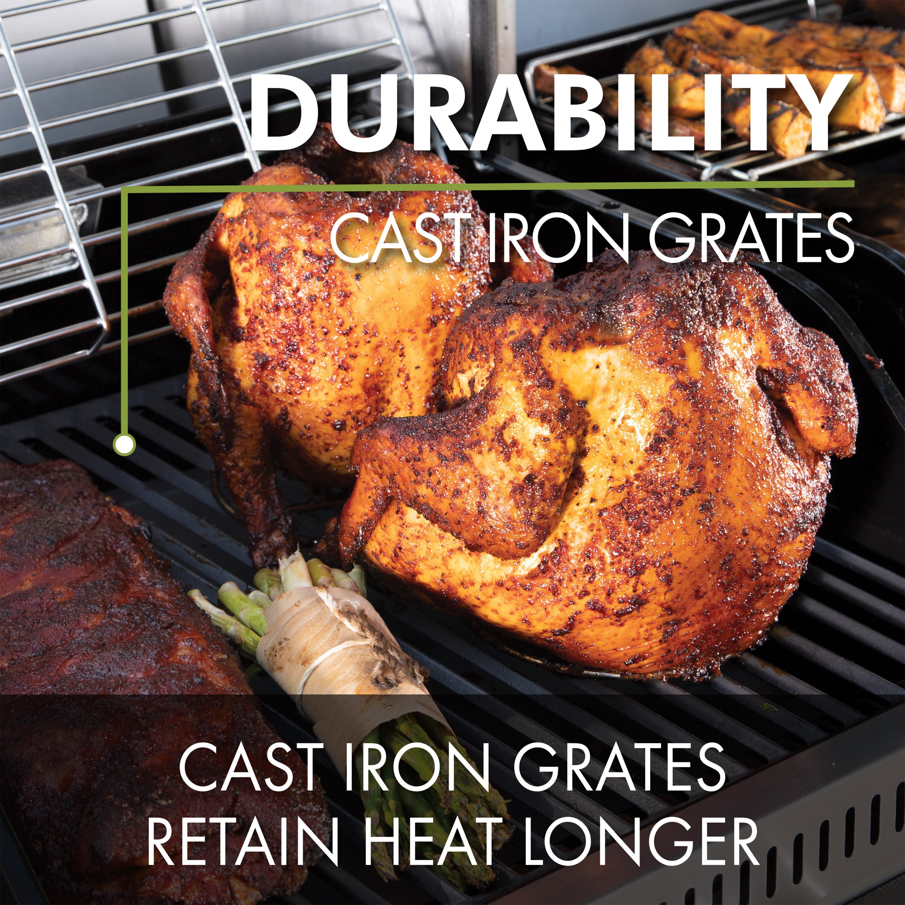 - HIGH-END FEATURES: Appliance-grade viewing window, insulated lid and firebox, two 10-watt halogen bulbs that allow you to easily see inside, commercial-grade gasket to seal in smoke, solid cast iron cooking grates, flip-up stainless steel warming rack for larger cuts of meat.
